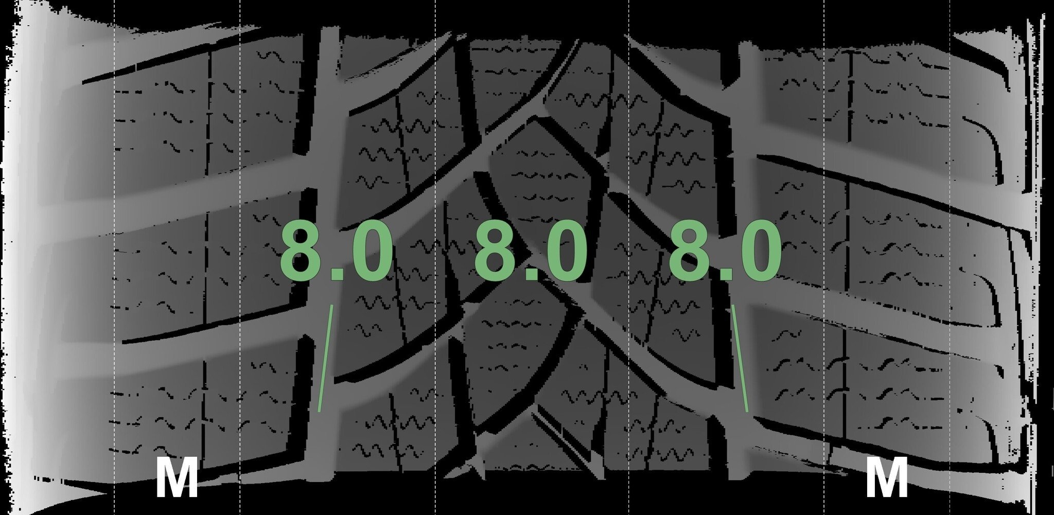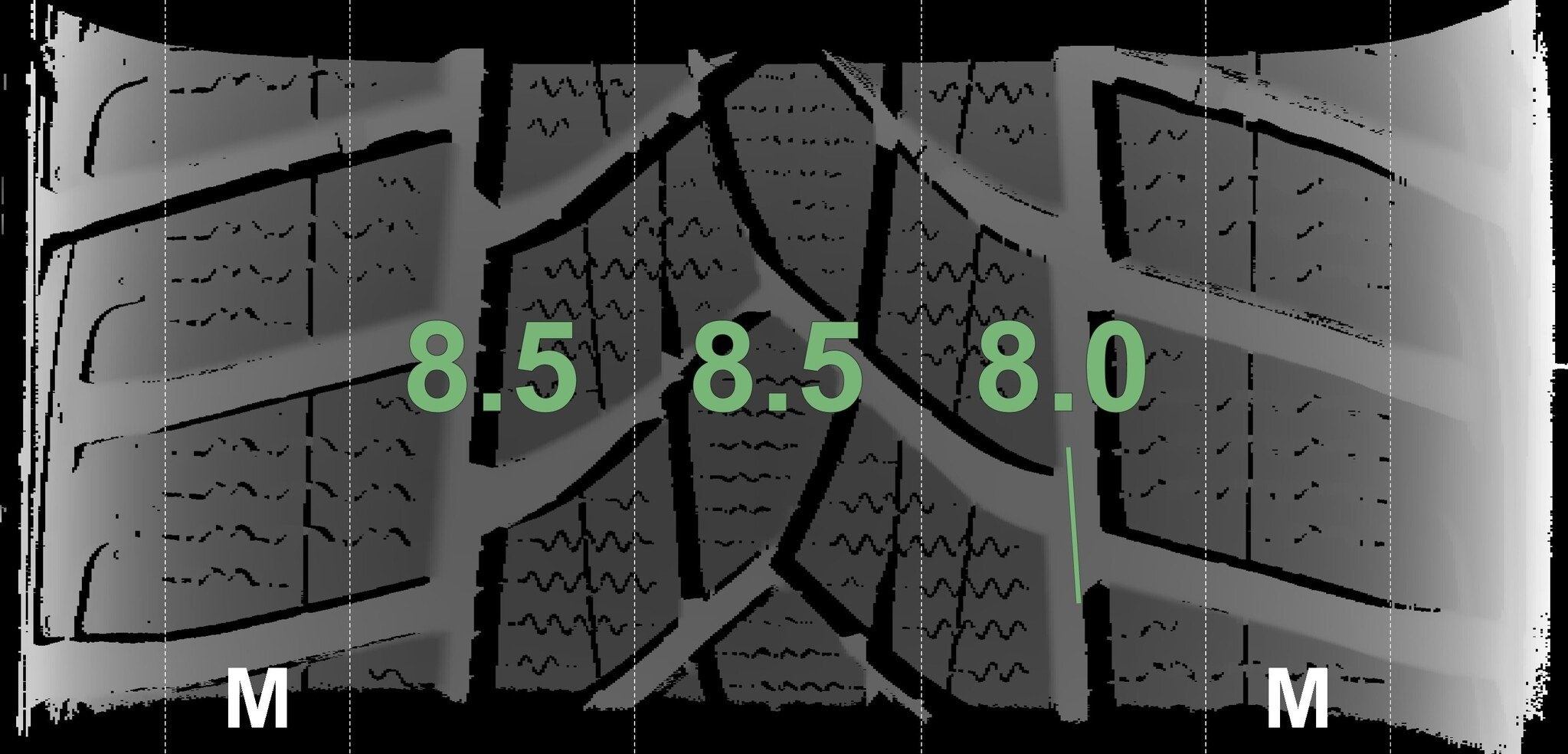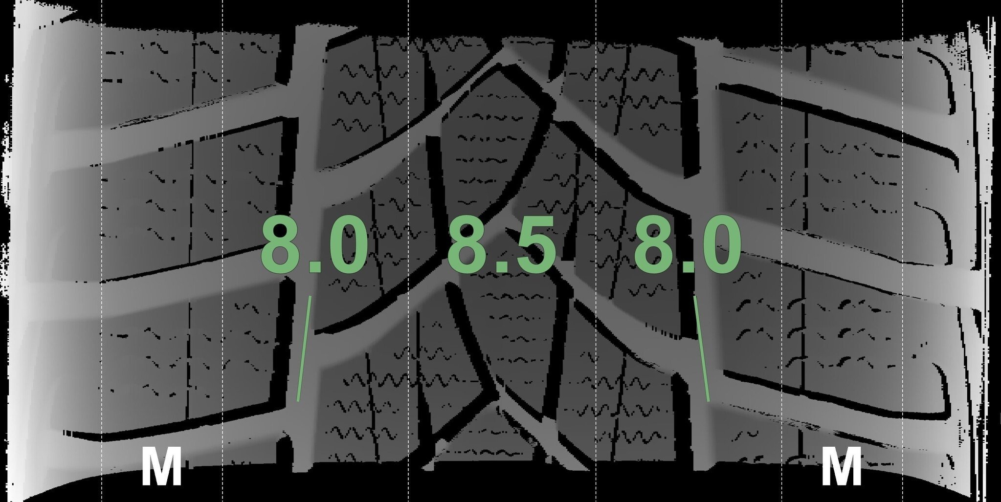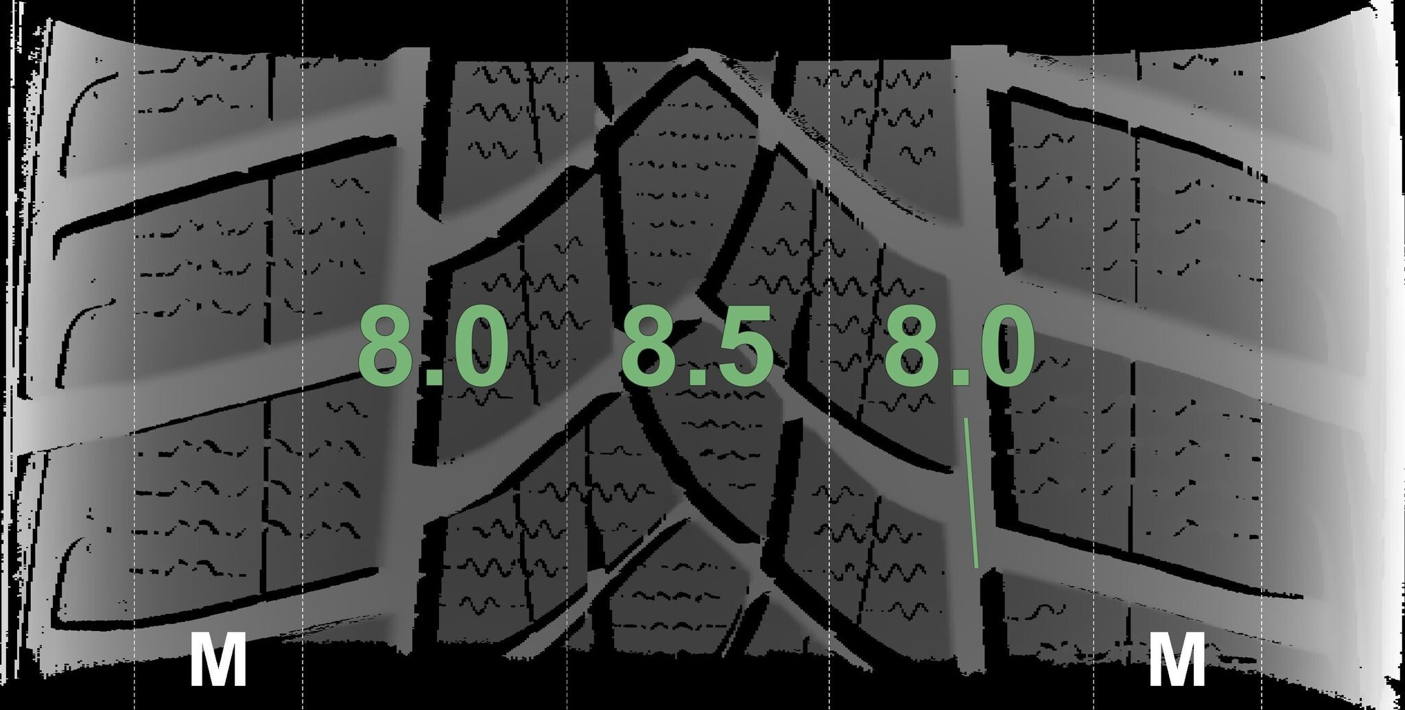 De gemeten profieldieptes en de details van de velgen zijn hierboven weergegeven.