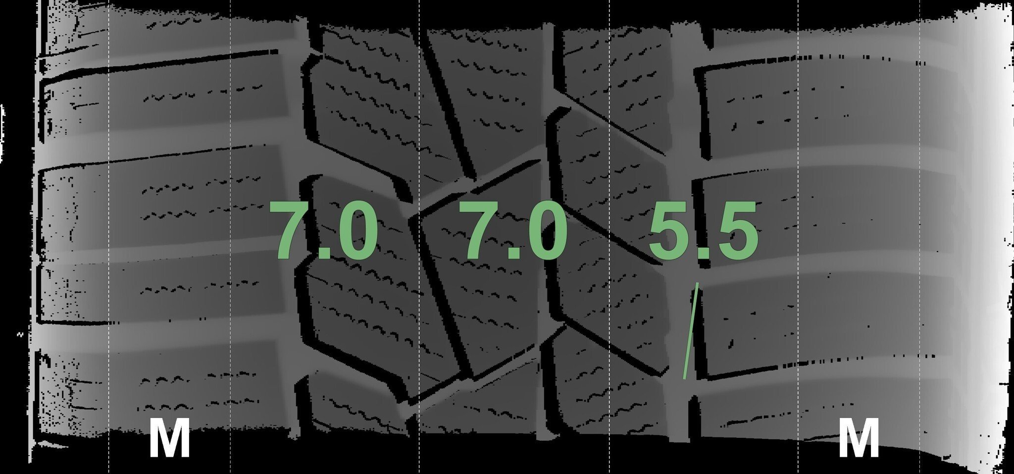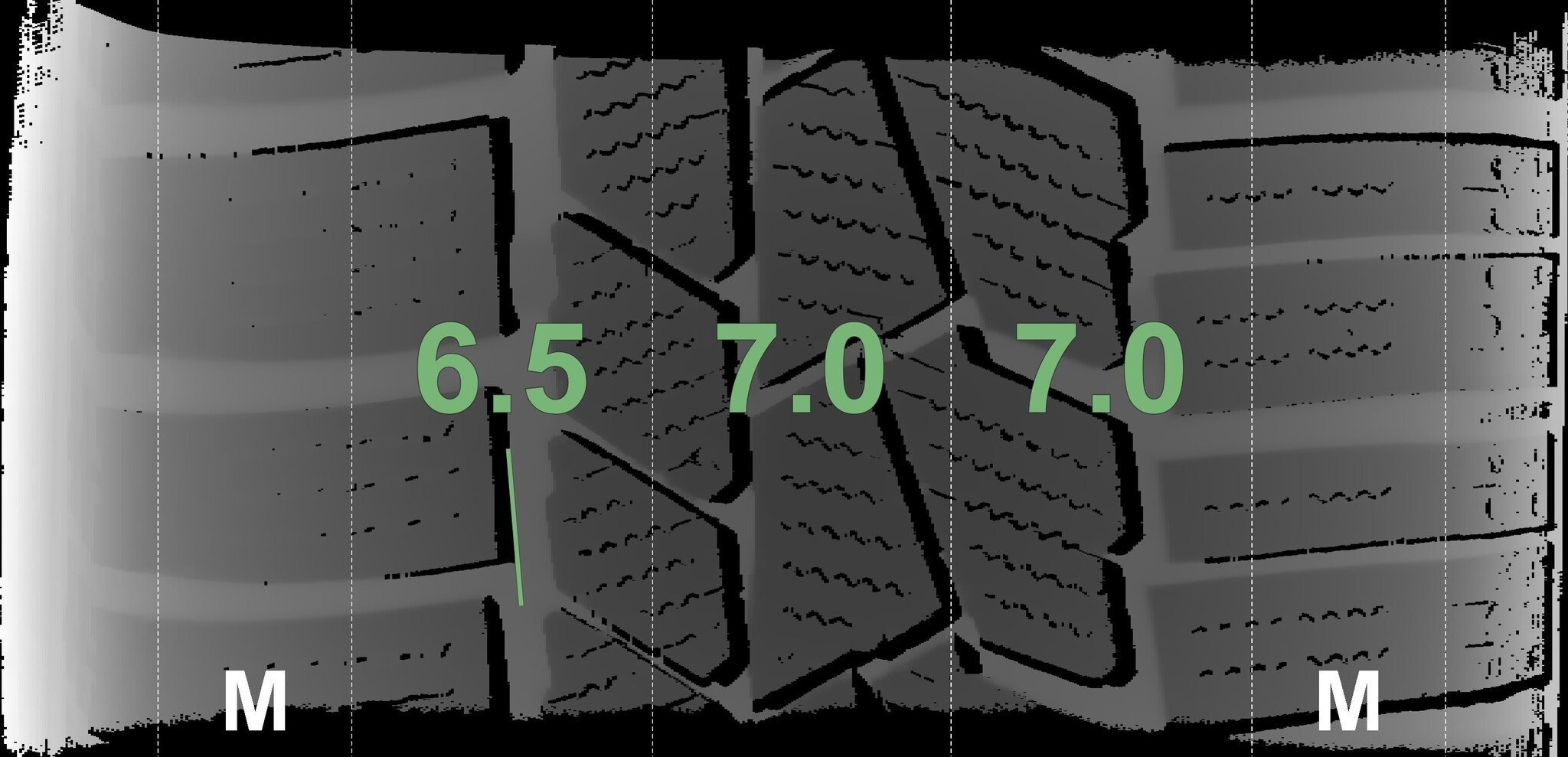 De gemeten profieldieptes en de details van de velgen zijn hierboven weergegeven.
