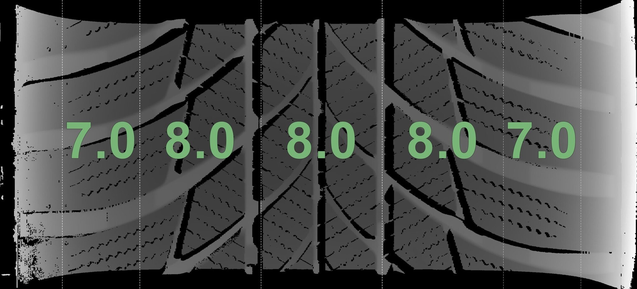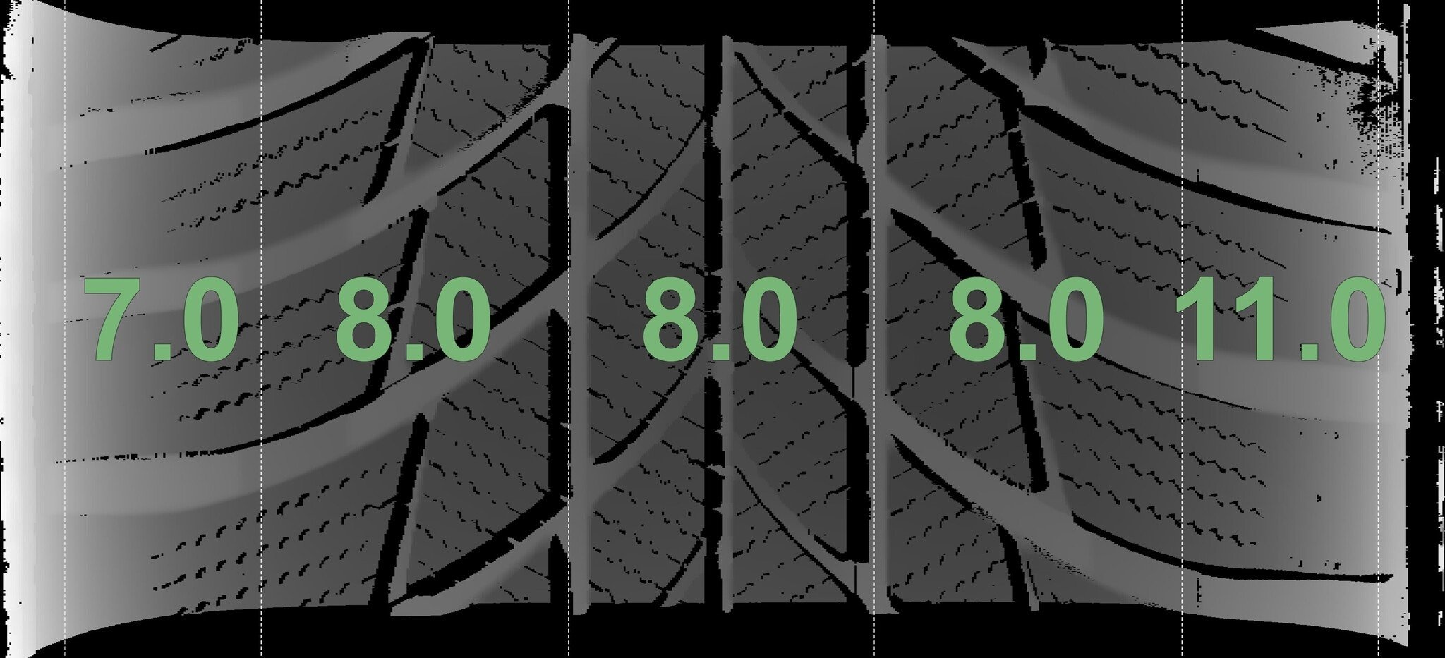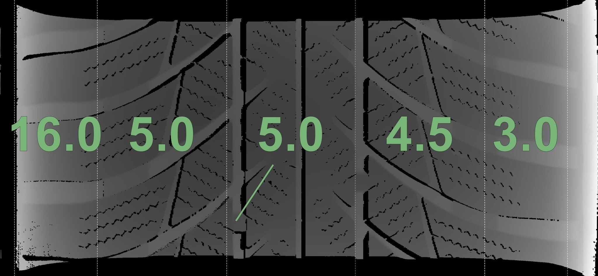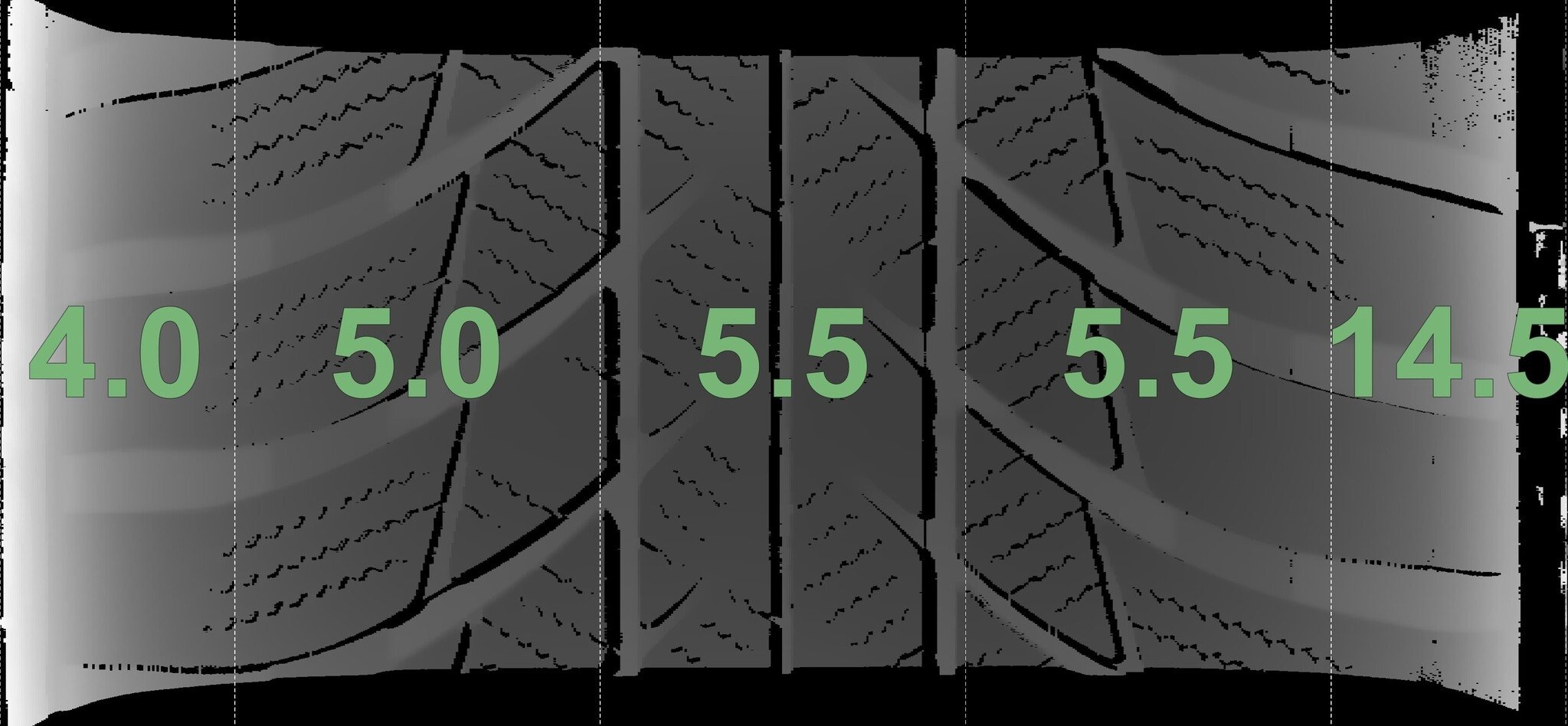 De gemeten profieldieptes en de details van de velgen zijn hierboven weergegeven.