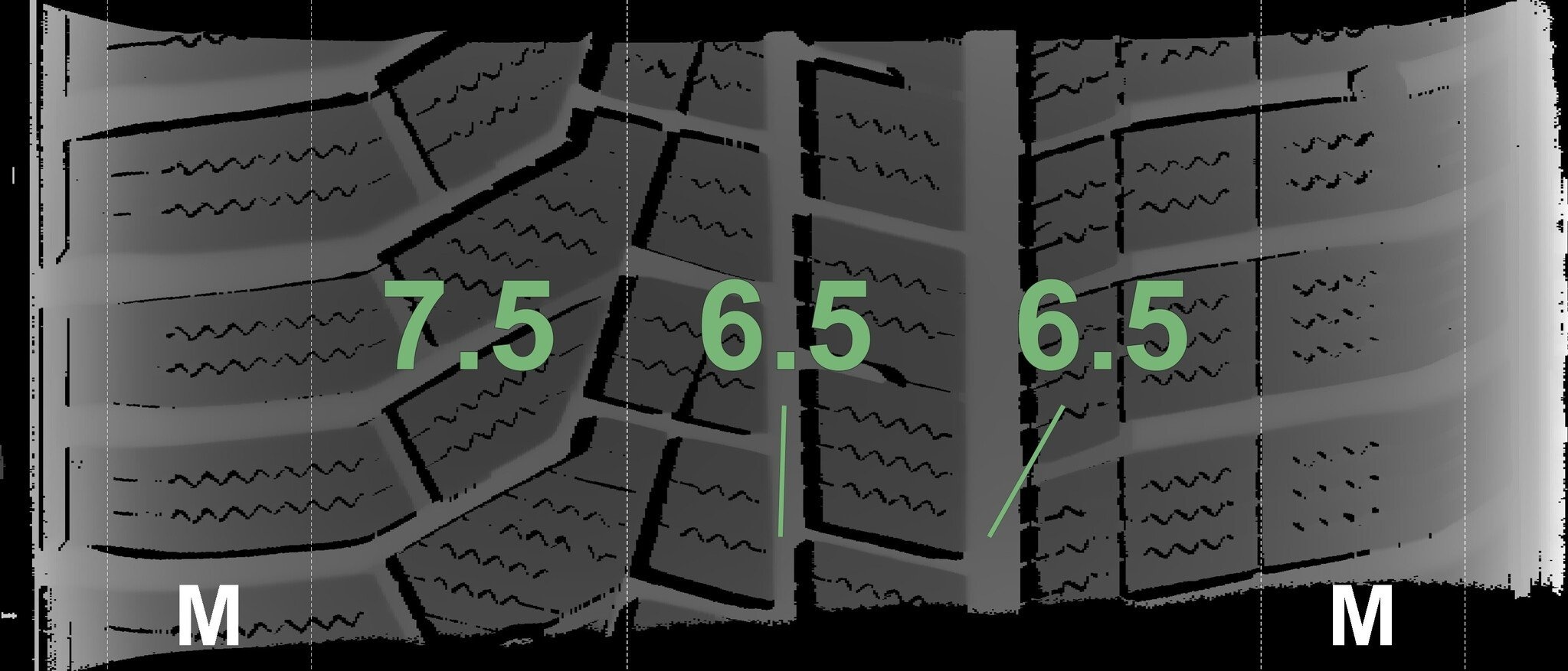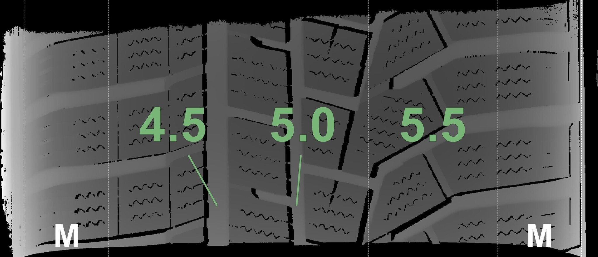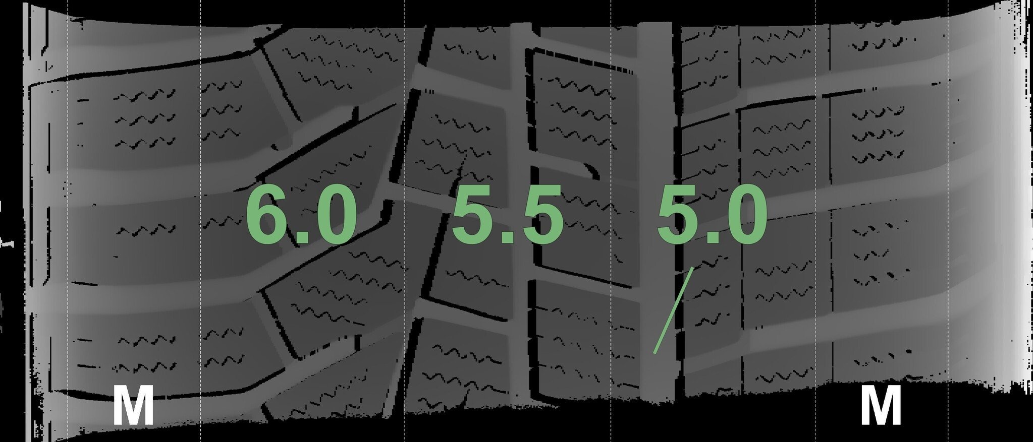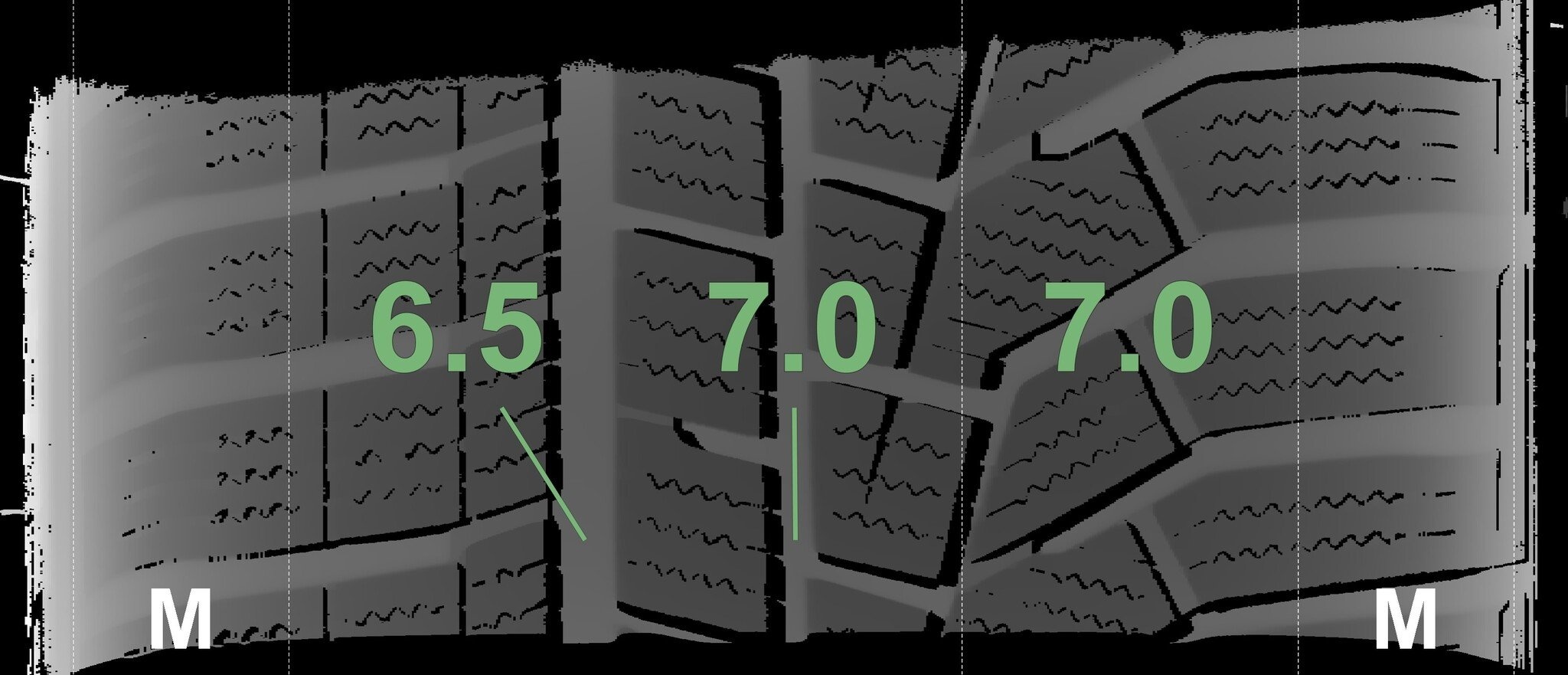 De gemeten profieldieptes en de details van de velgen zijn hierboven weergegeven.