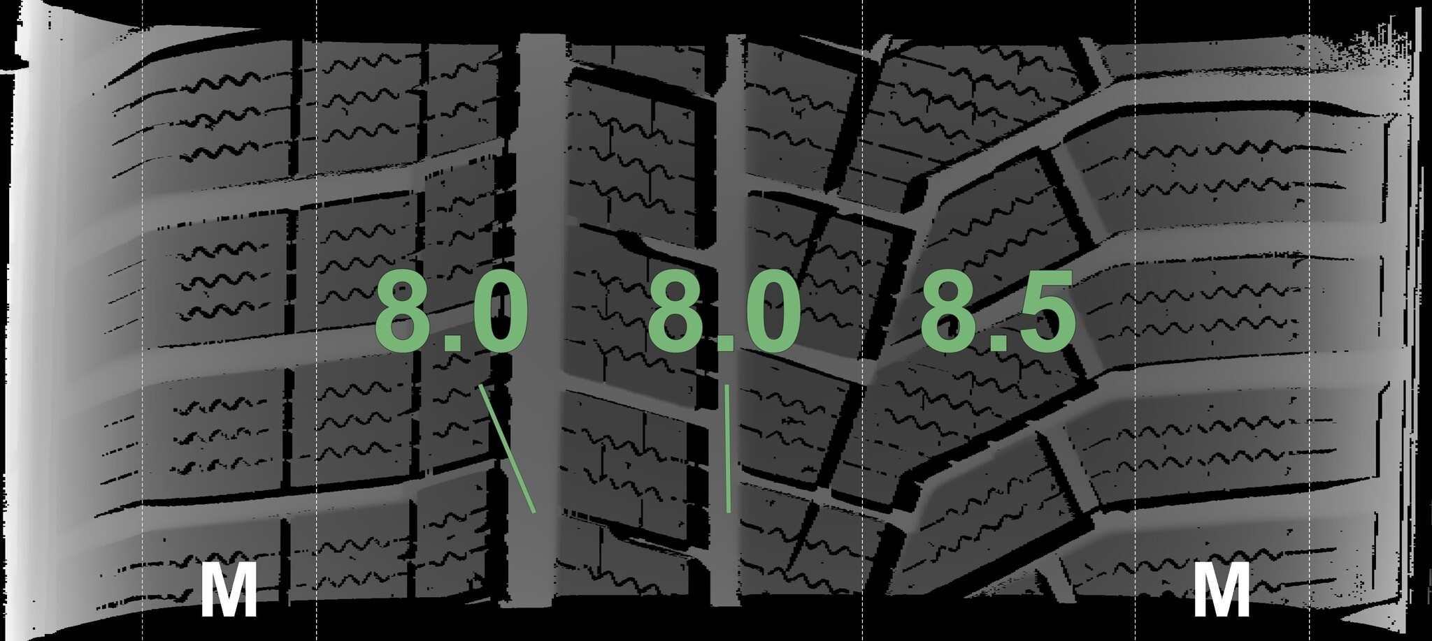 De gemeten profieldieptes en de details van de velgen zijn hierboven weergegeven.