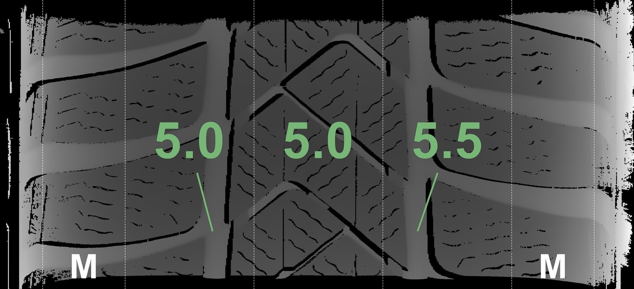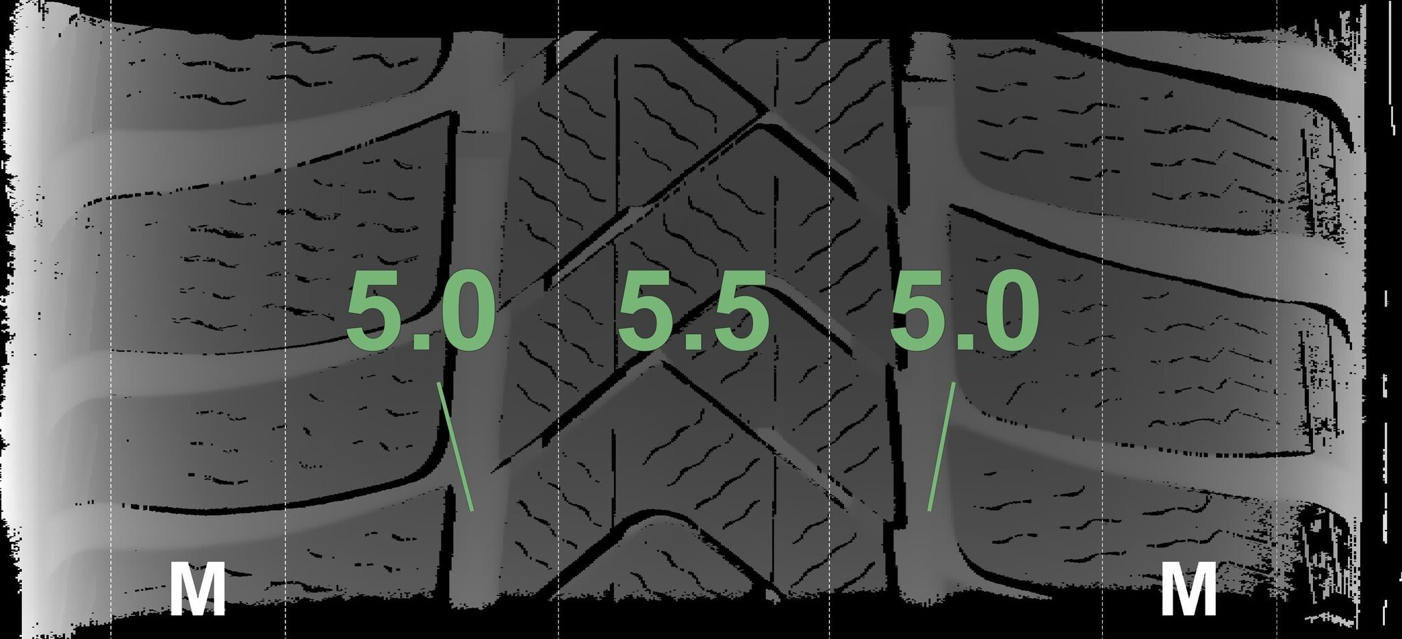 De gemeten profieldieptes en de details van de velgen zijn hierboven weergegeven.