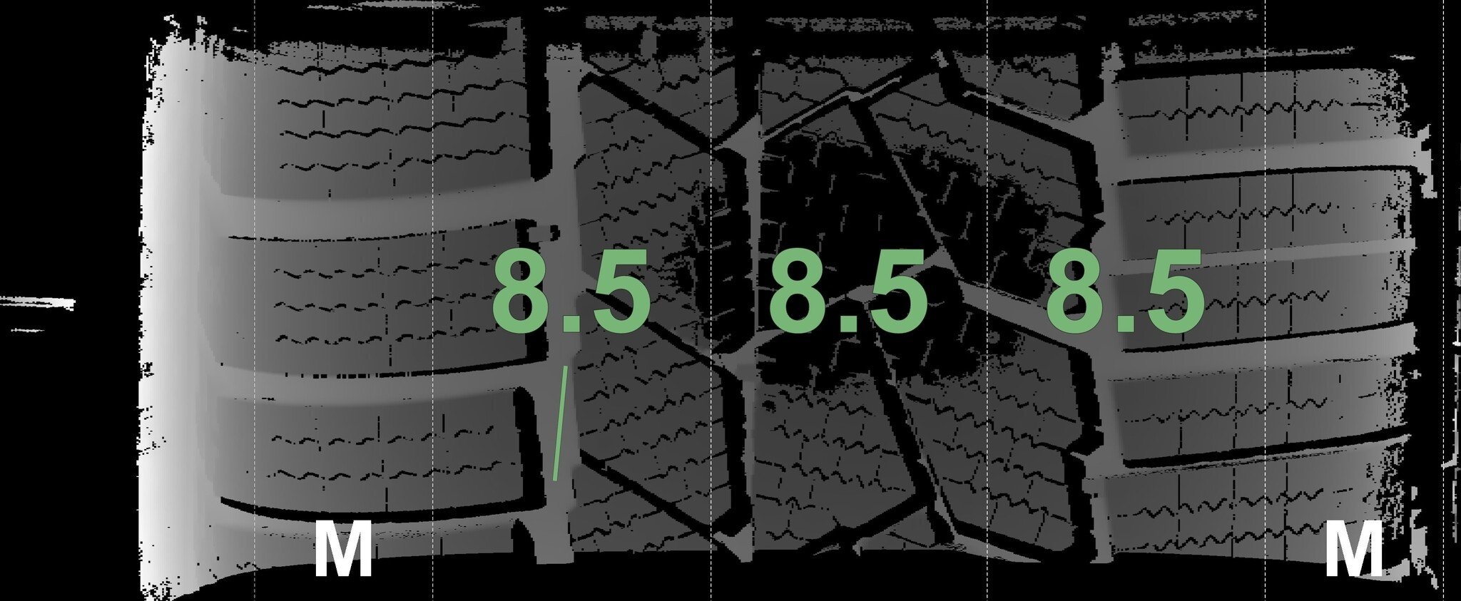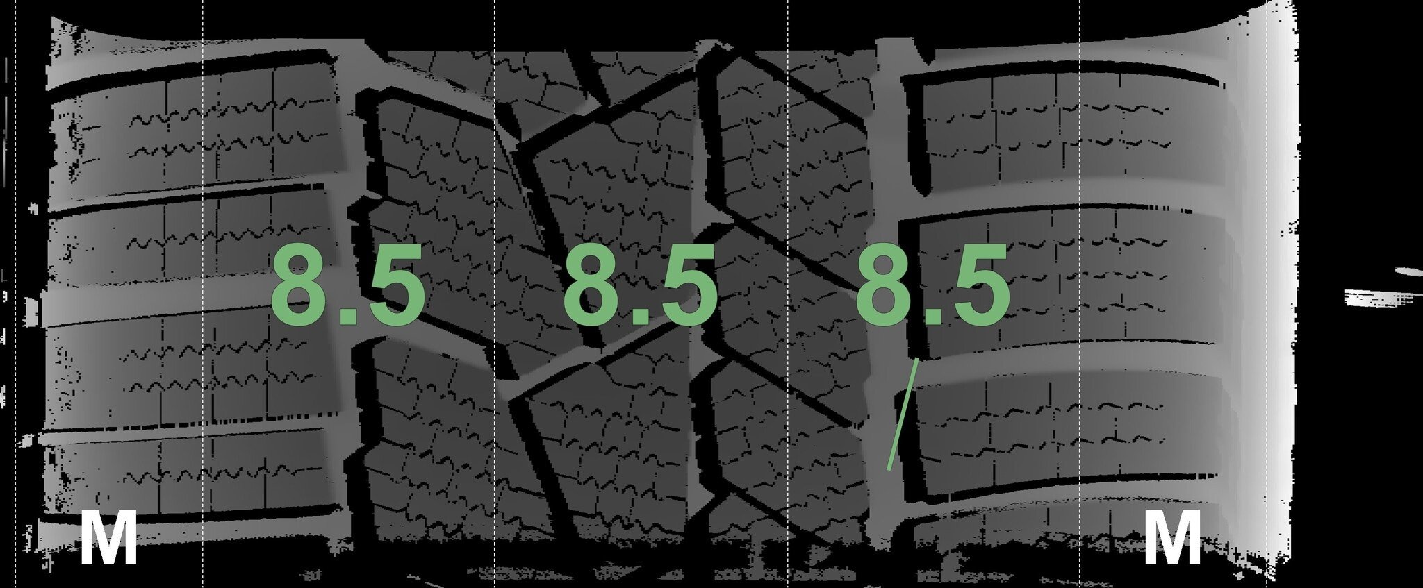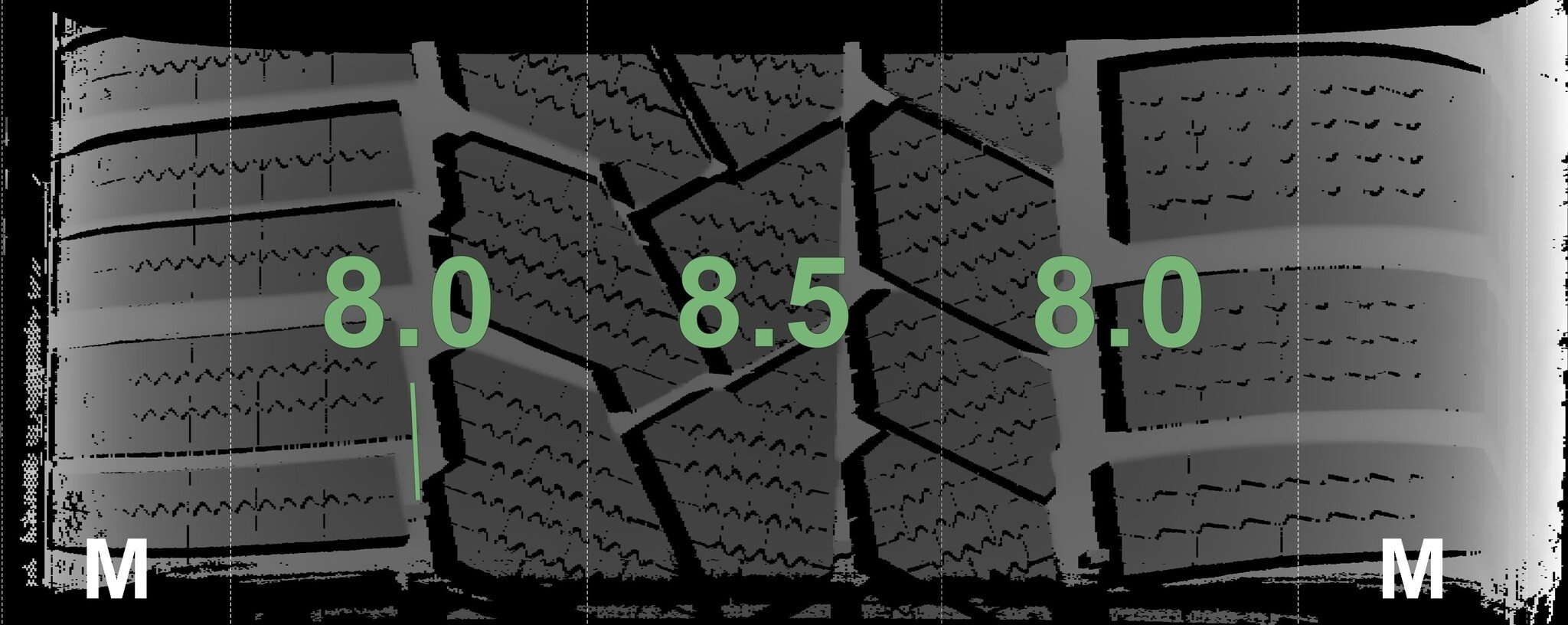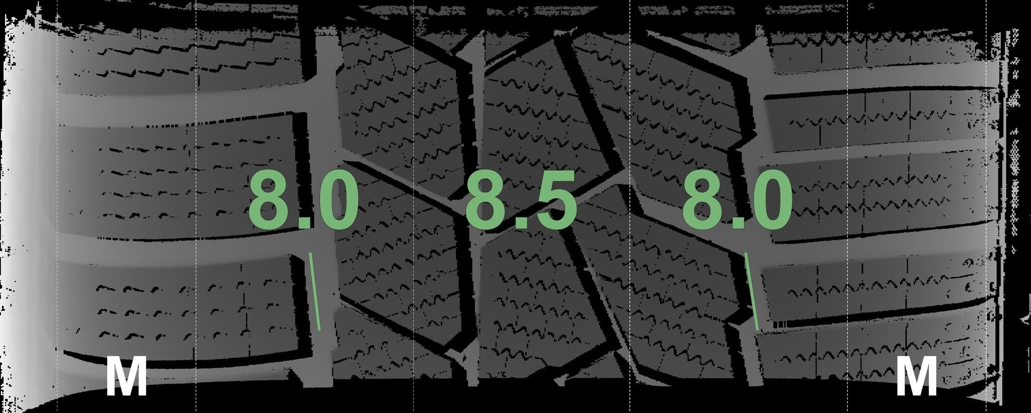 De gemeten profieldieptes en de details van de velgen zijn hierboven weergegeven.
