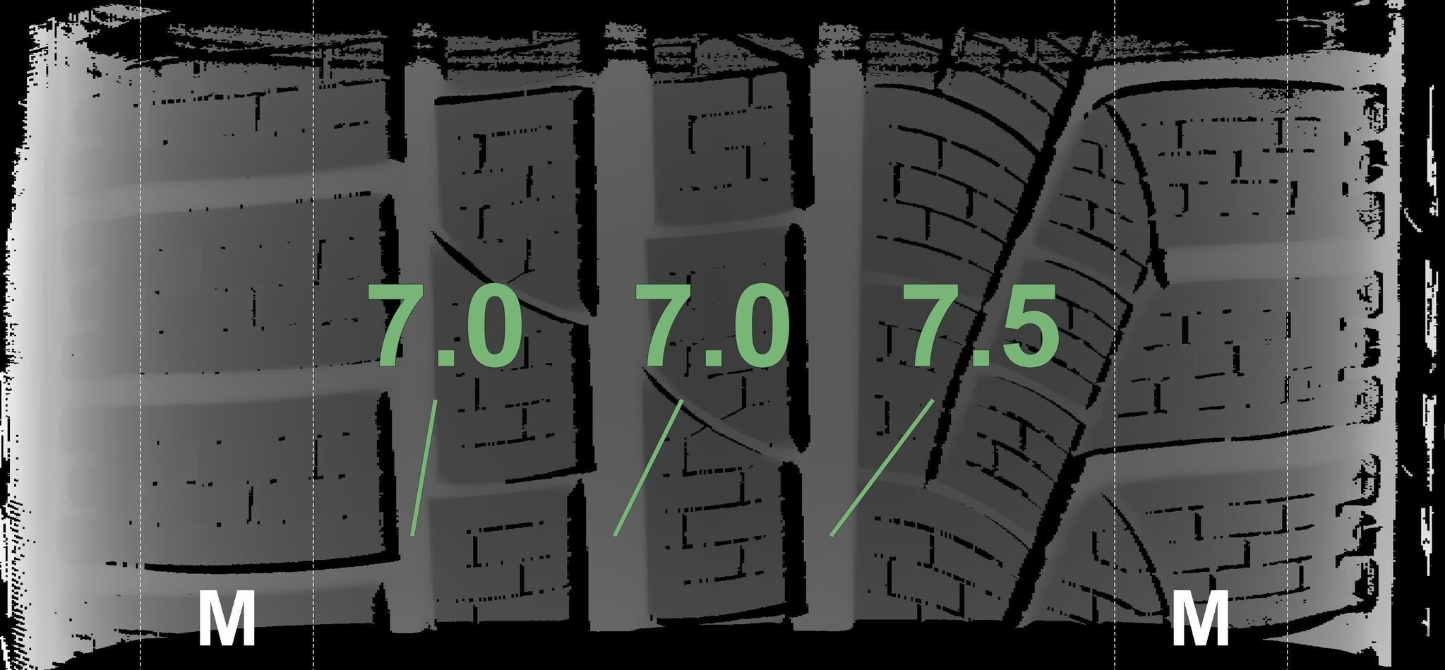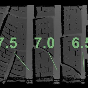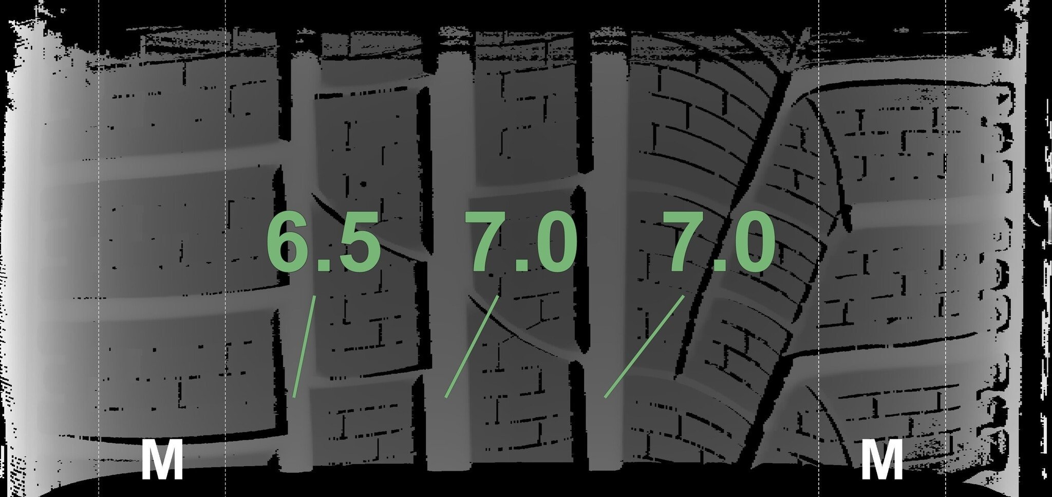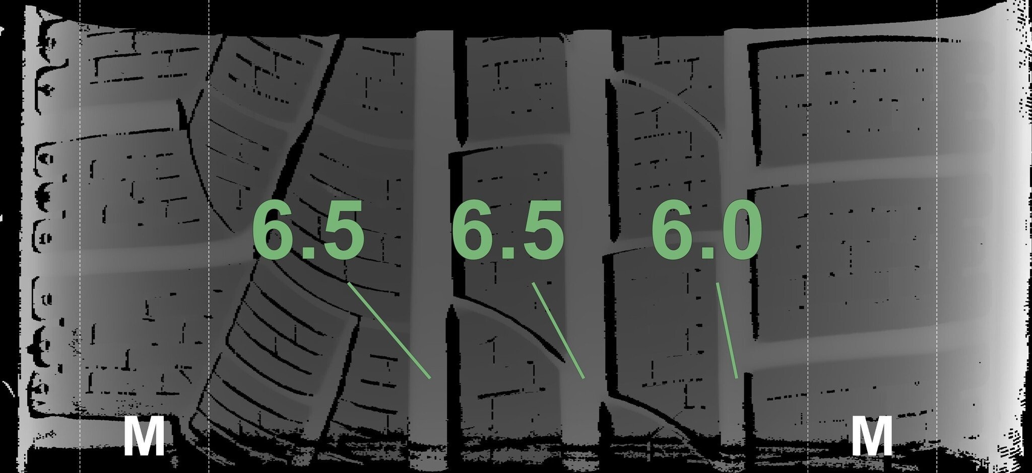 De gemeten profieldieptes en de details van de velgen zijn hierboven weergegeven.