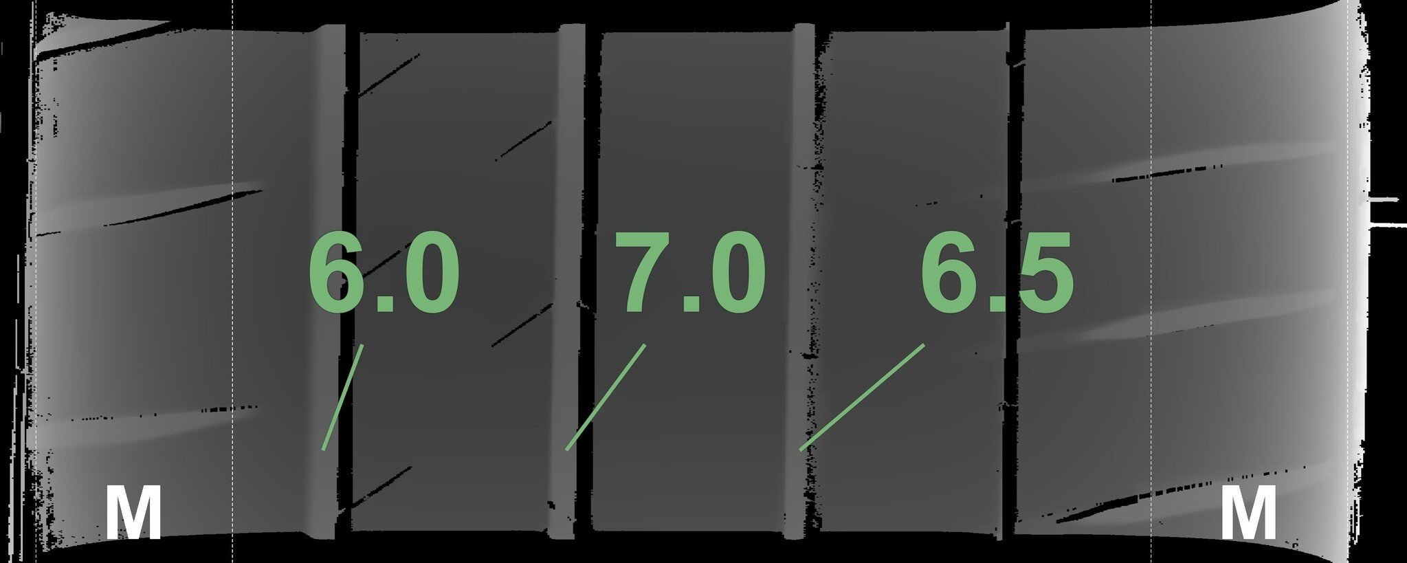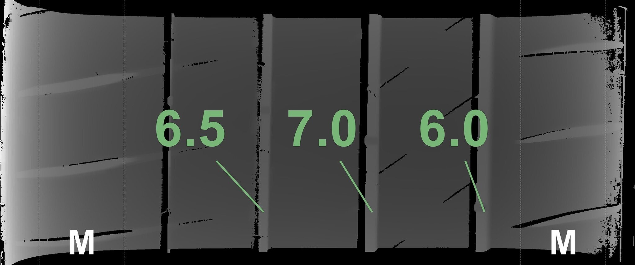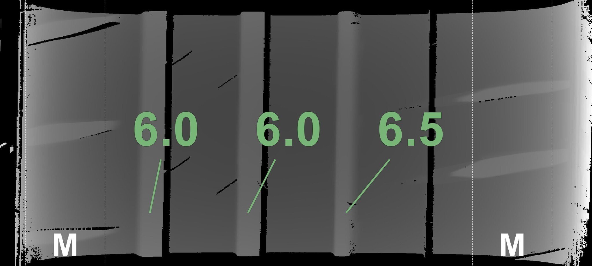 De gemeten profieldieptes en de details van de velgen zijn hierboven weergegeven.