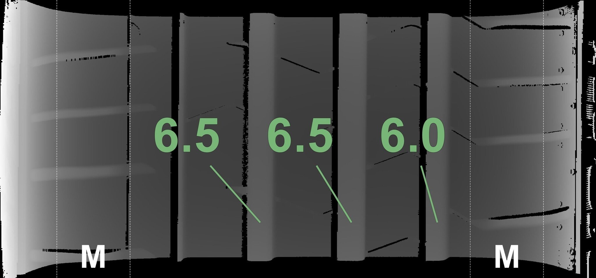 De gemeten profieldieptes en de details van de velgen zijn hierboven weergegeven.