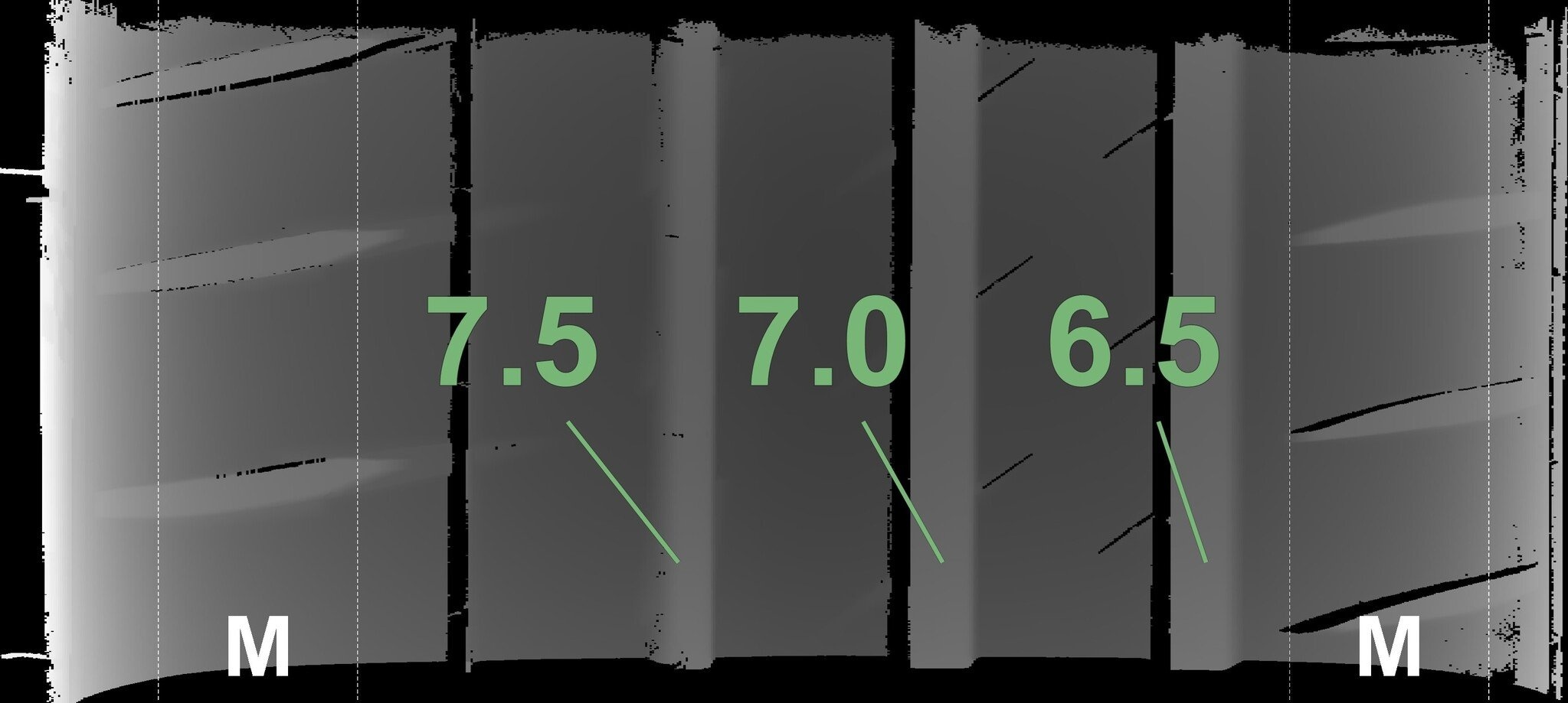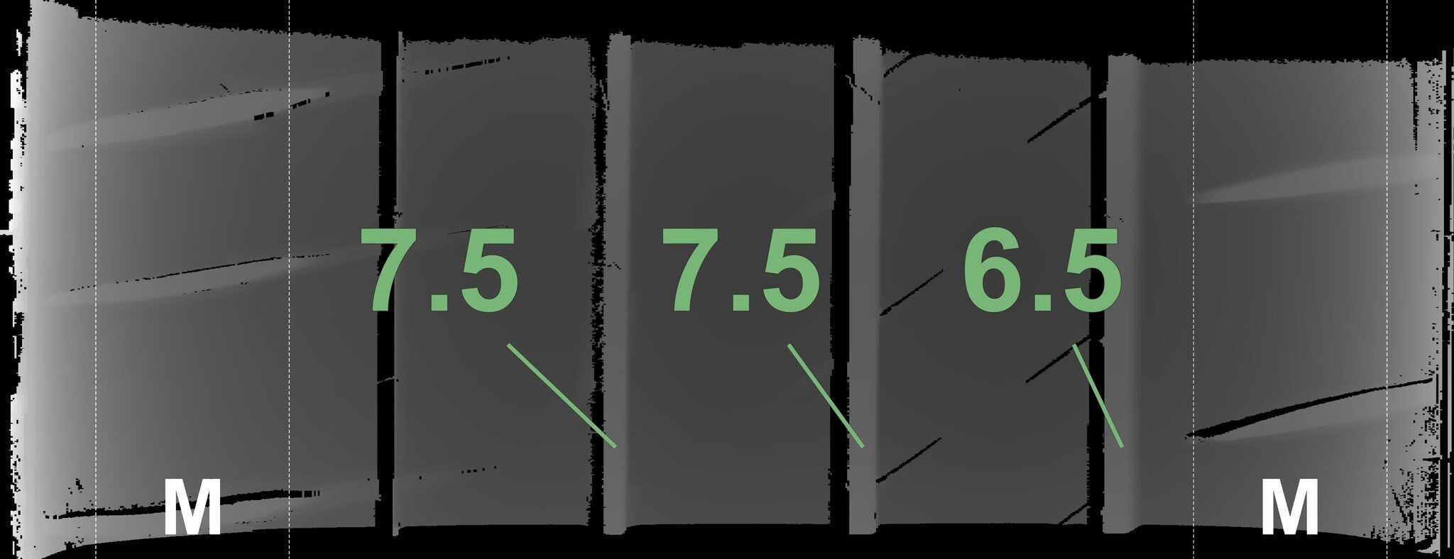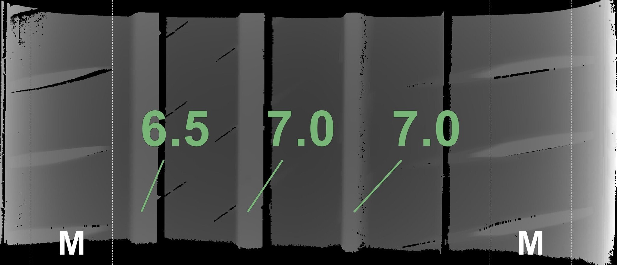 De gemeten profieldieptes en de details van de velgen zijn hierboven weergegeven.