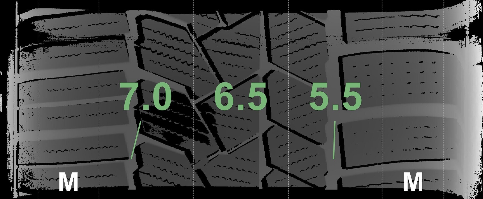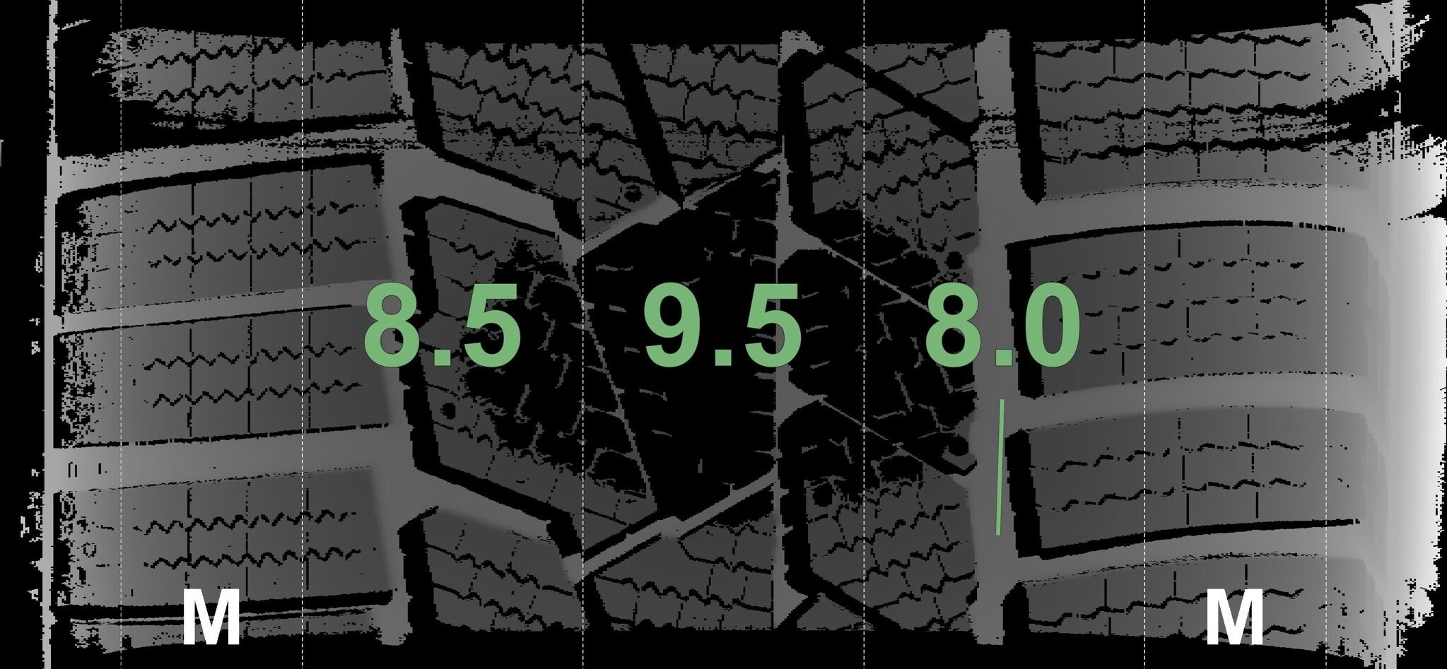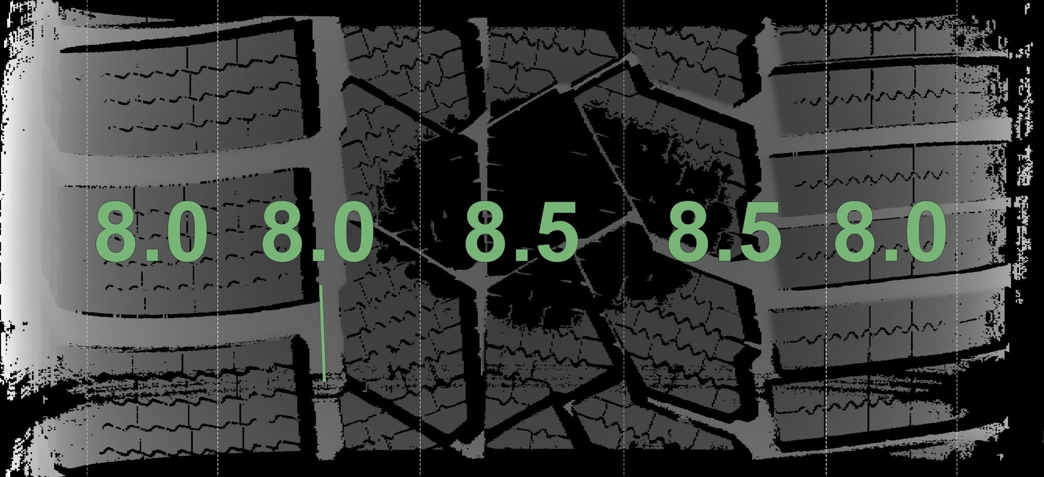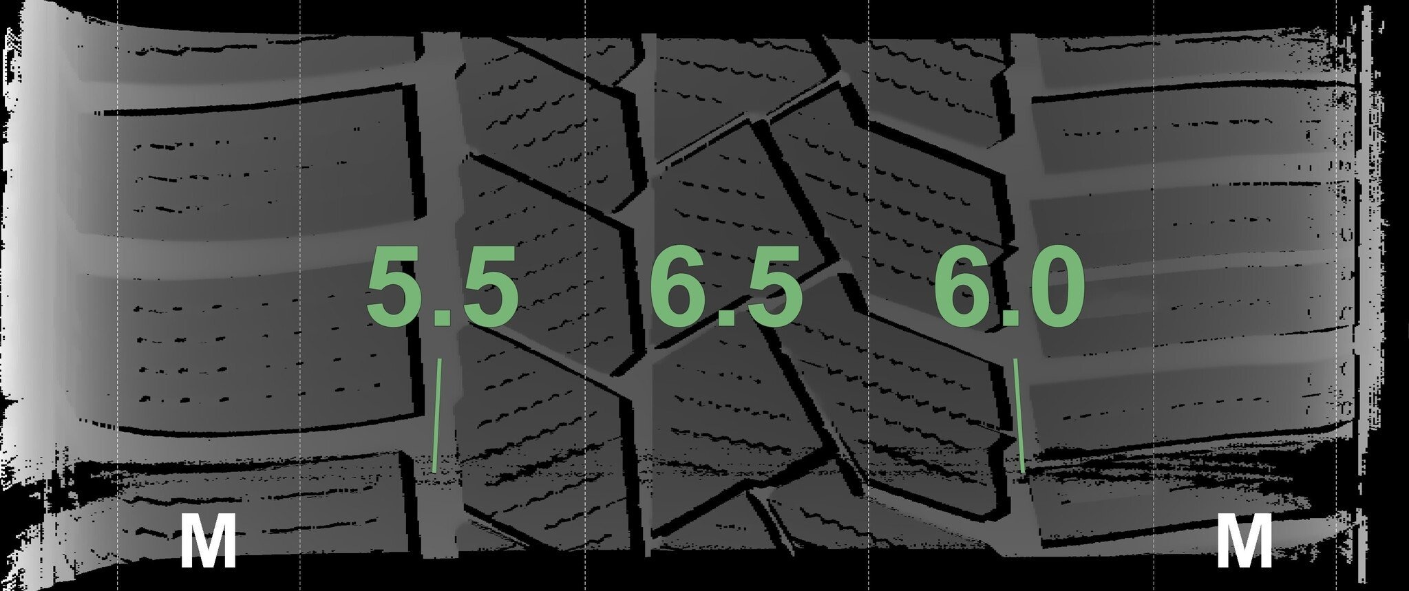 De gemeten profieldieptes en de details van de velgen zijn hierboven weergegeven.