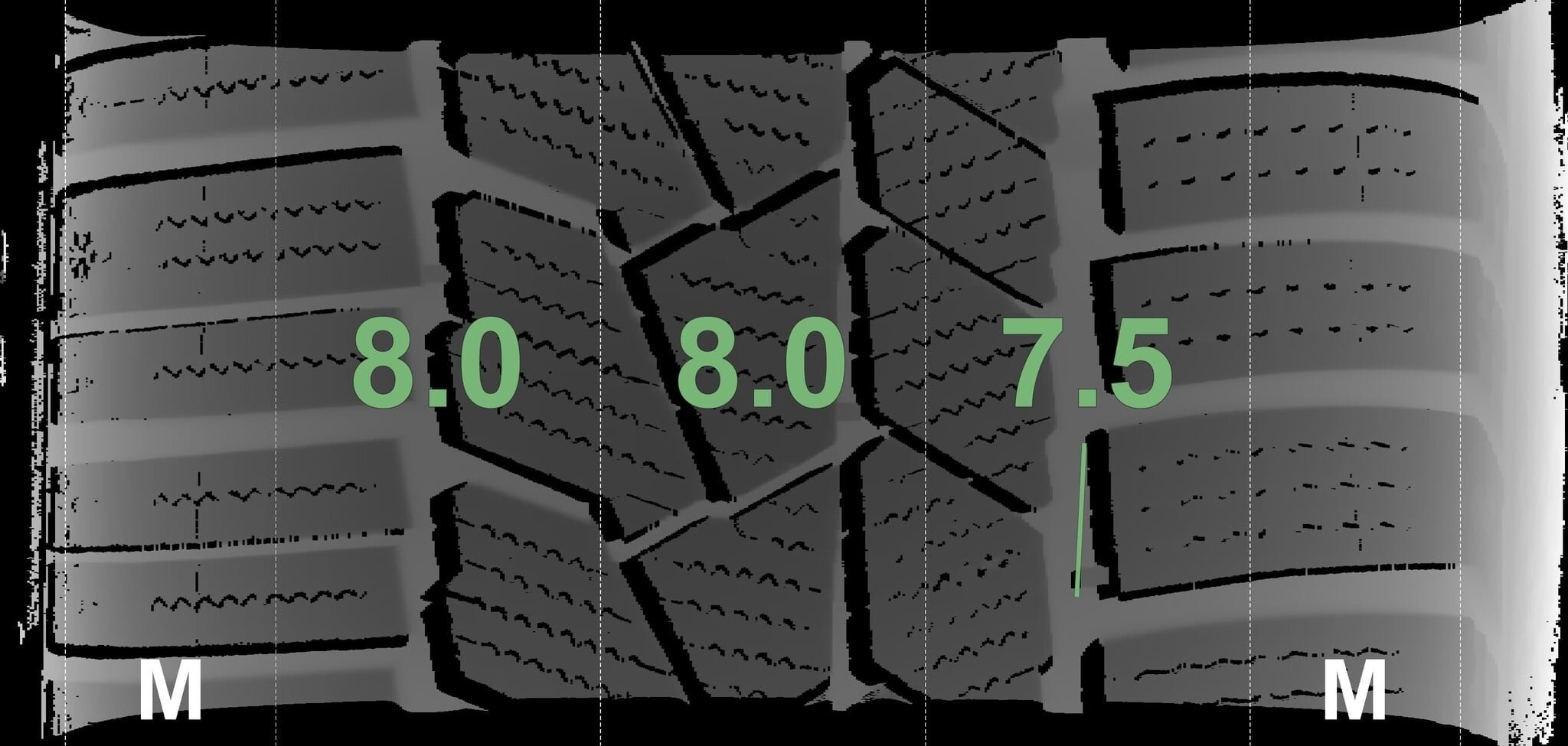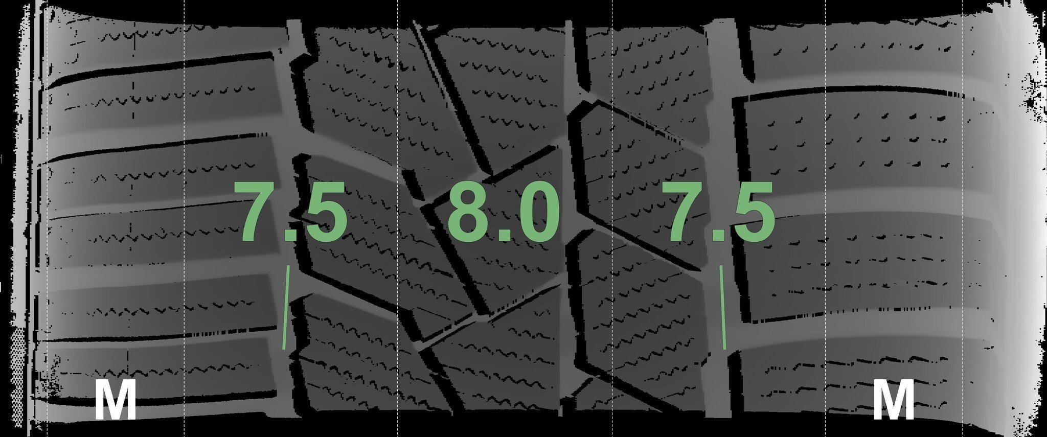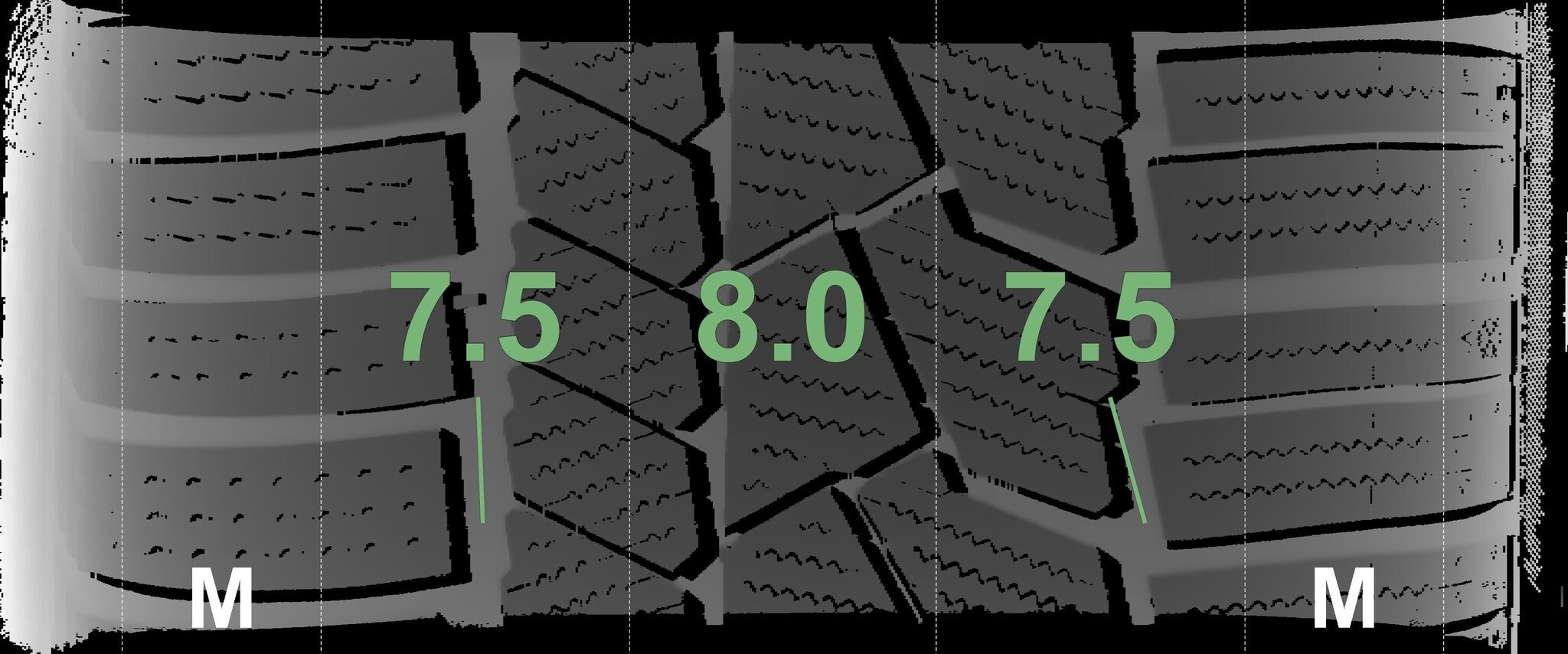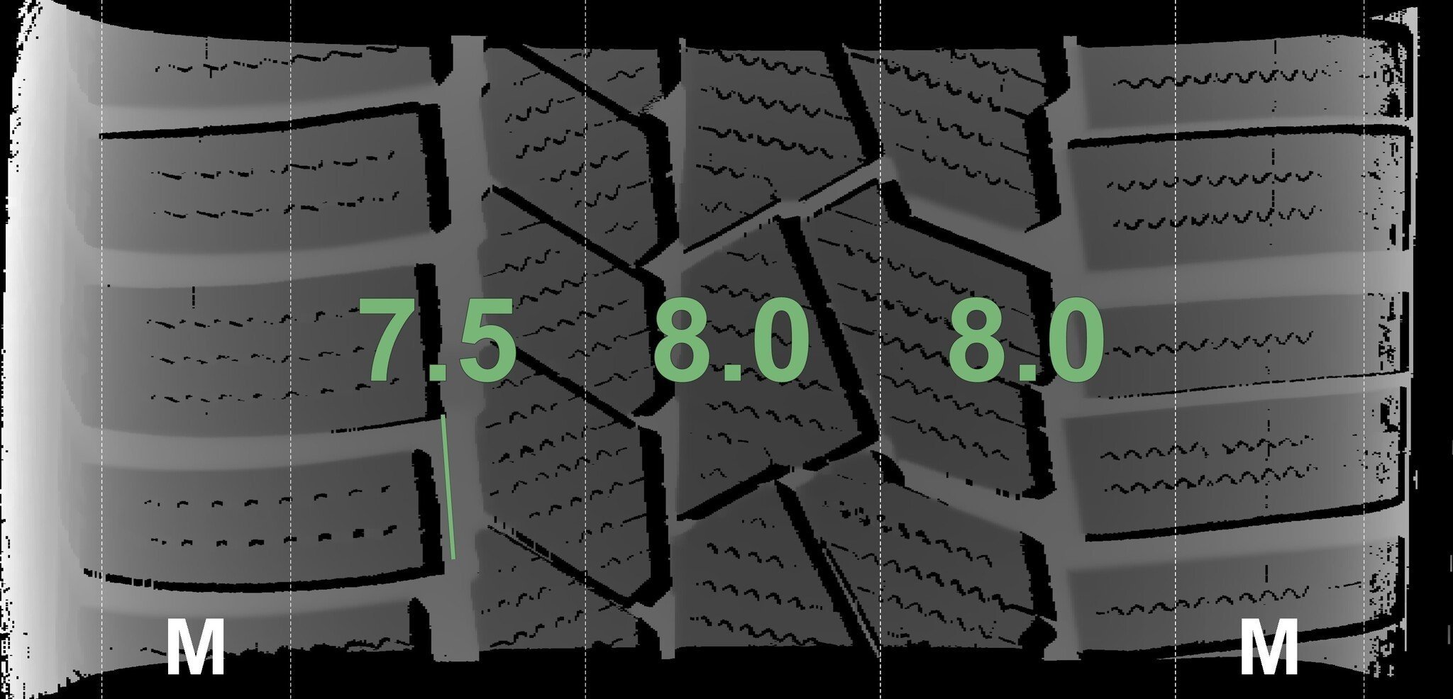 De gemeten profieldieptes en de details van de velgen zijn hierboven weergegeven.