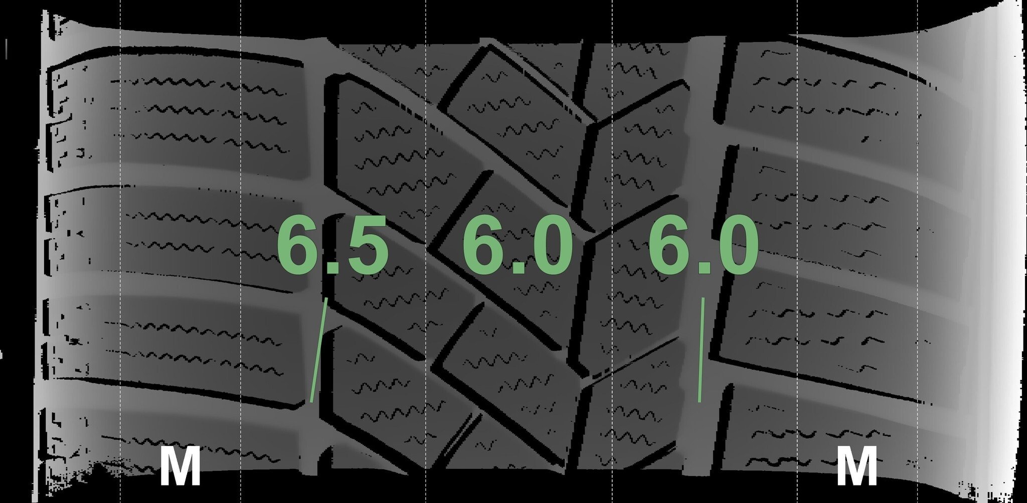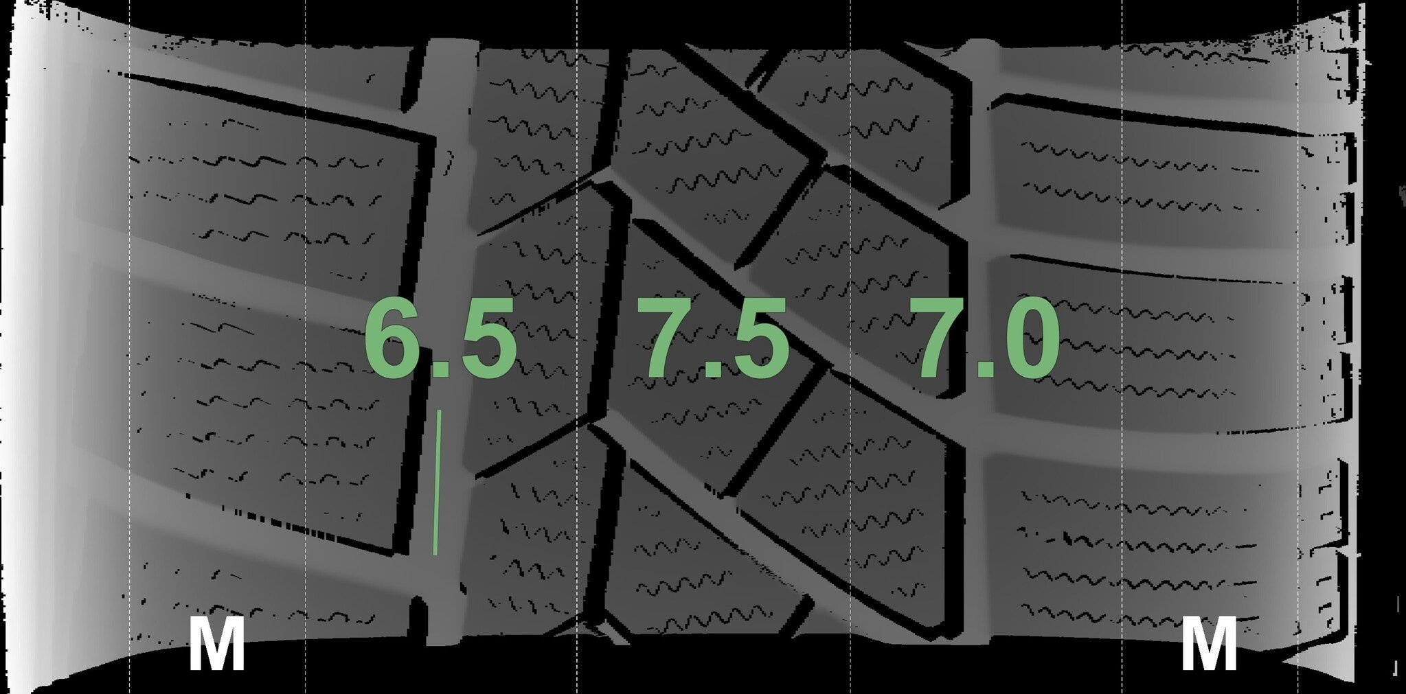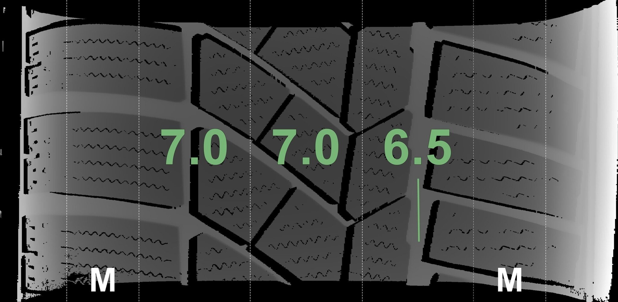 De gemeten profieldieptes en de details van de velgen zijn hierboven weergegeven.