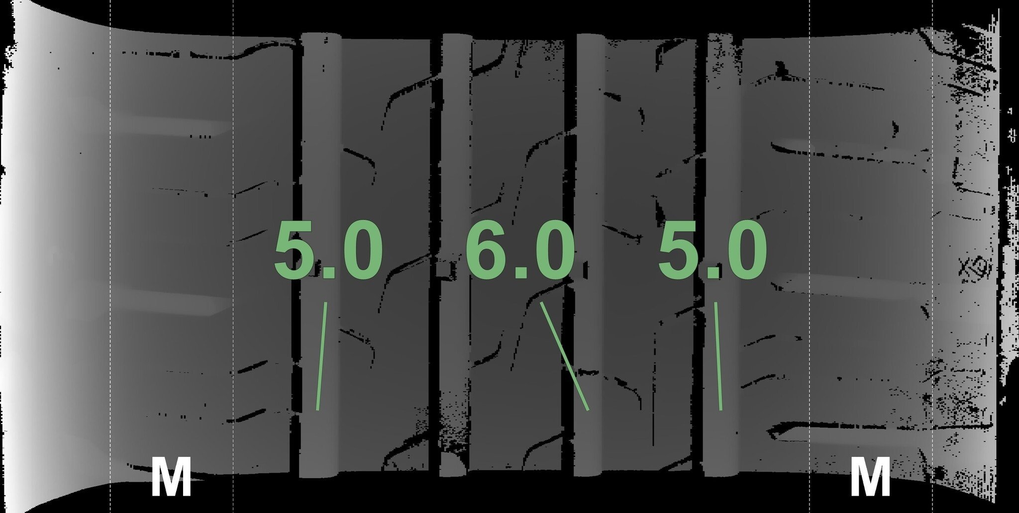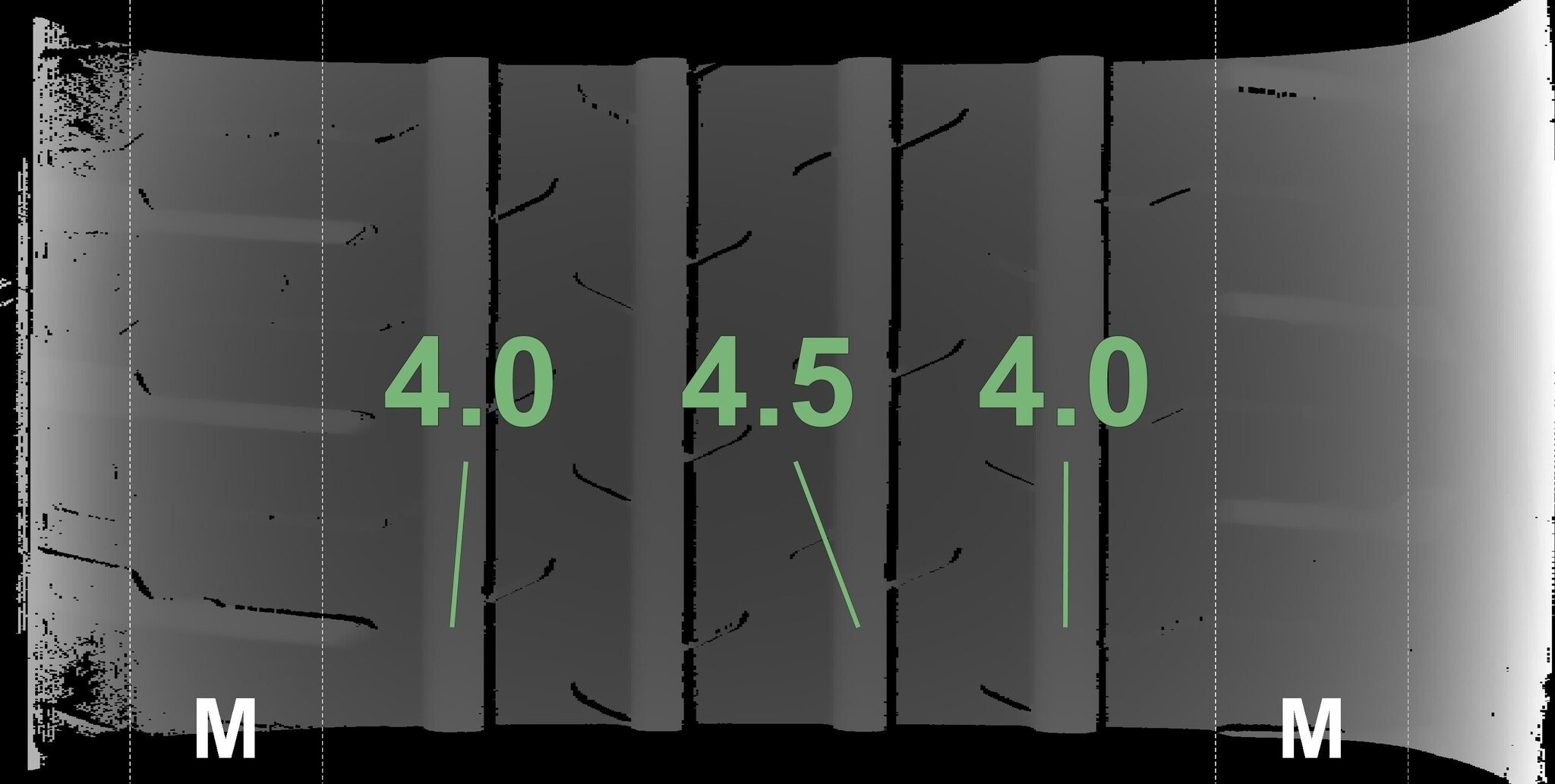 De gemeten profieldieptes en de details van de velgen zijn hierboven weergegeven.