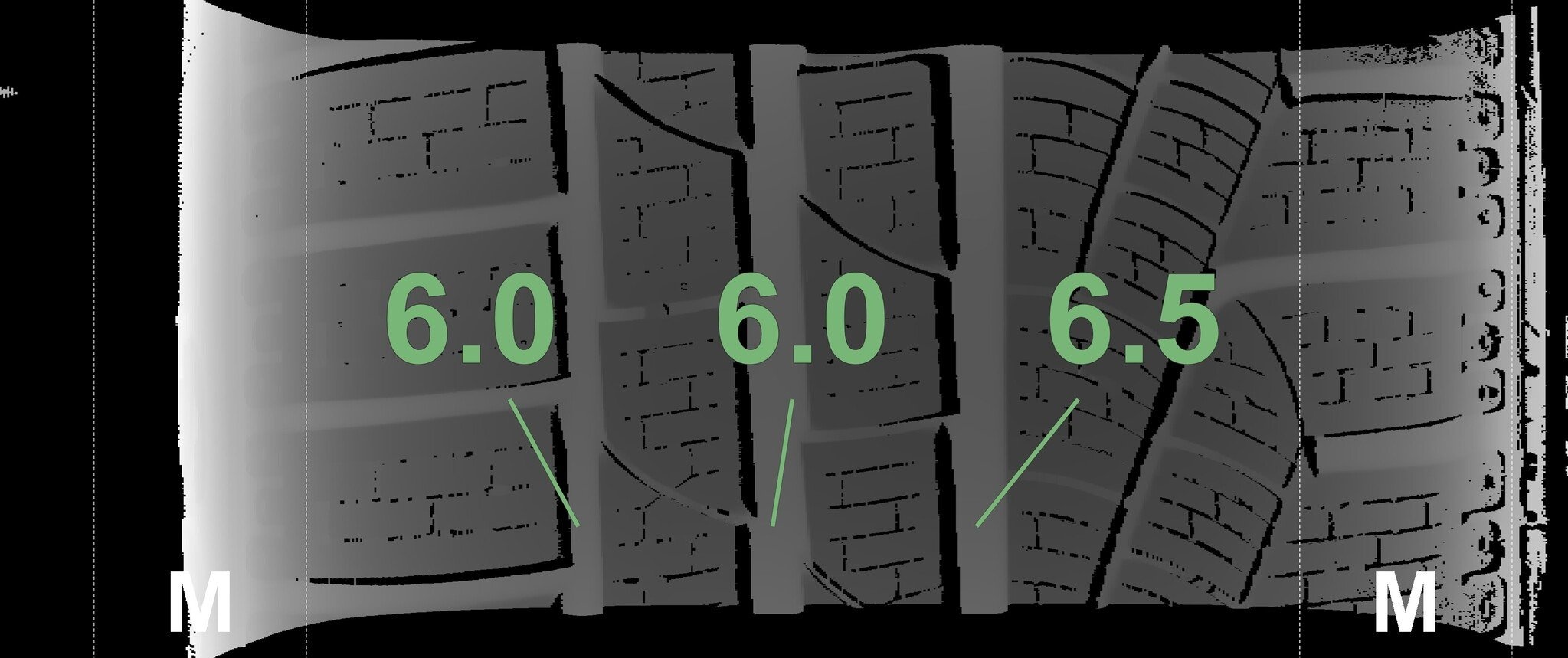 De gemeten profieldieptes en de details van de velgen zijn hierboven weergegeven.