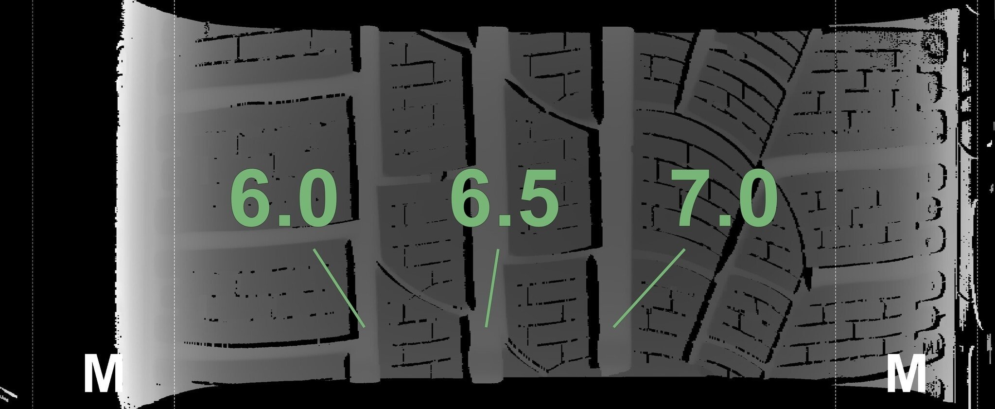 De gemeten profieldieptes en de details van de velgen zijn hierboven weergegeven.