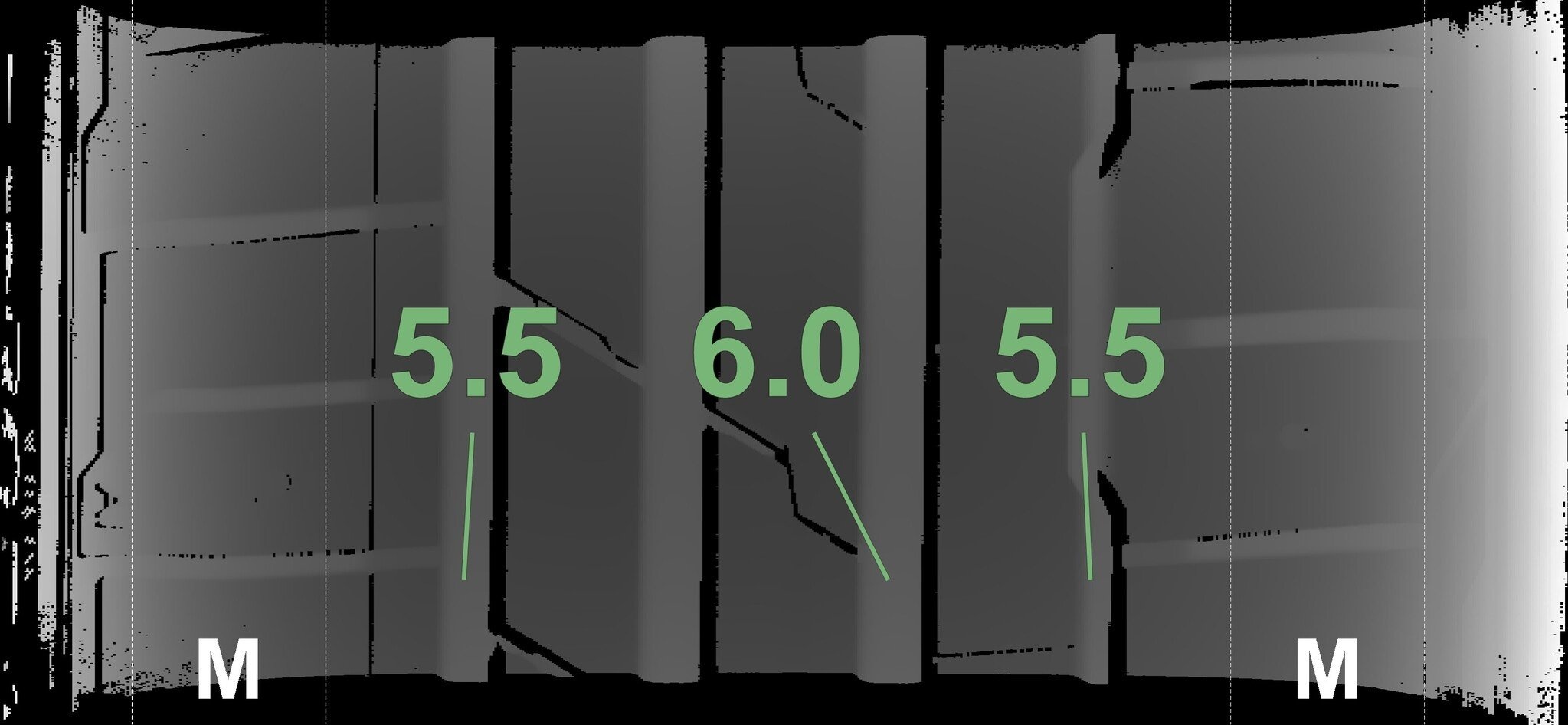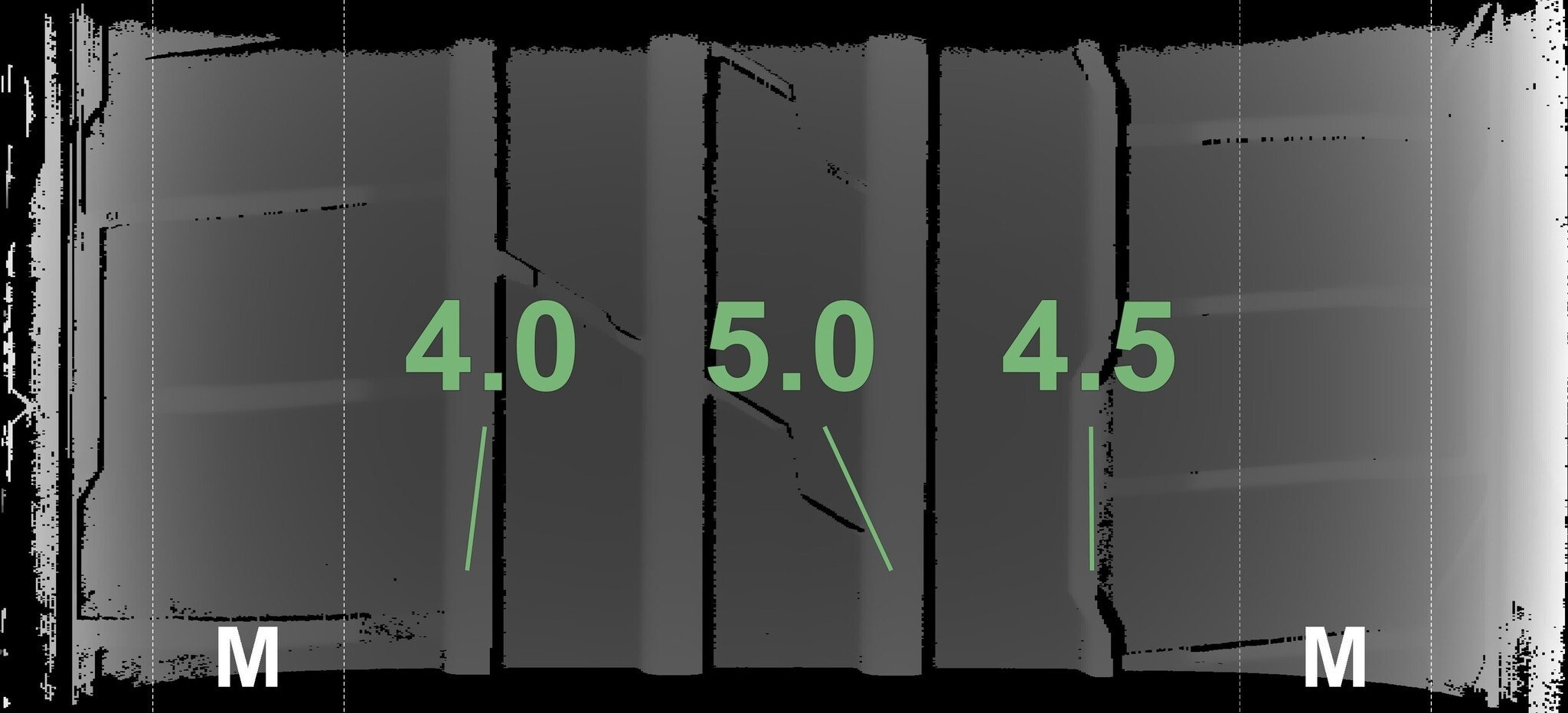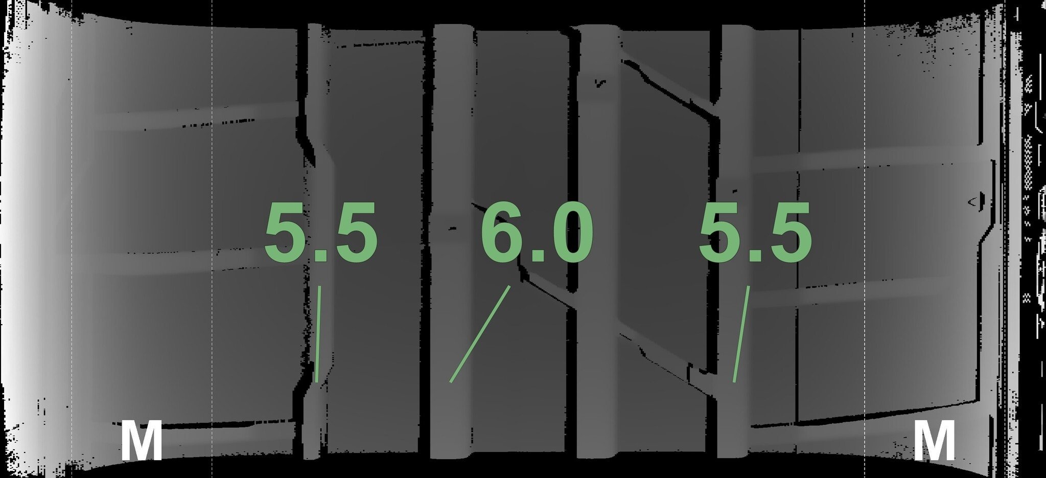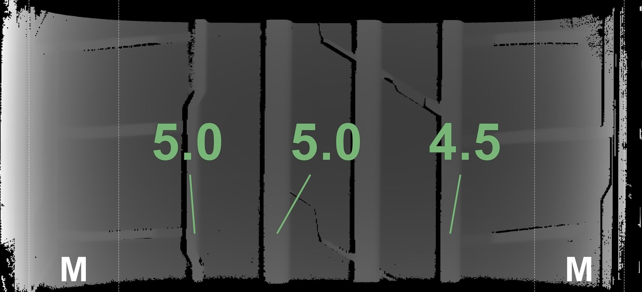 De gemeten profieldieptes en de details van de velgen zijn hierboven weergegeven.