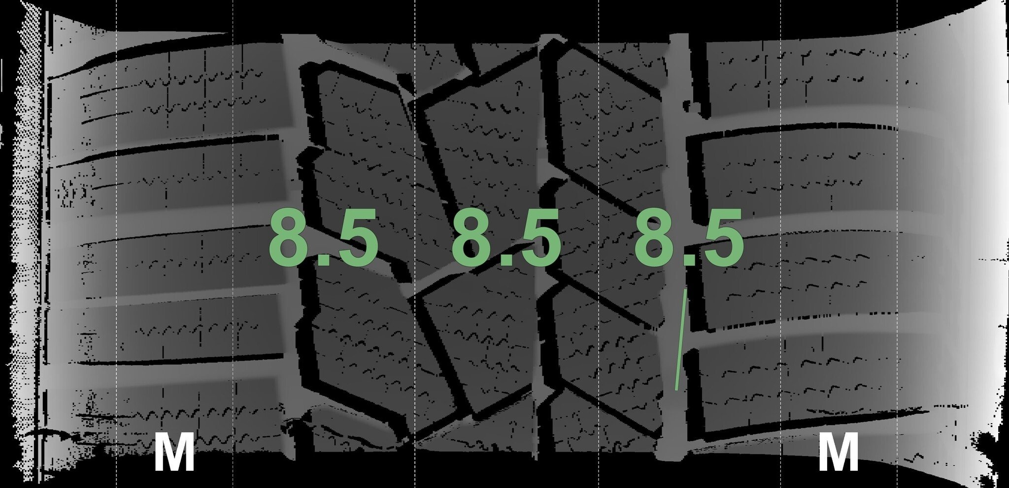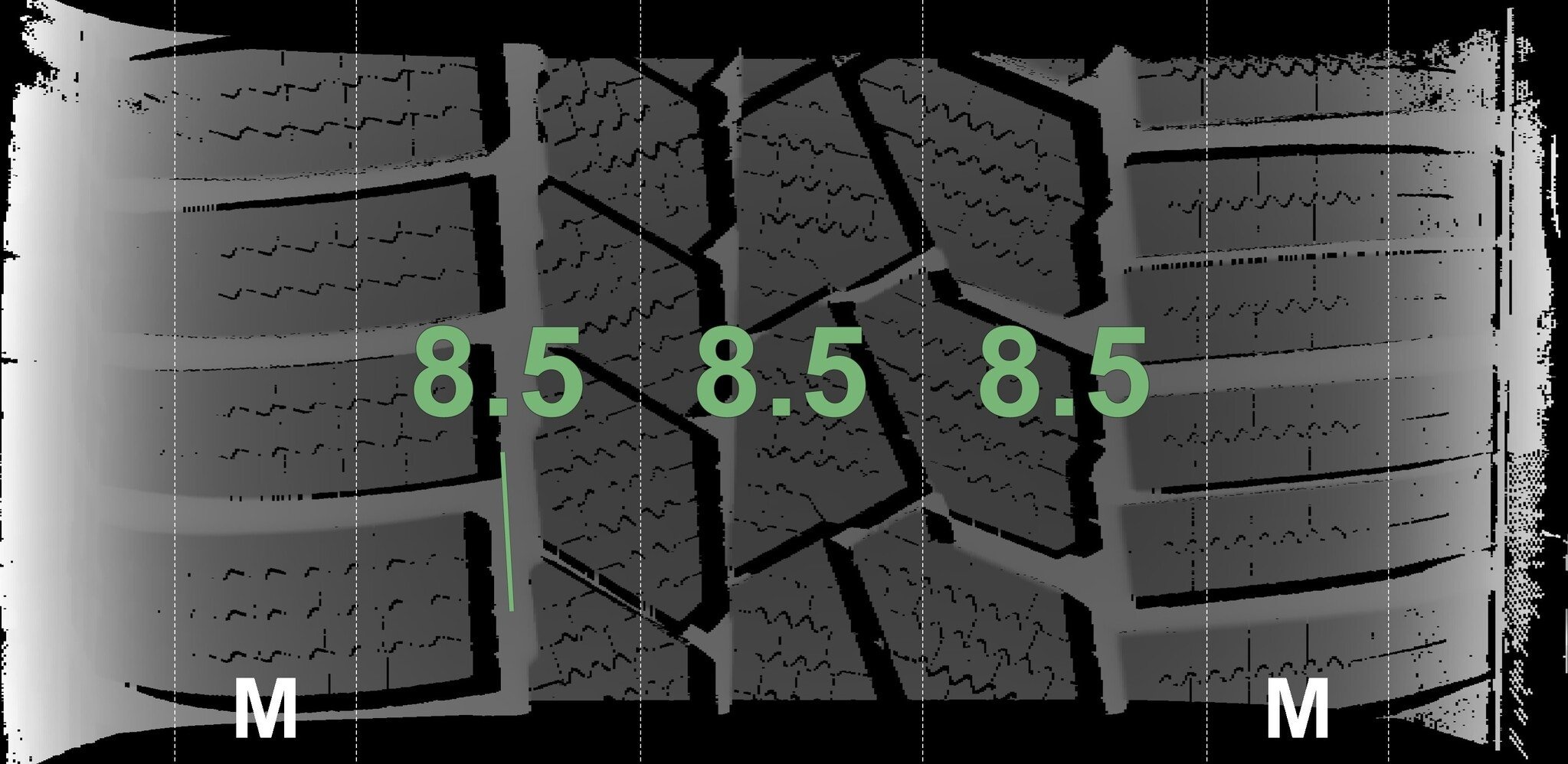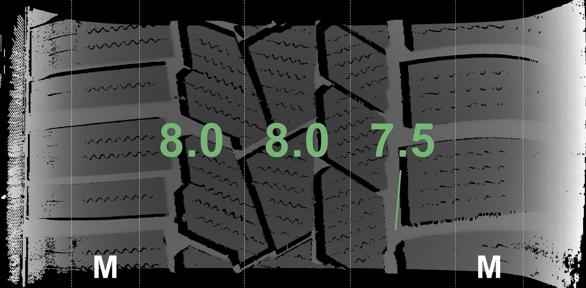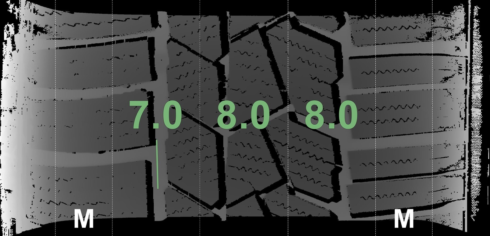 De gemeten profieldieptes en de details van de velgen zijn hierboven weergegeven.