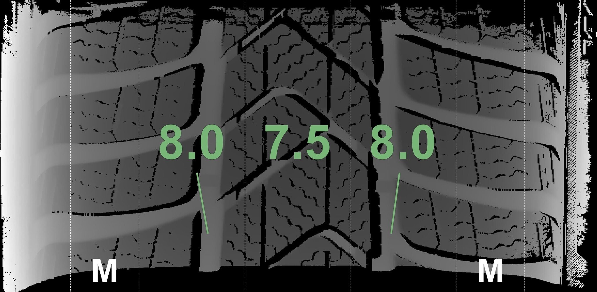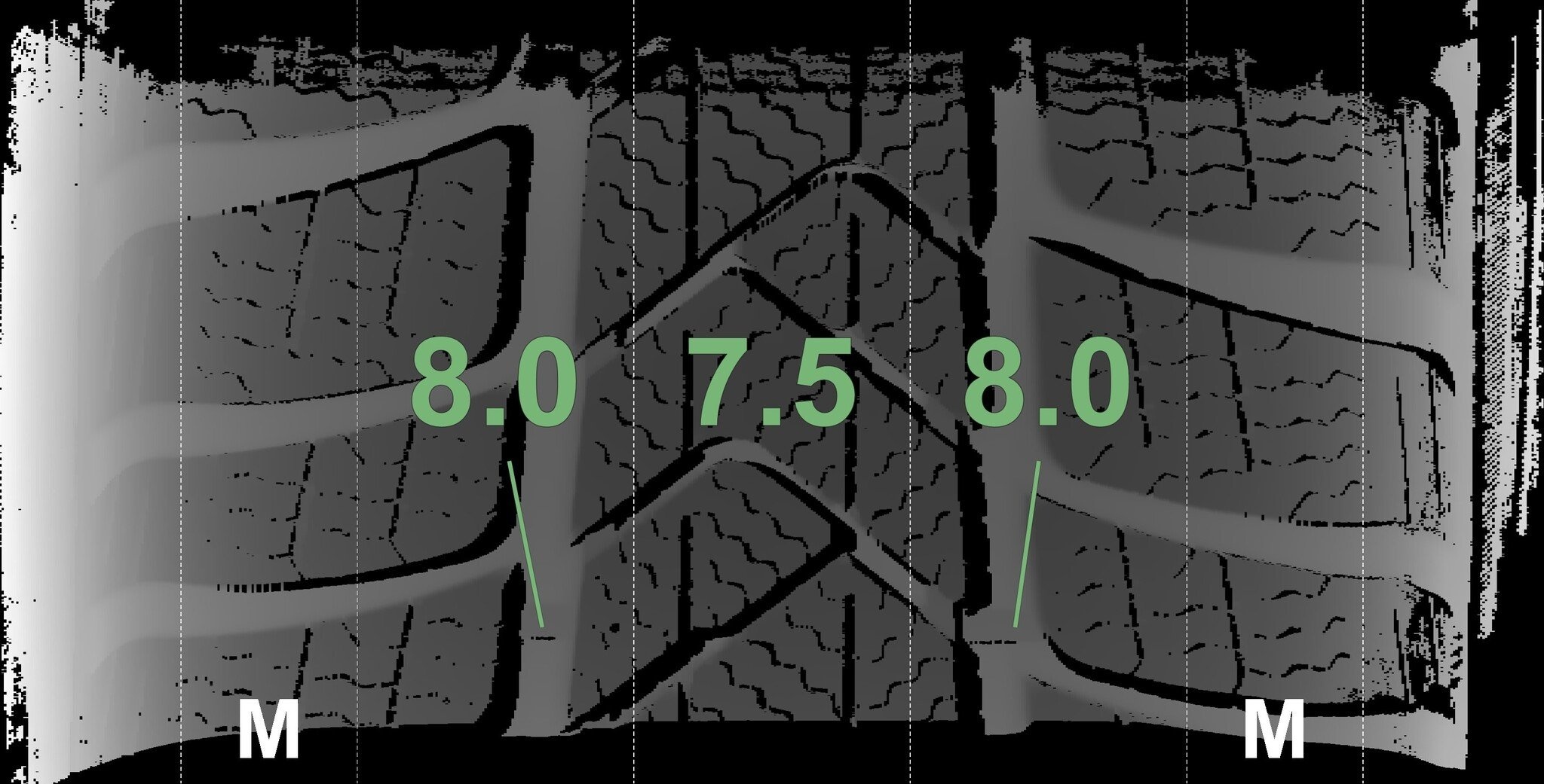De gemeten profieldieptes en de details van de velgen zijn hierboven weergegeven.