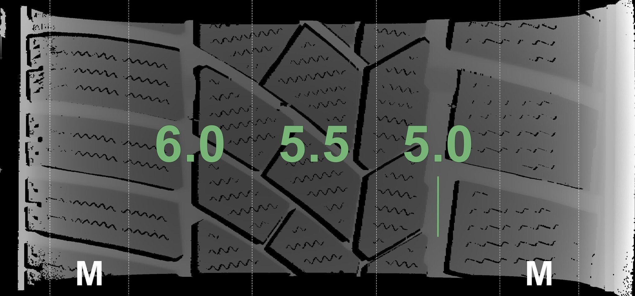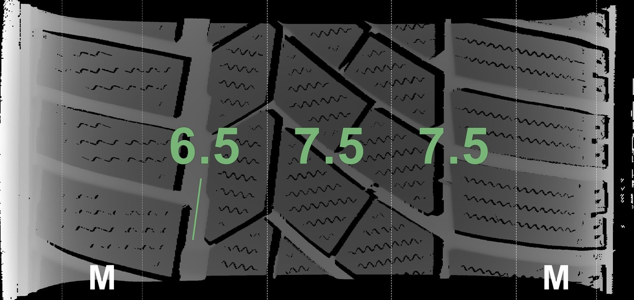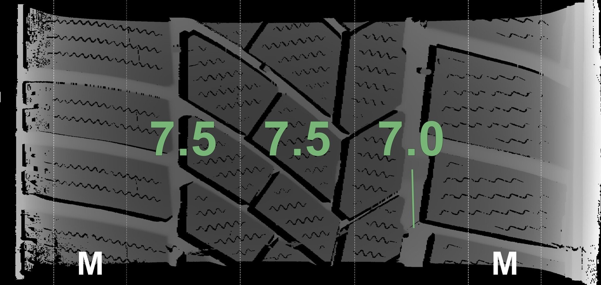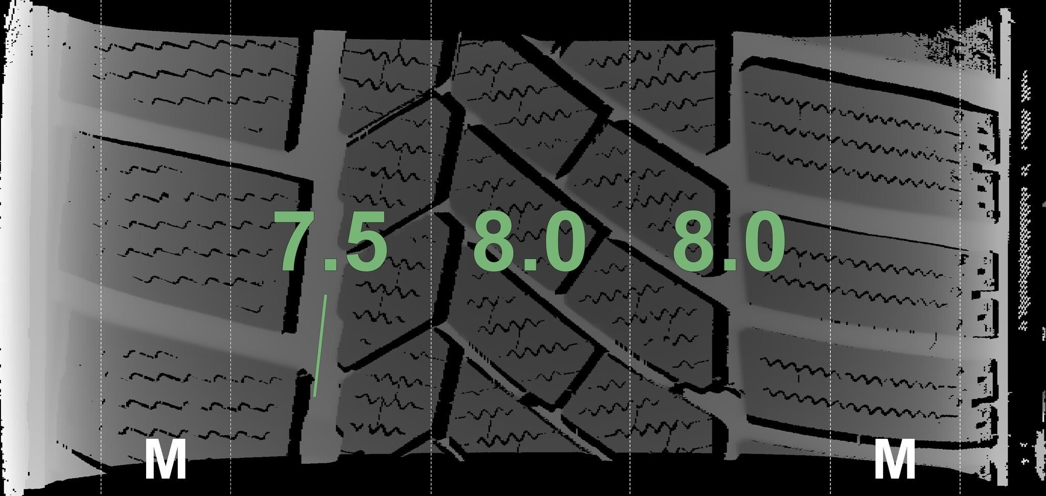 De gemeten profieldieptes en de details van de velgen zijn hierboven weergegeven.