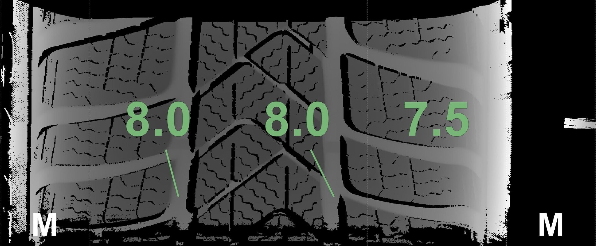 De gemeten profieldieptes en de details van de velgen zijn hierboven weergegeven.