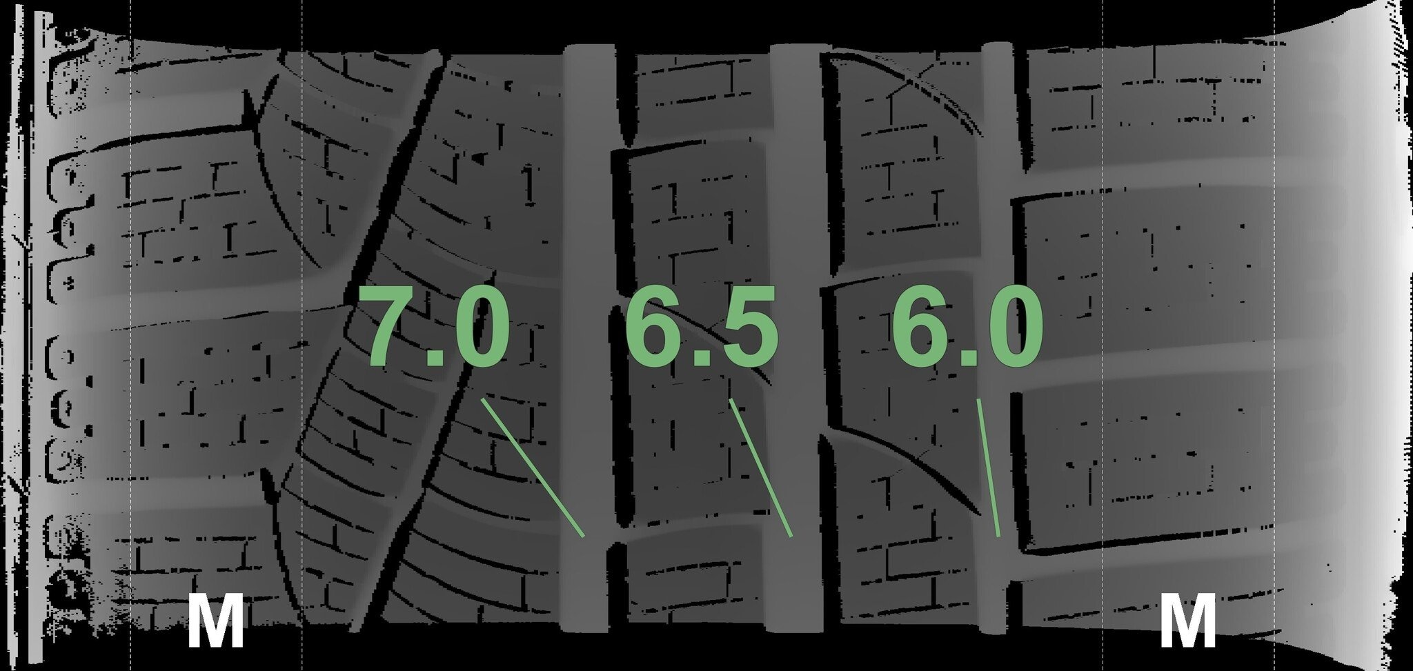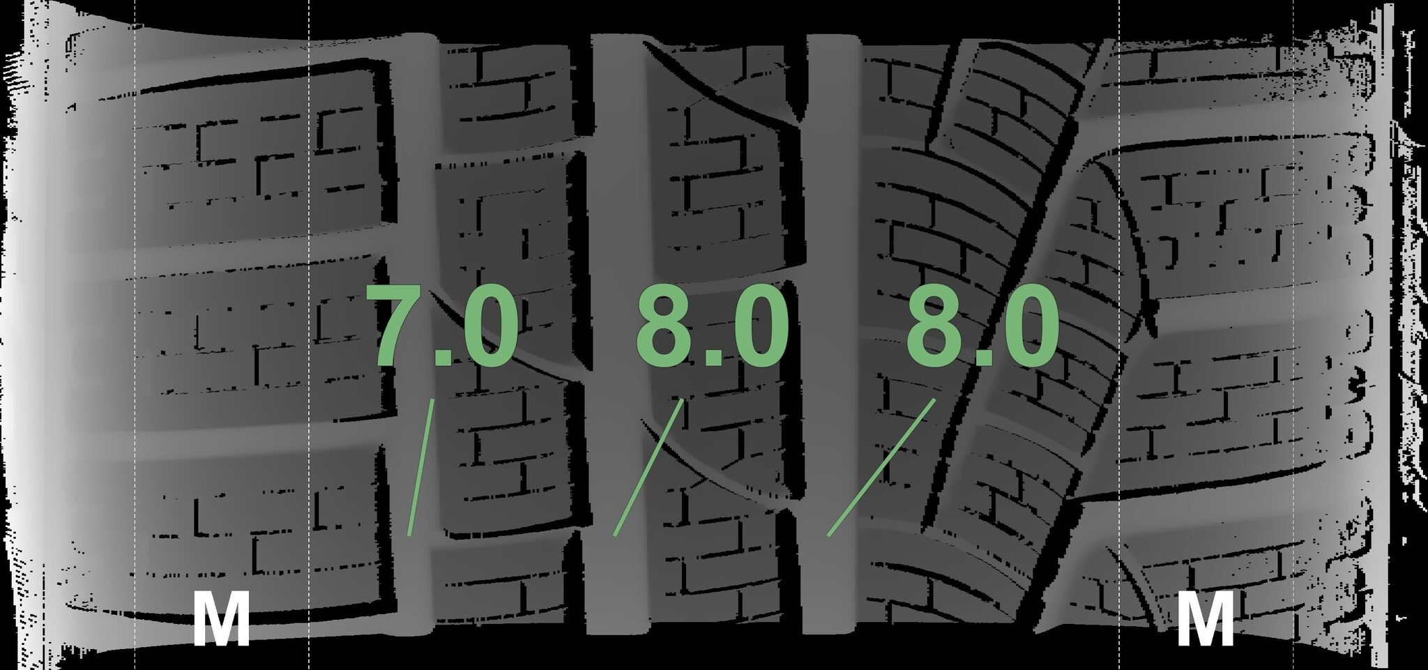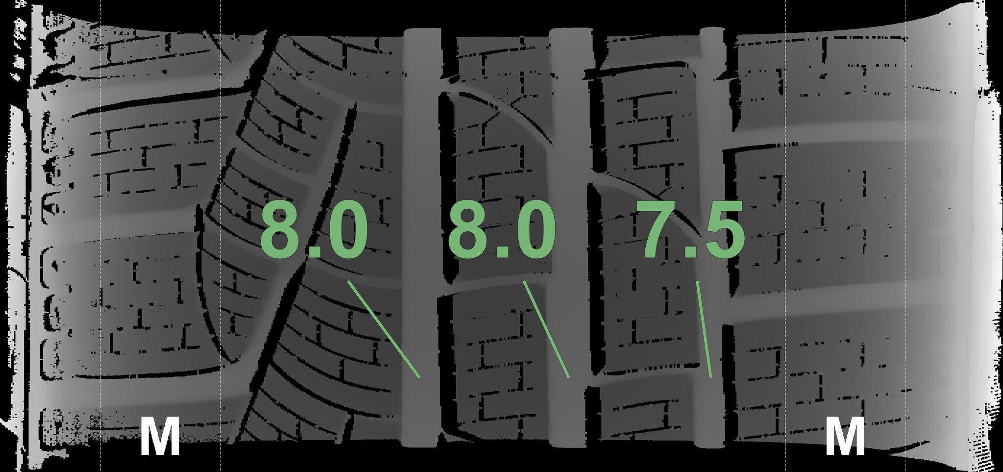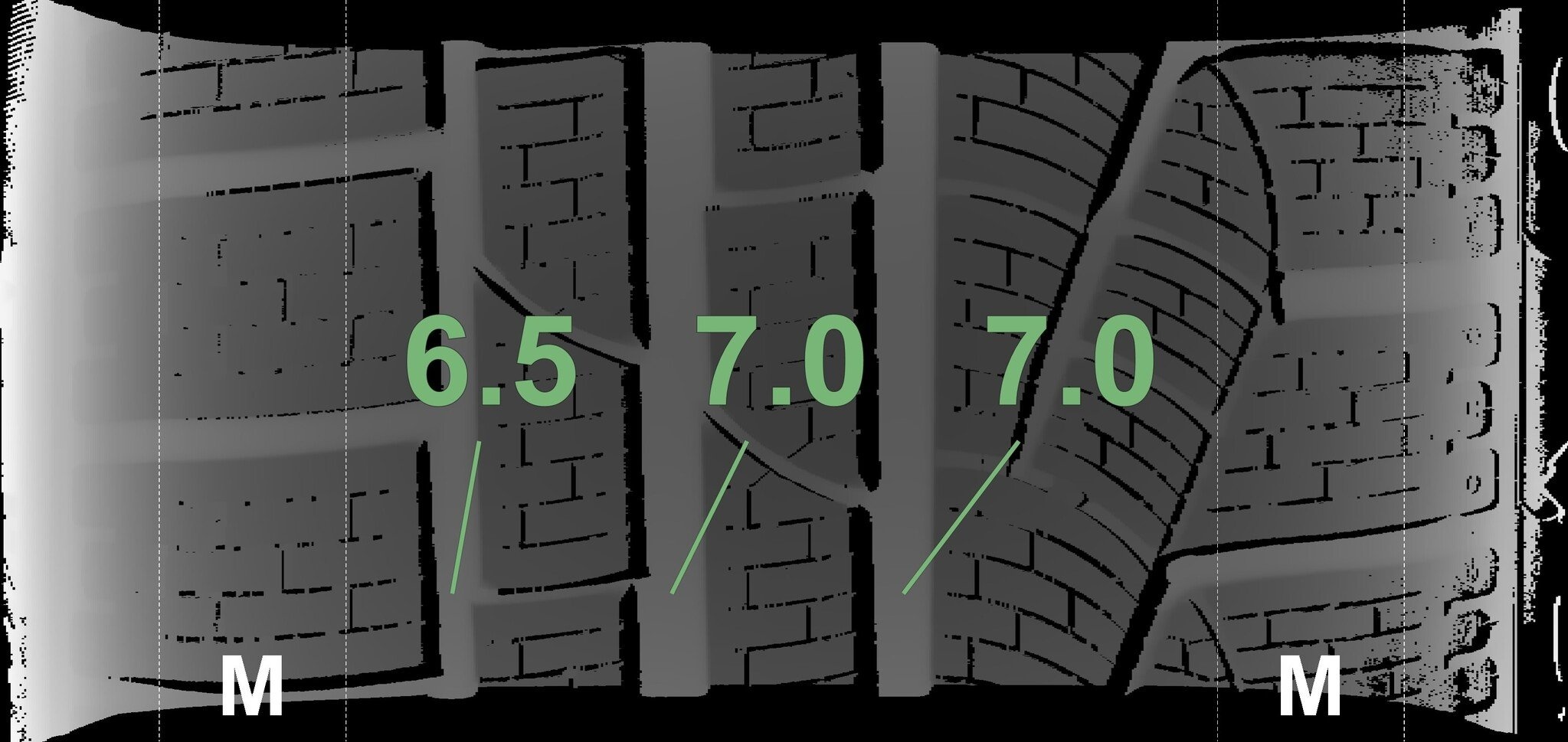 De gemeten profieldieptes en de details van de velgen zijn hierboven weergegeven.
