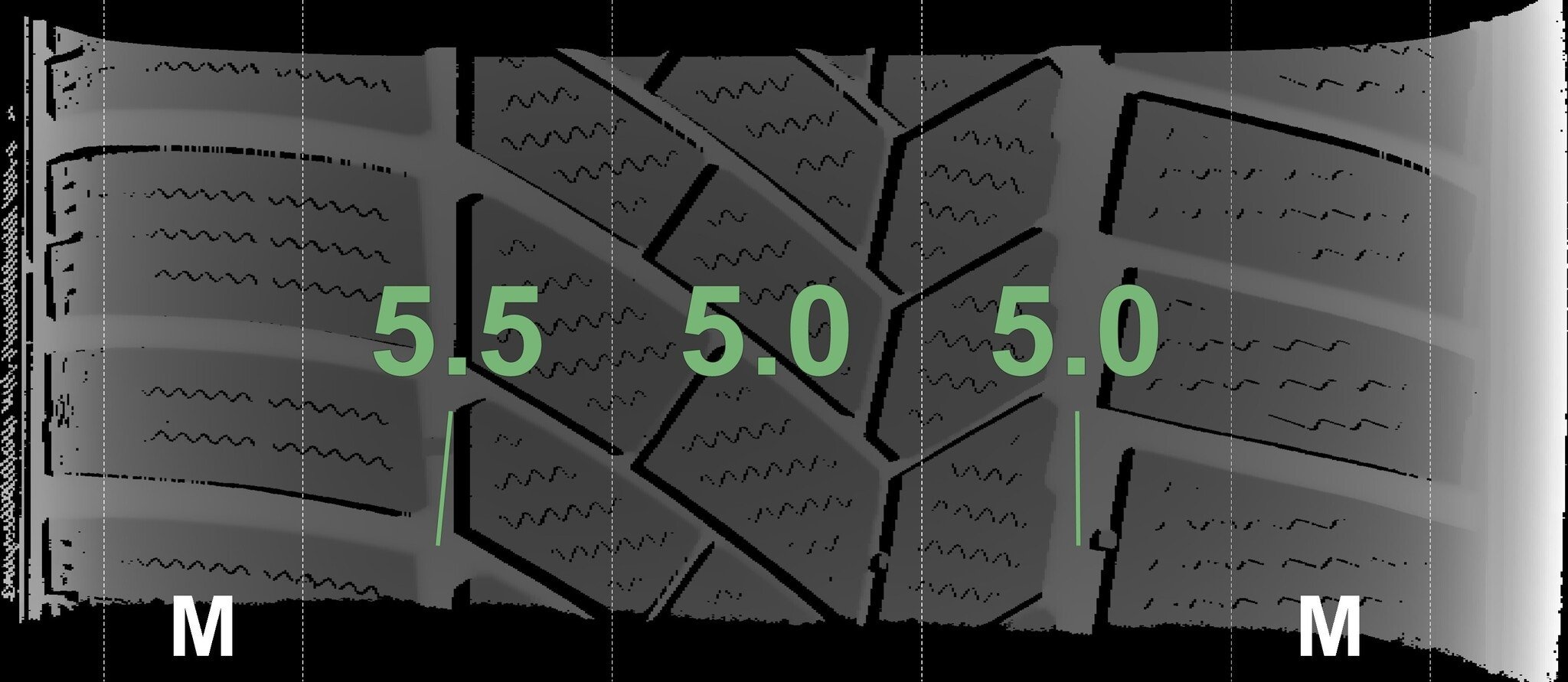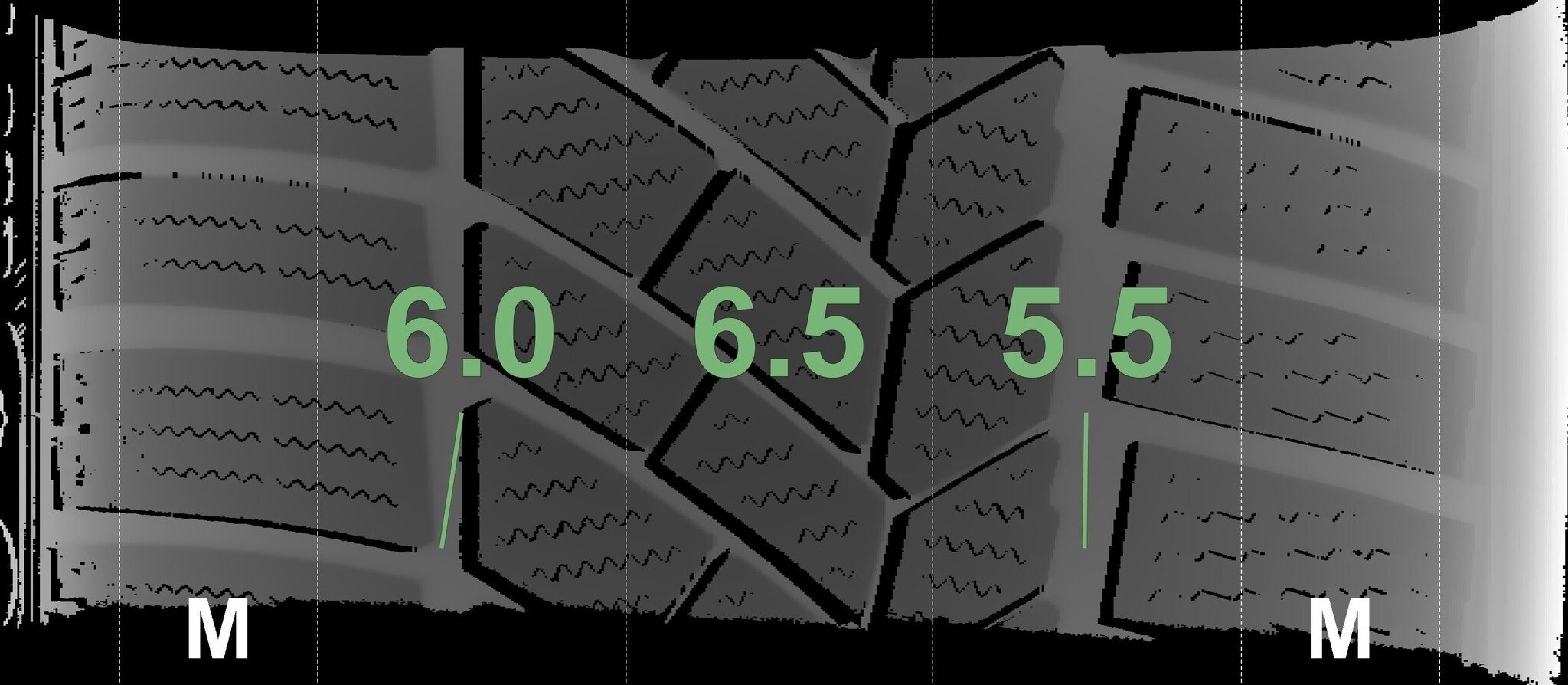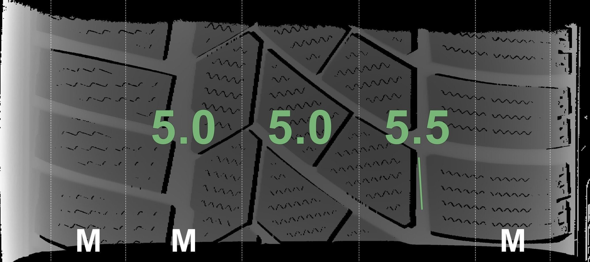 De gemeten profieldieptes en de details van de velgen zijn hierboven weergegeven.