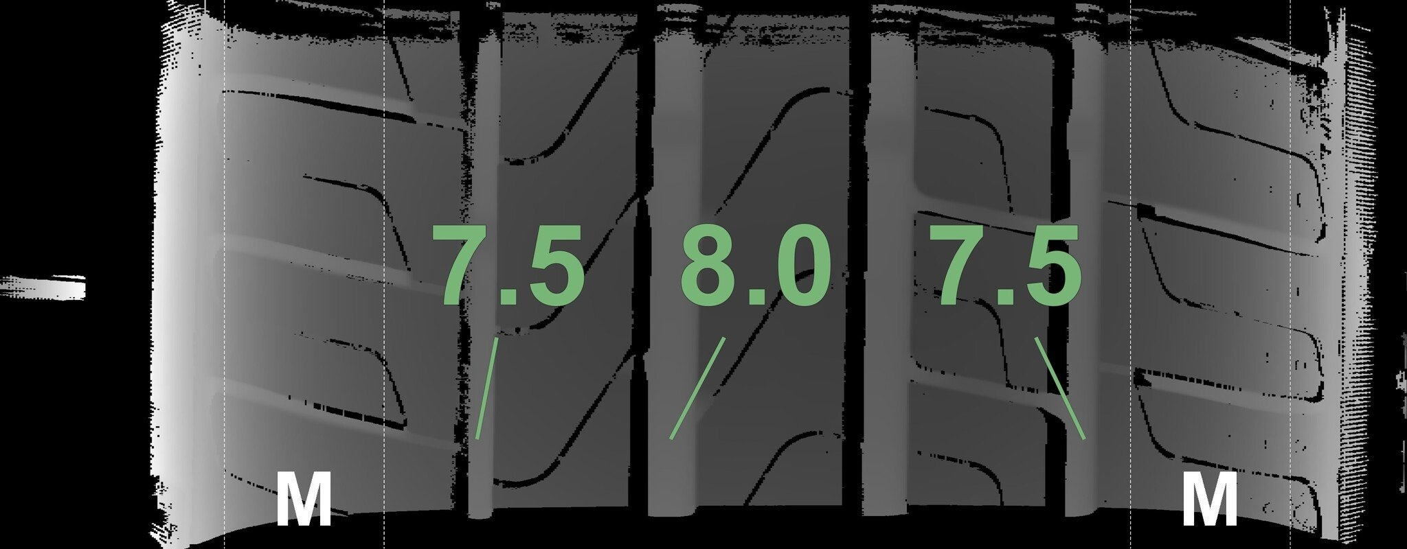 De gemeten profieldieptes en de details van de velgen zijn hierboven weergegeven.