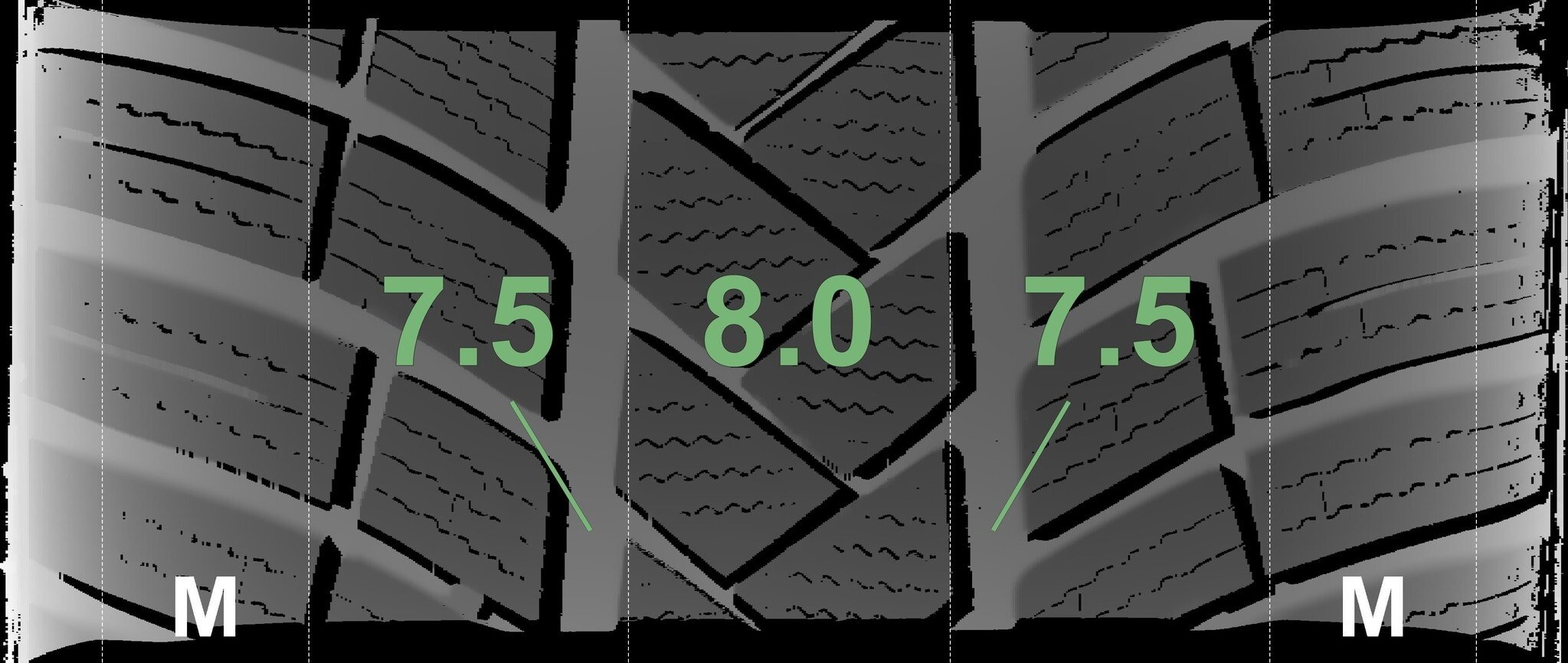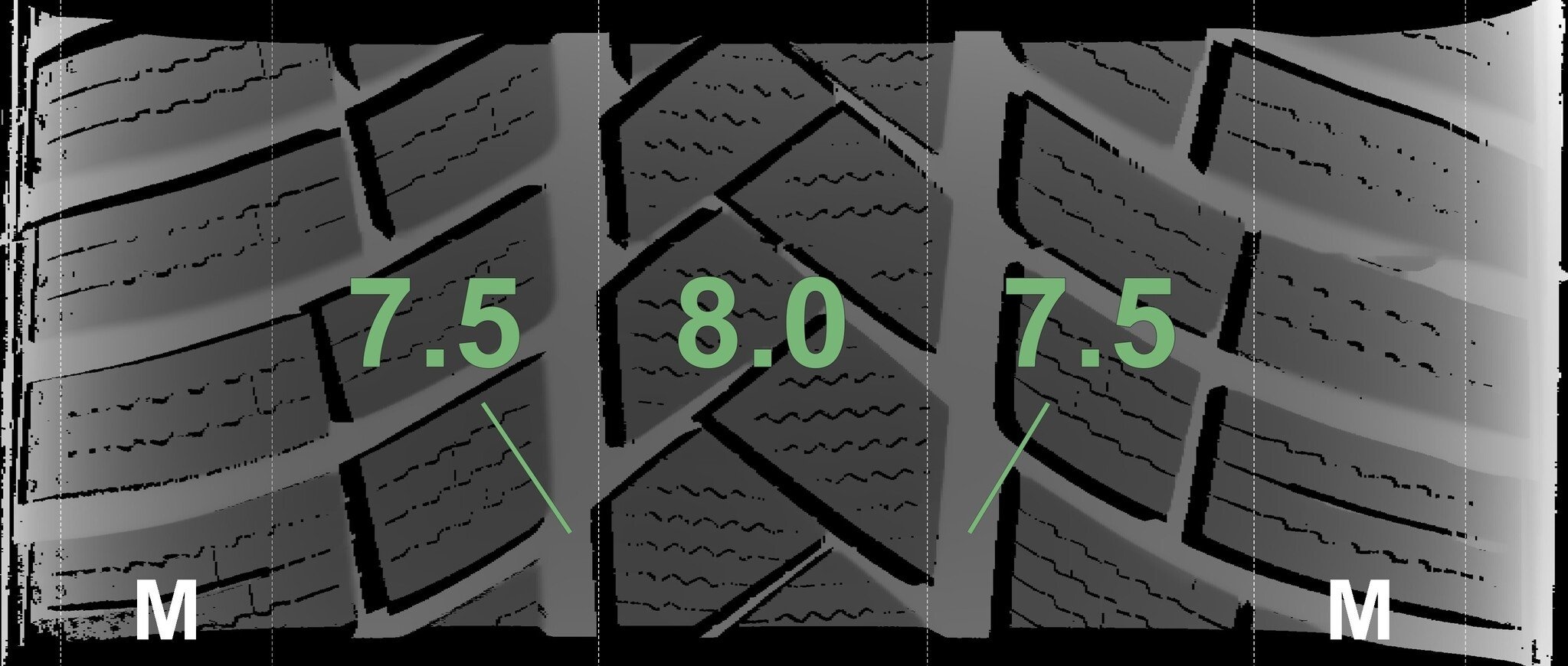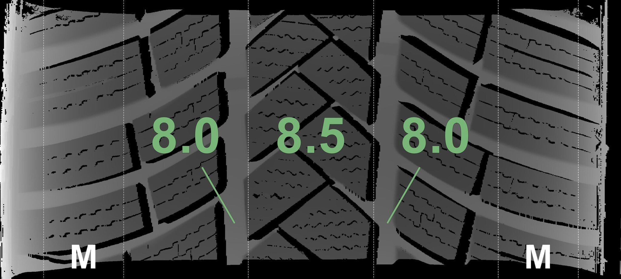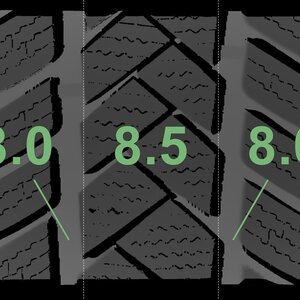 De gemeten profieldieptes en de details van de velgen zijn hierboven weergegeven.