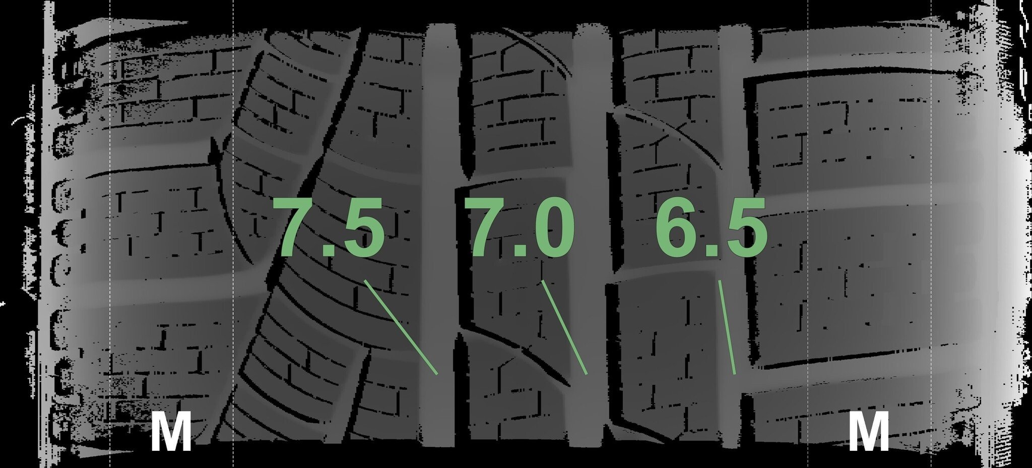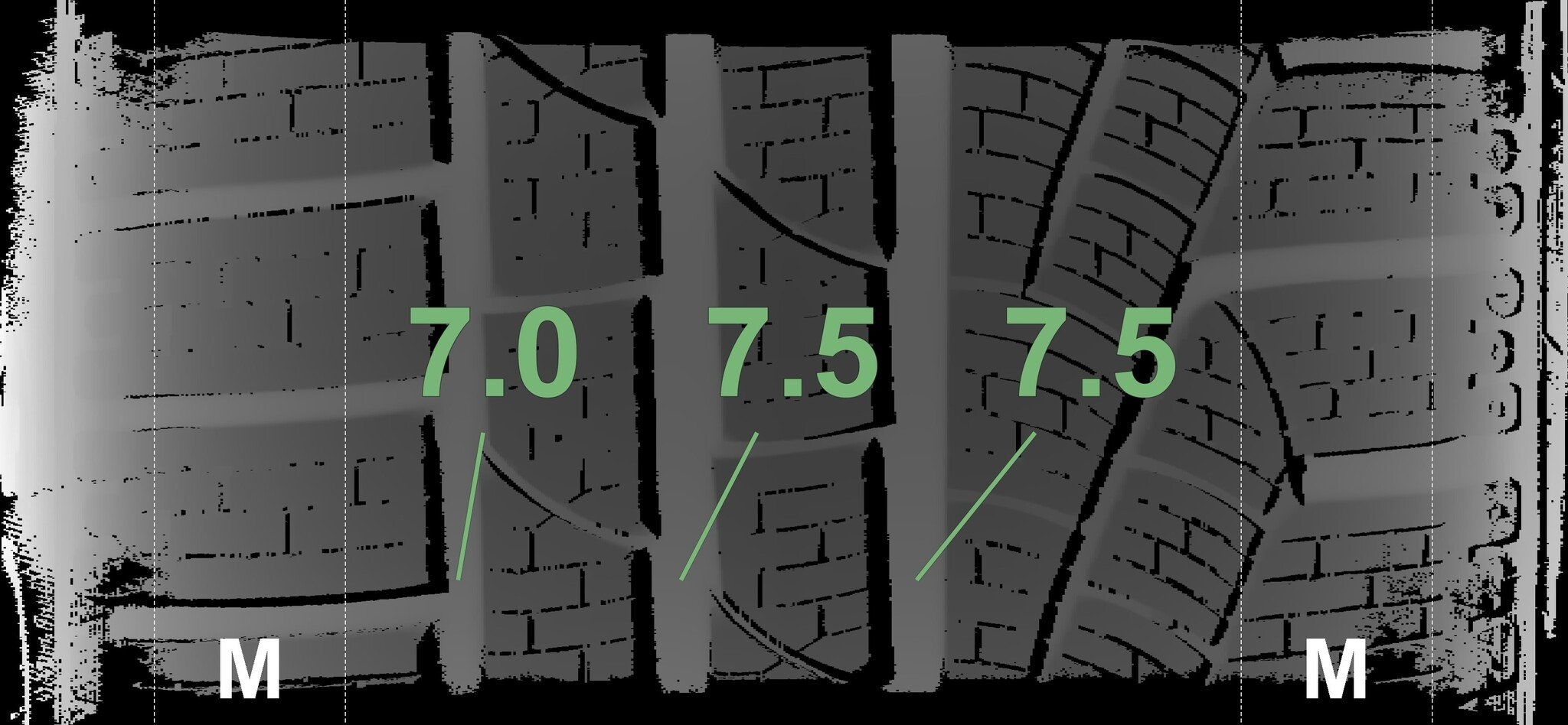 De gemeten profieldieptes en de details van de velgen zijn hierboven weergegeven.