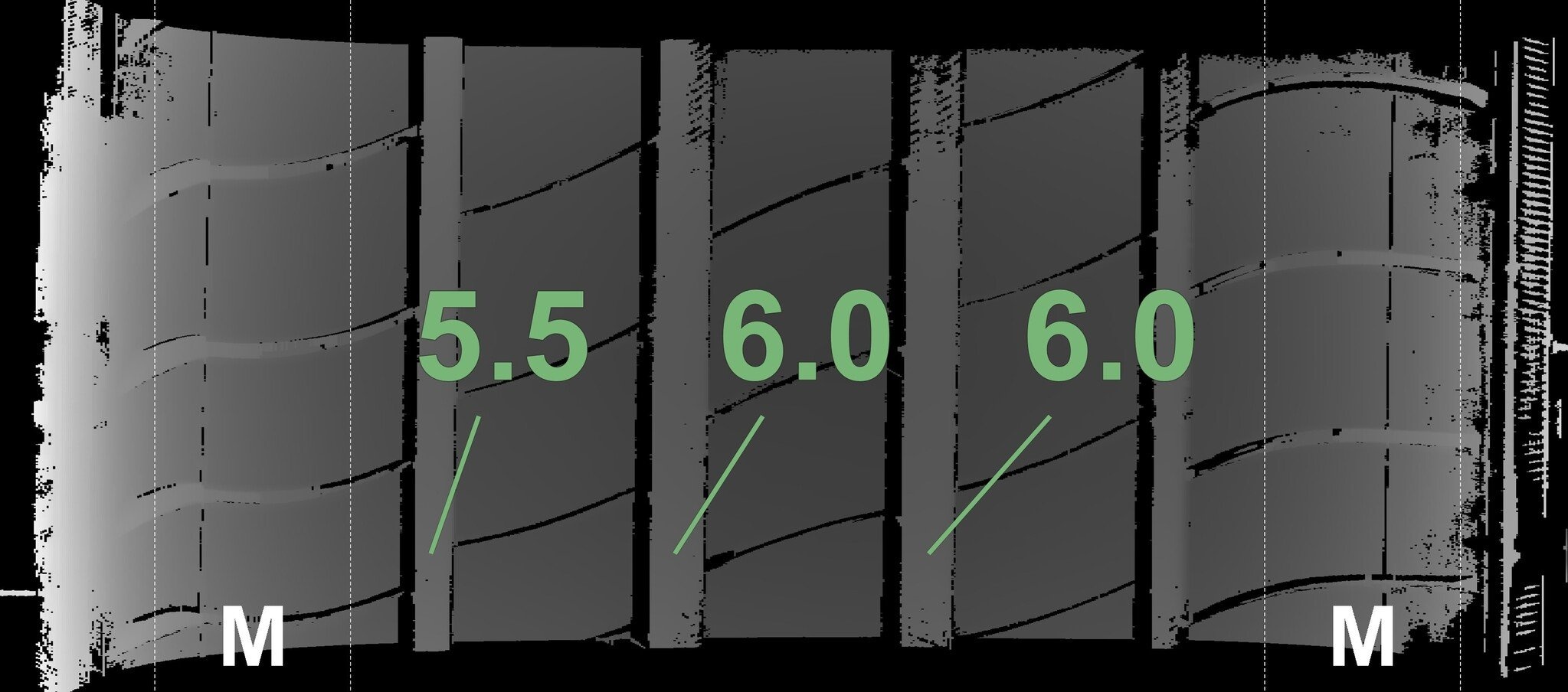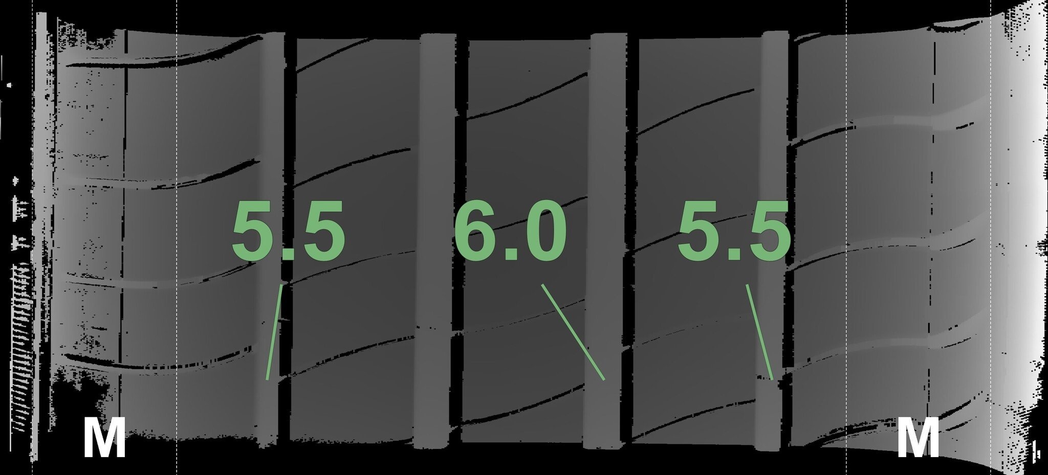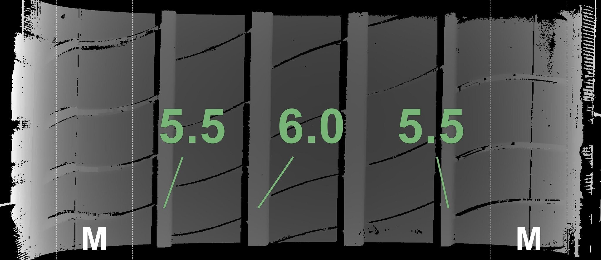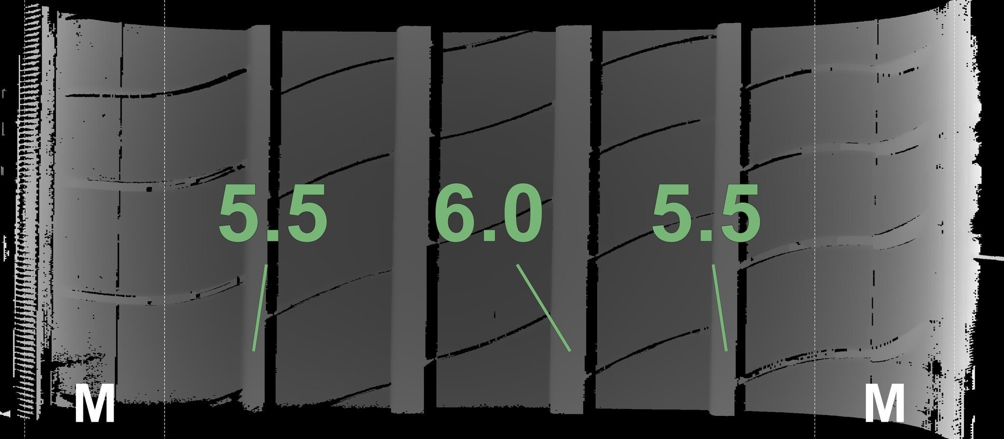 De gemeten profieldieptes en de details van de velgen zijn hierboven weergegeven.