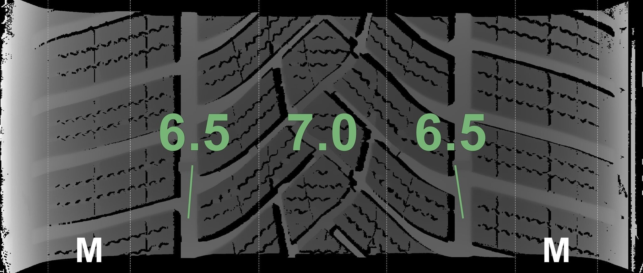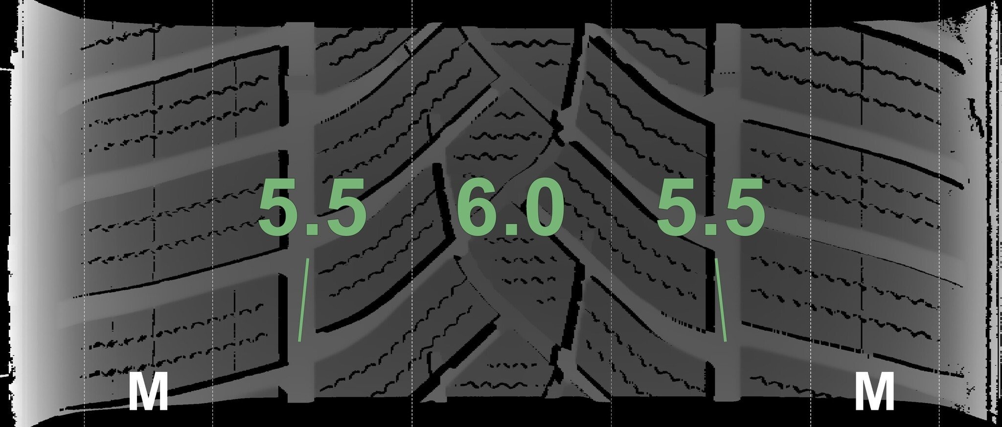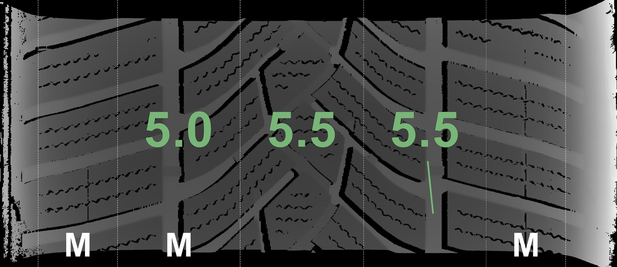 De gemeten profieldieptes en de details van de velgen zijn hierboven weergegeven.
