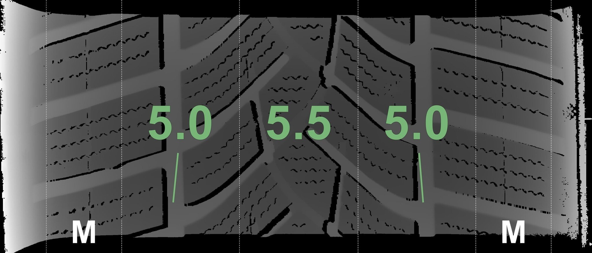 De gemeten profieldieptes en de details van de velgen zijn hierboven weergegeven.