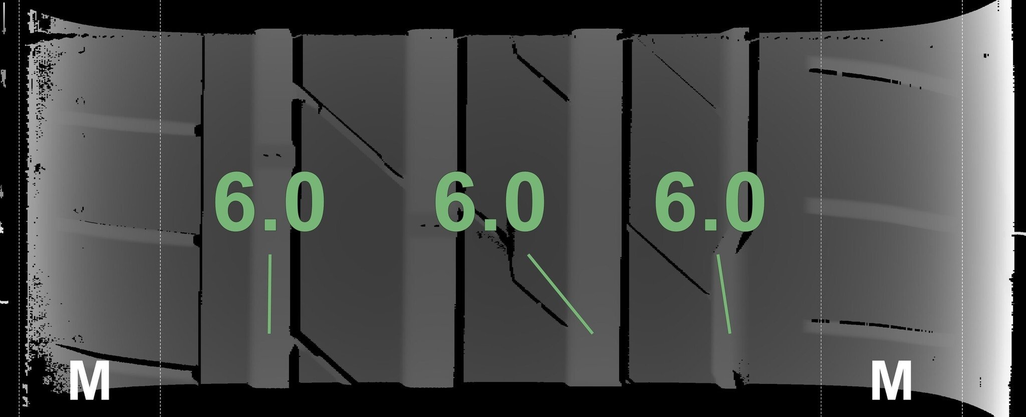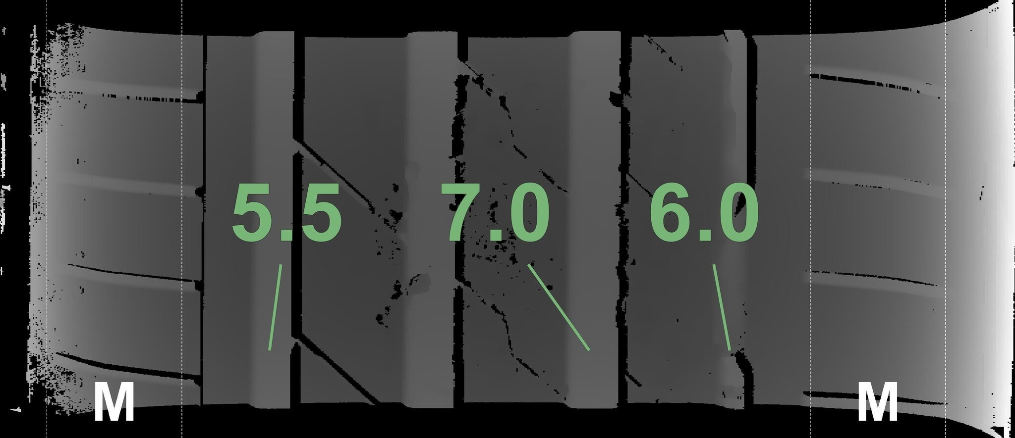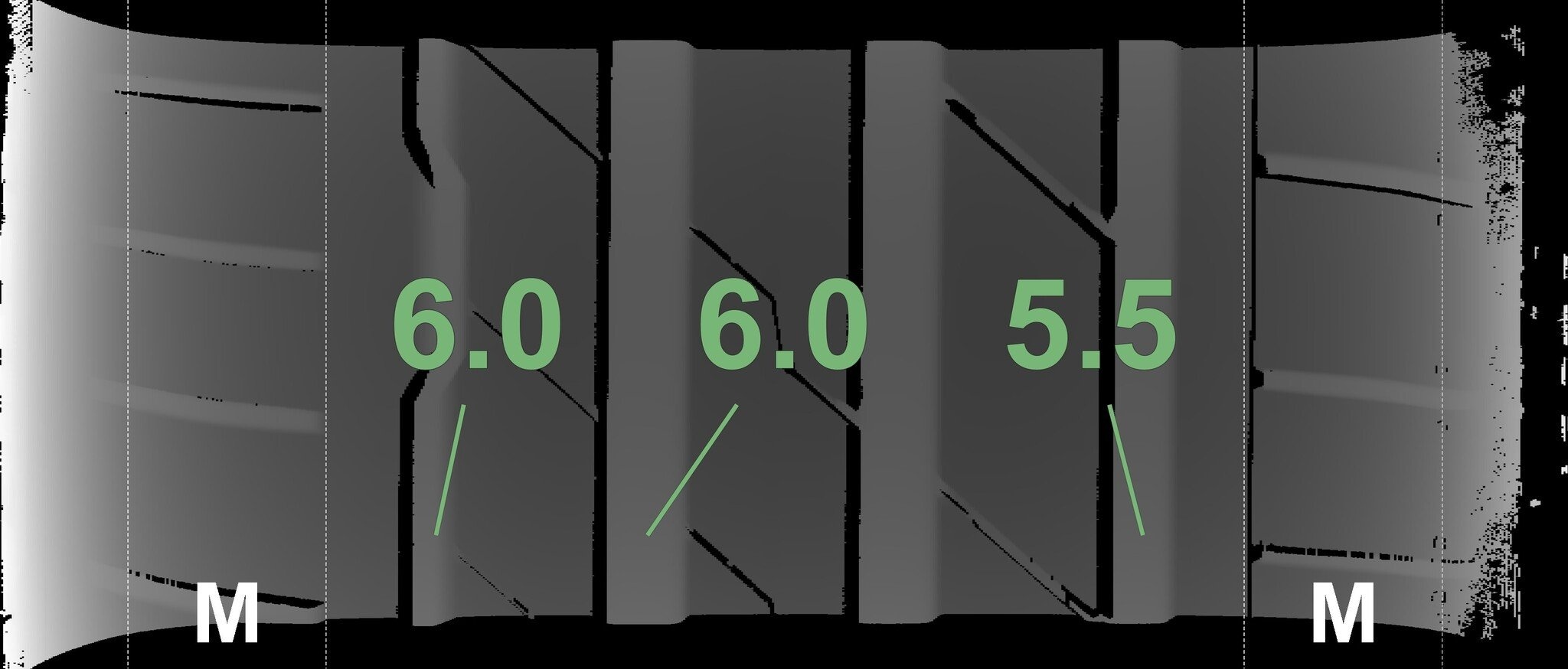 De gemeten profieldieptes en de details van de velgen zijn hierboven weergegeven.