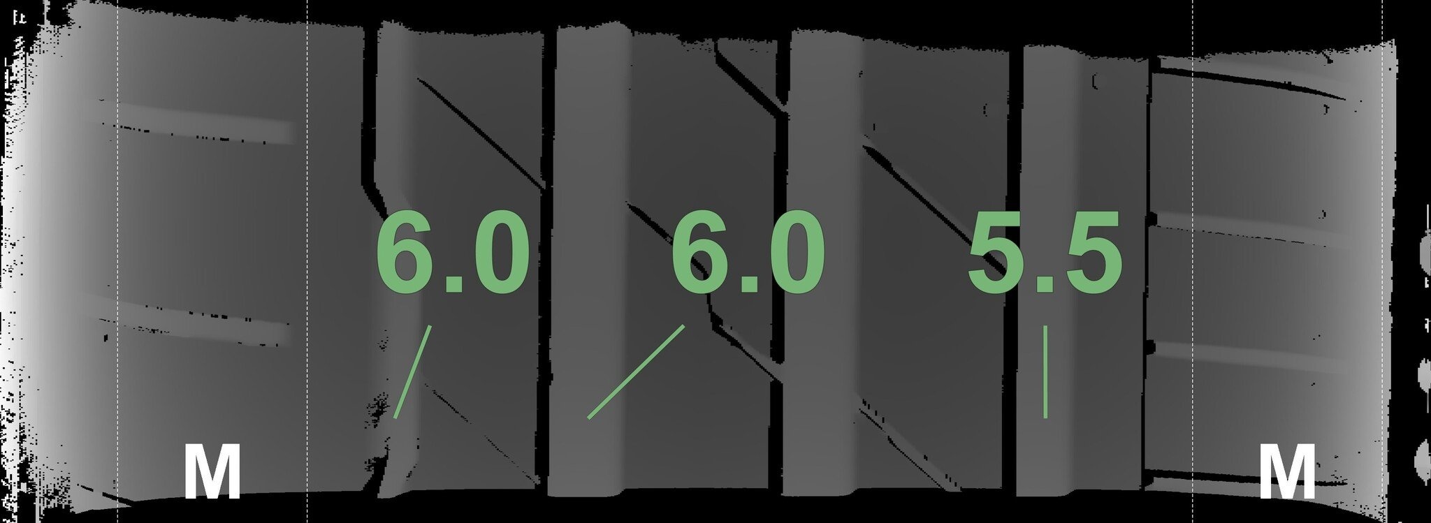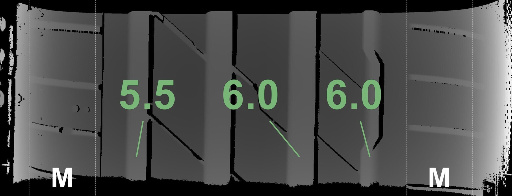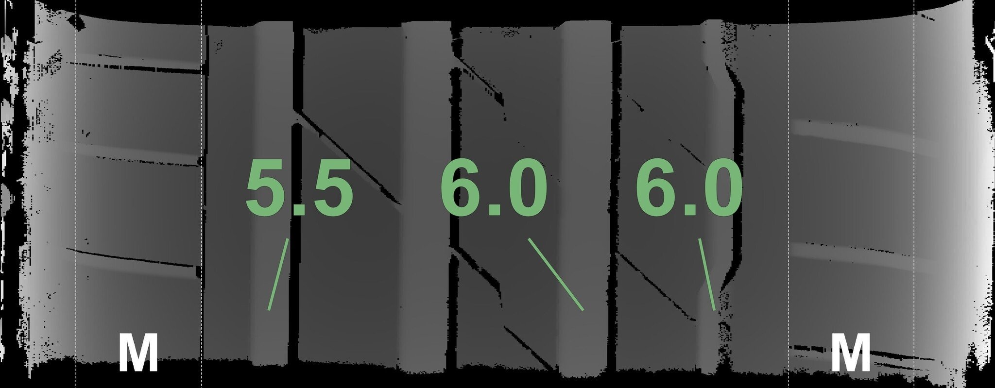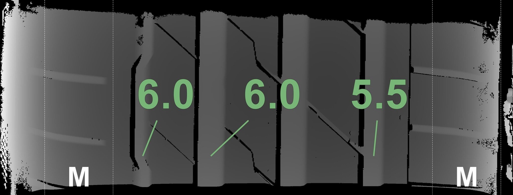 De gemeten profieldieptes en de details van de velgen zijn hierboven weergegeven.