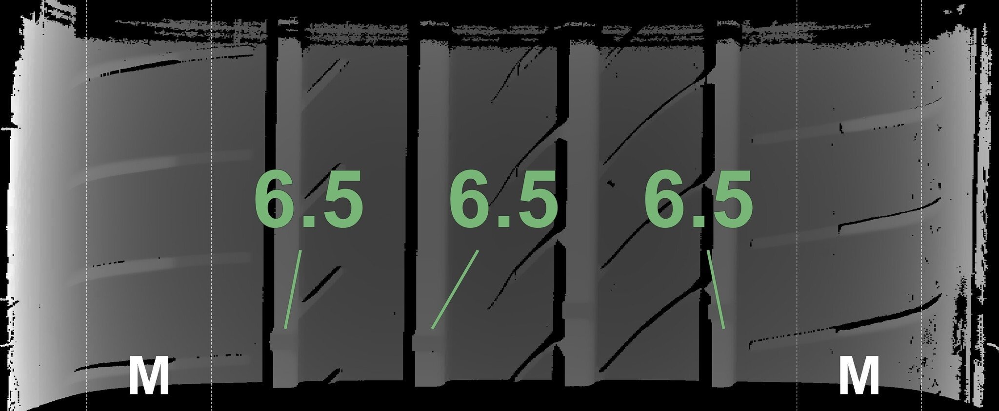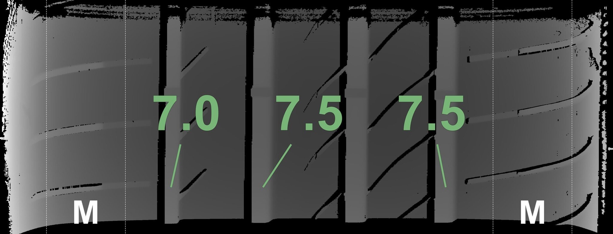 De gemeten profieldieptes en de details van de velgen zijn hierboven weergegeven.