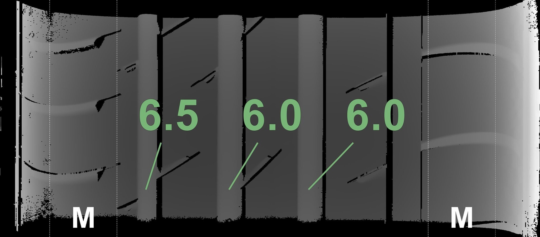 De gemeten profieldieptes en de details van de velgen zijn hierboven weergegeven.