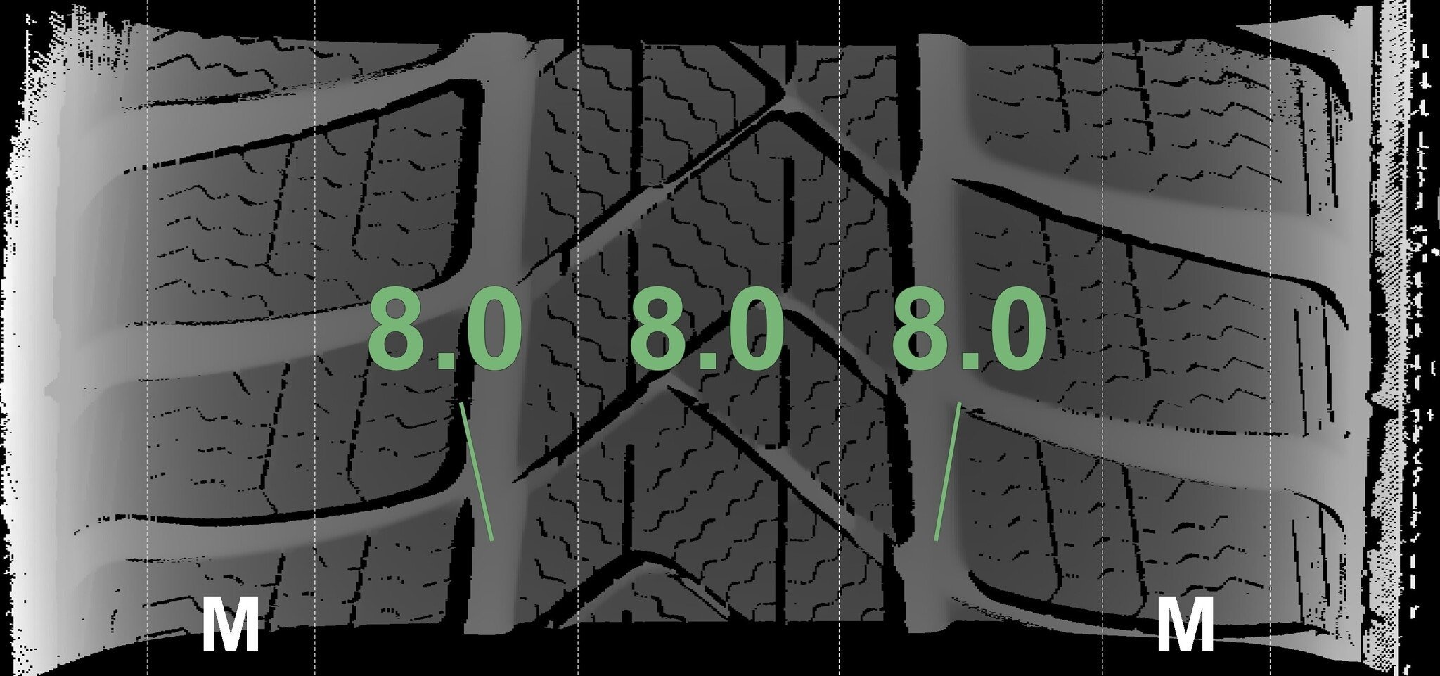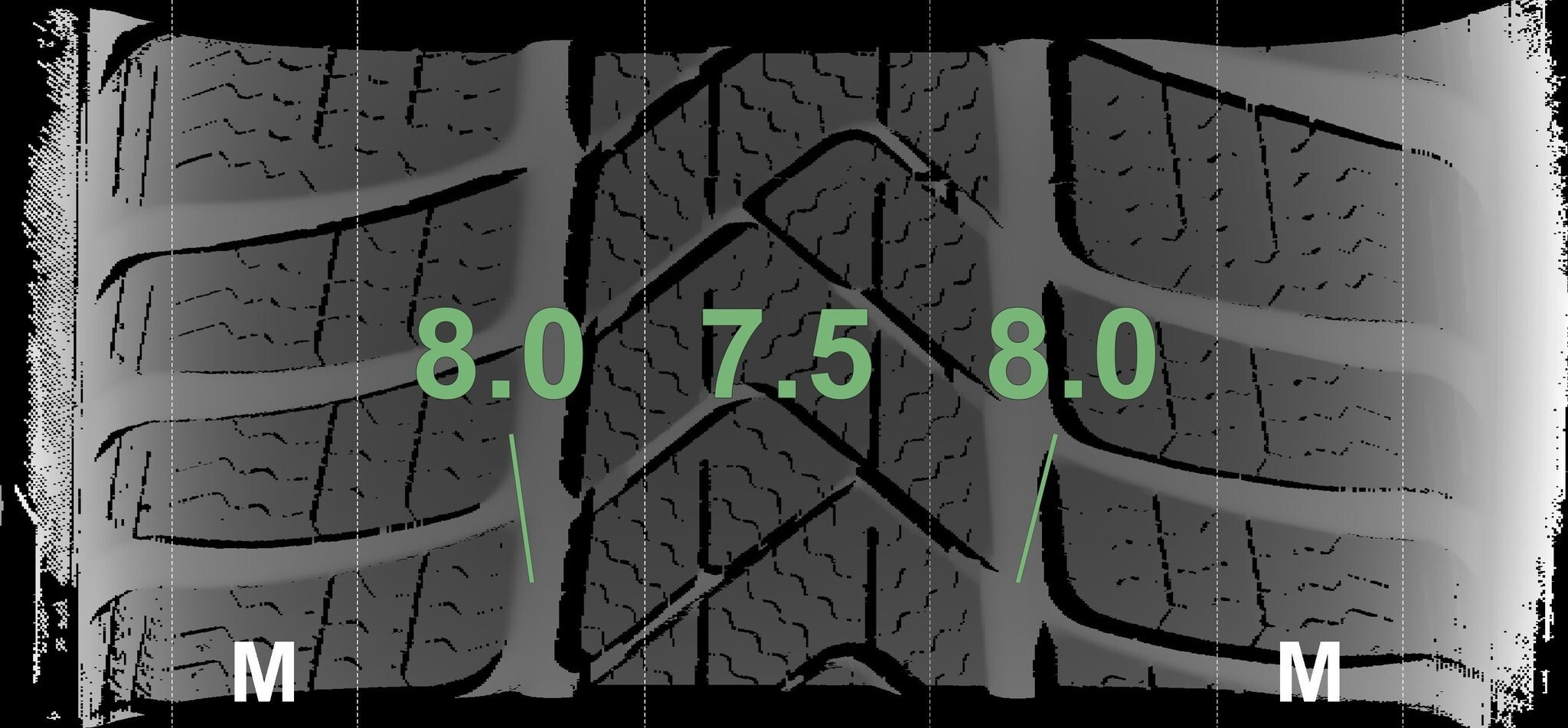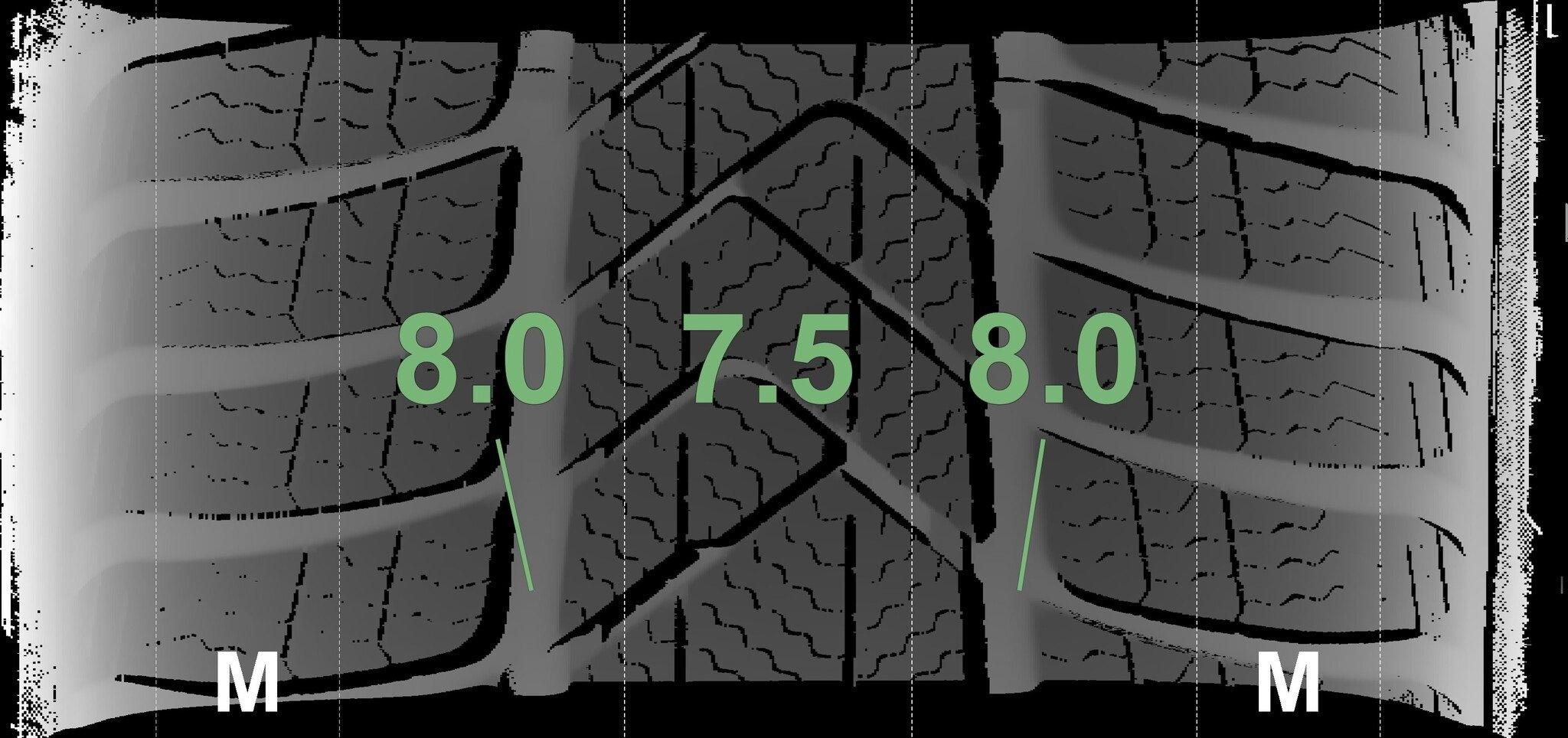 De gemeten profieldieptes en de details van de velgen zijn hierboven weergegeven.