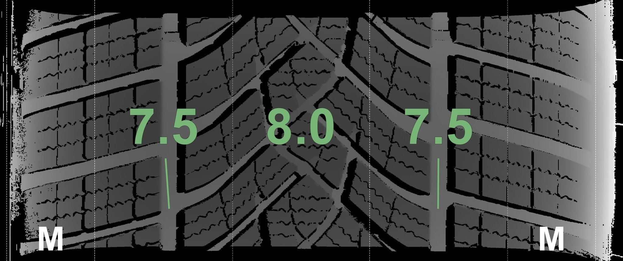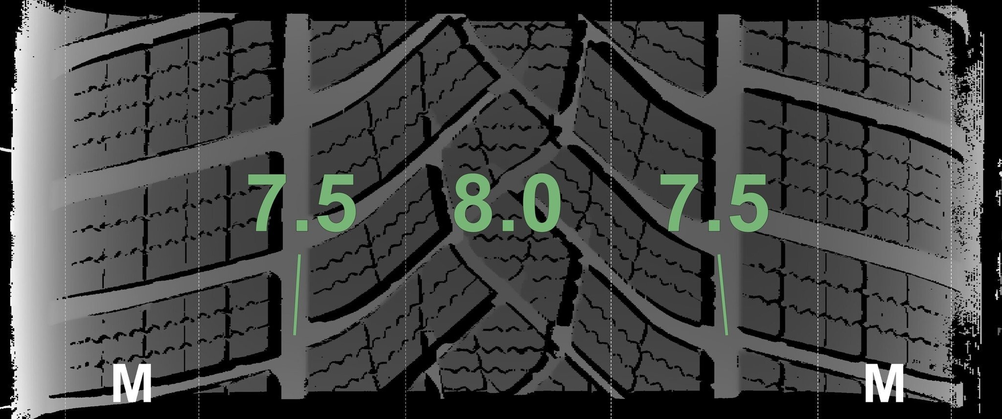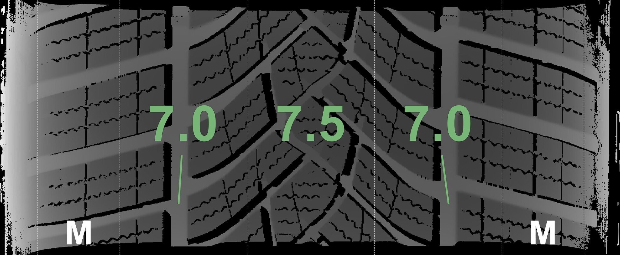 De gemeten profieldieptes en de details van de velgen zijn hierboven weergegeven.