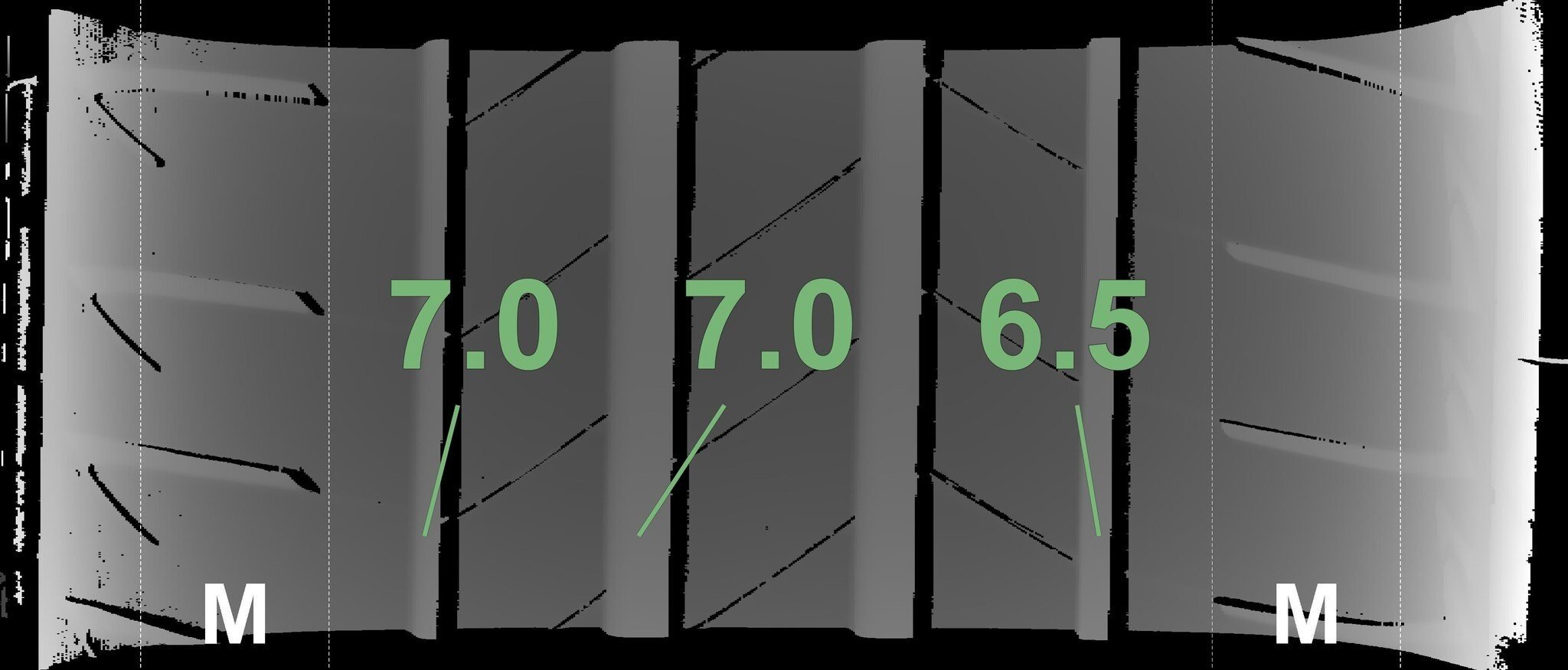 De gemeten profieldieptes en de details van de velgen zijn hierboven weergegeven.