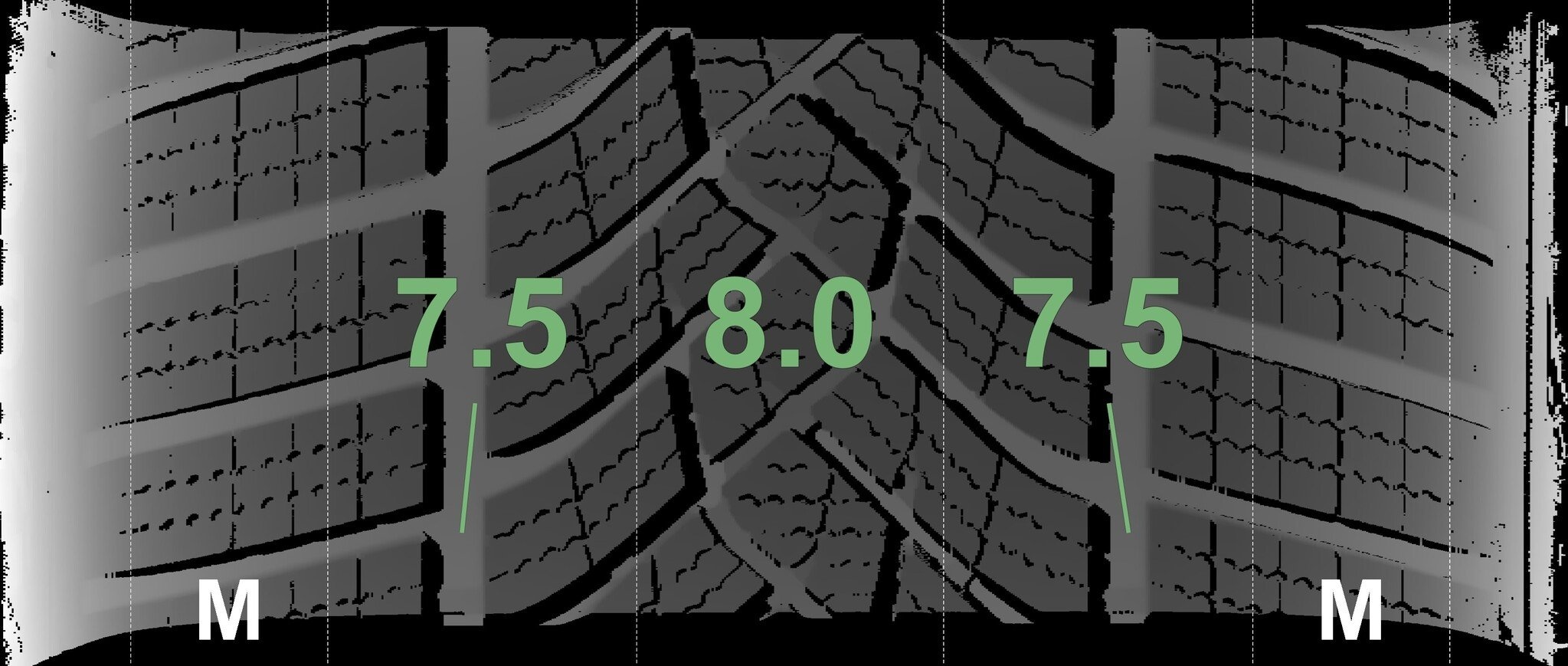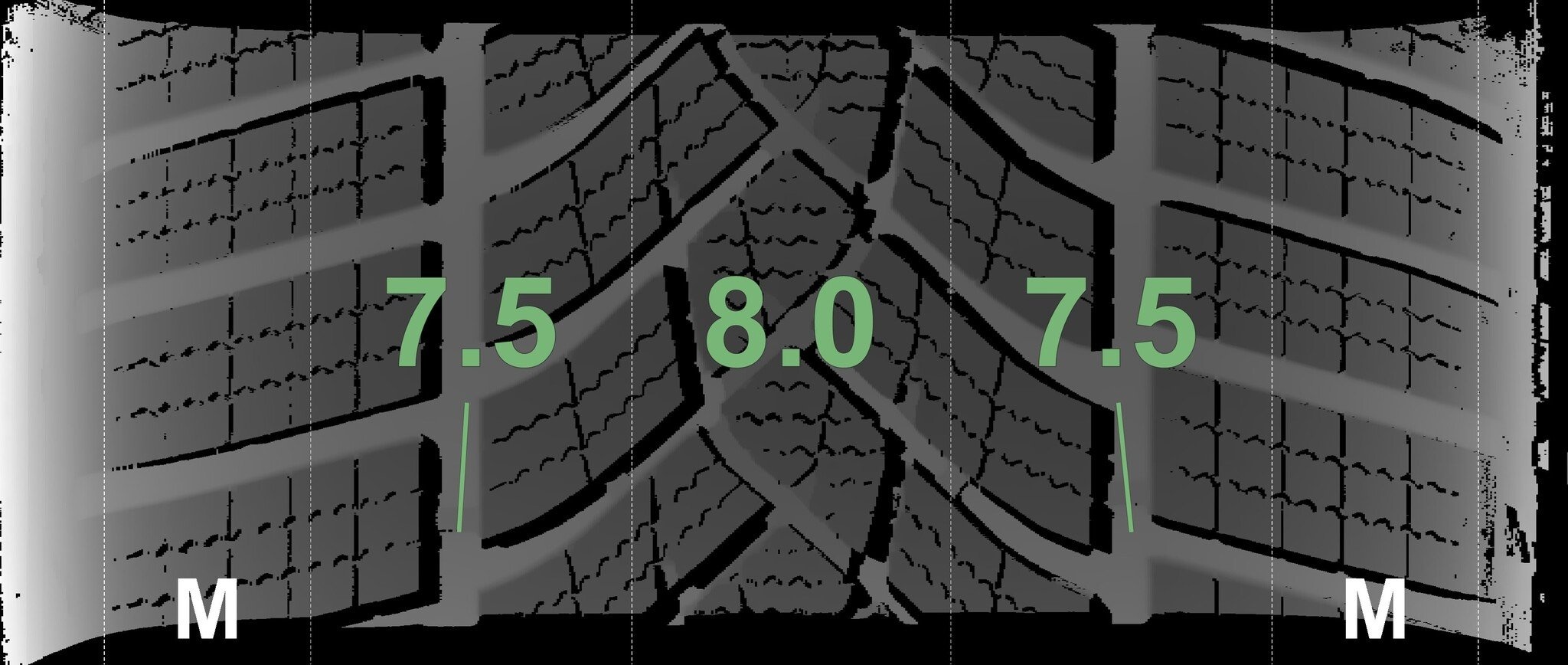 De gemeten profieldieptes en de details van de velgen zijn hierboven weergegeven.