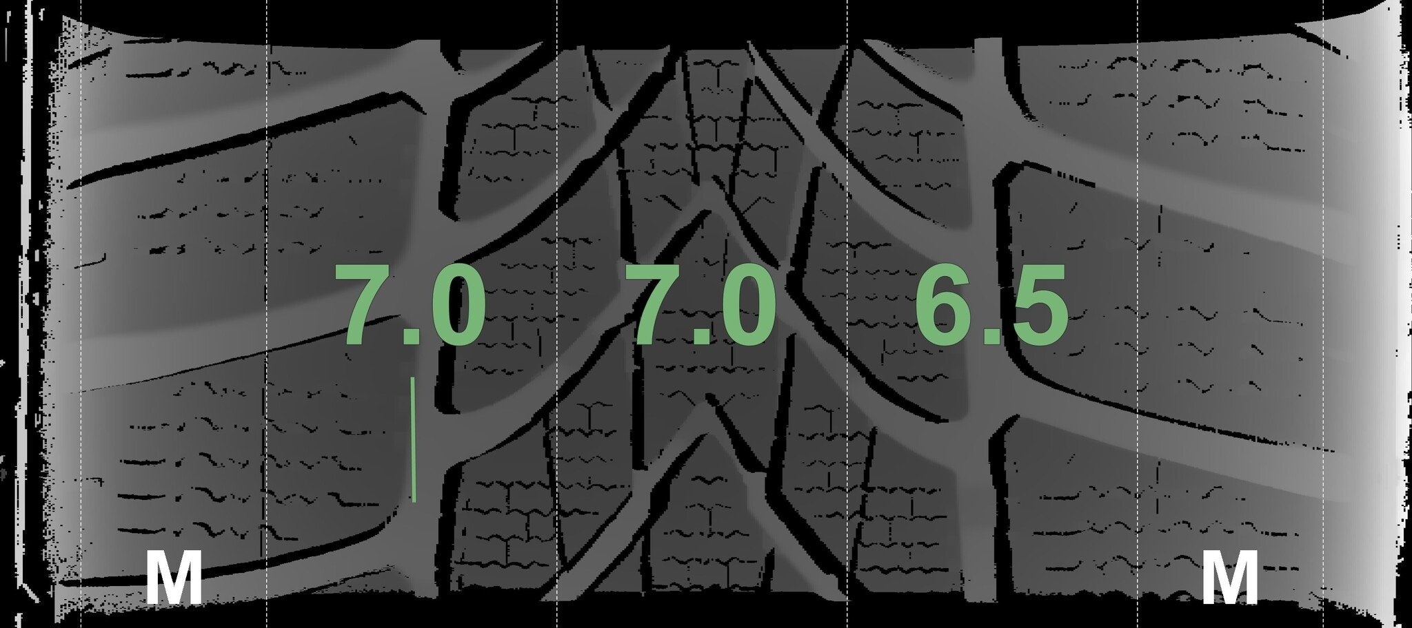De gemeten profieldieptes en de details van de velgen zijn hierboven weergegeven.