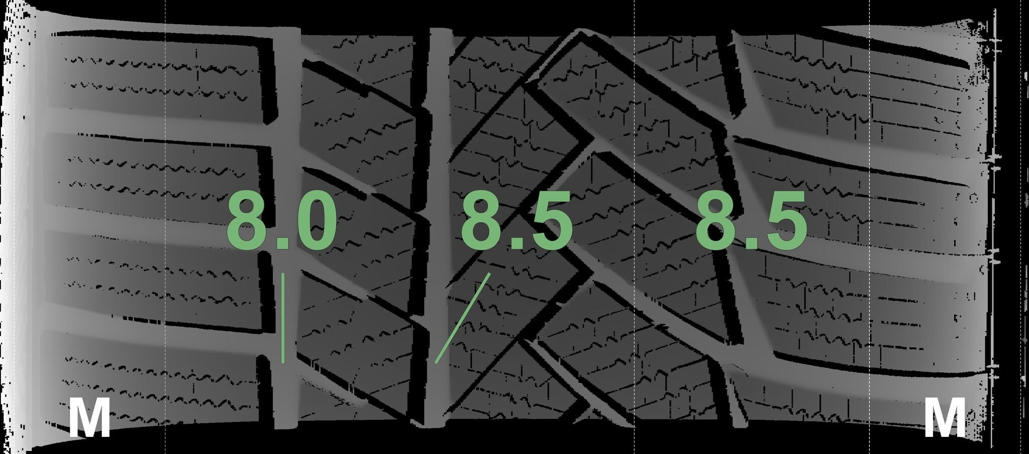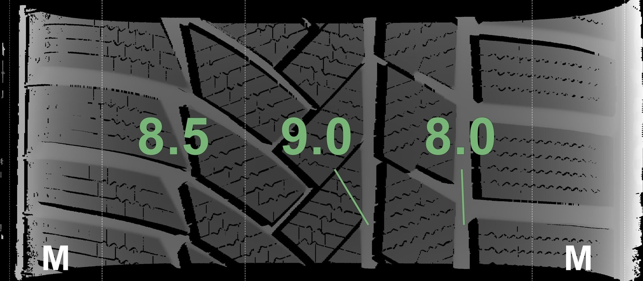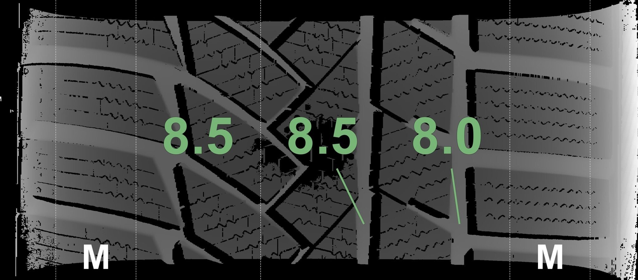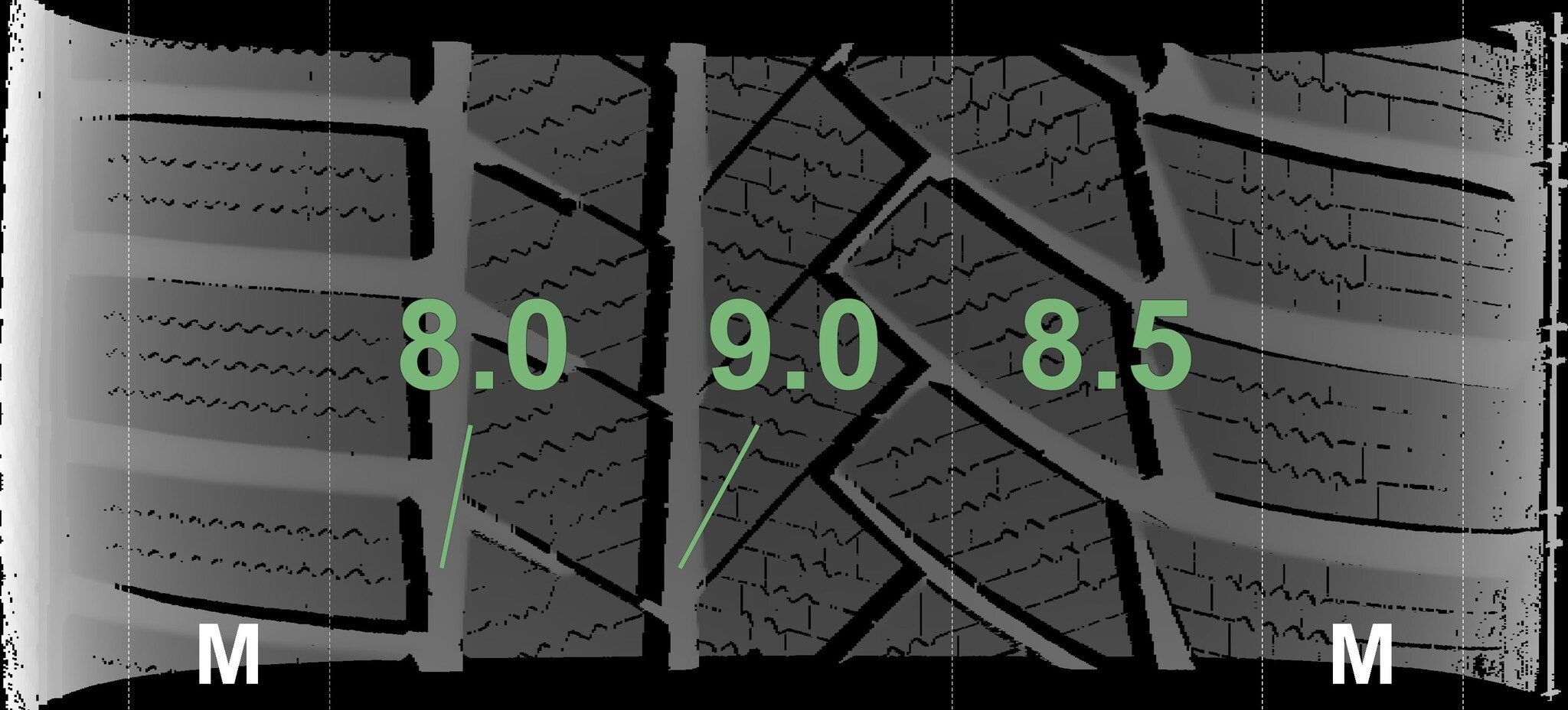 De gemeten profieldieptes en de details van de velgen zijn hierboven weergegeven.