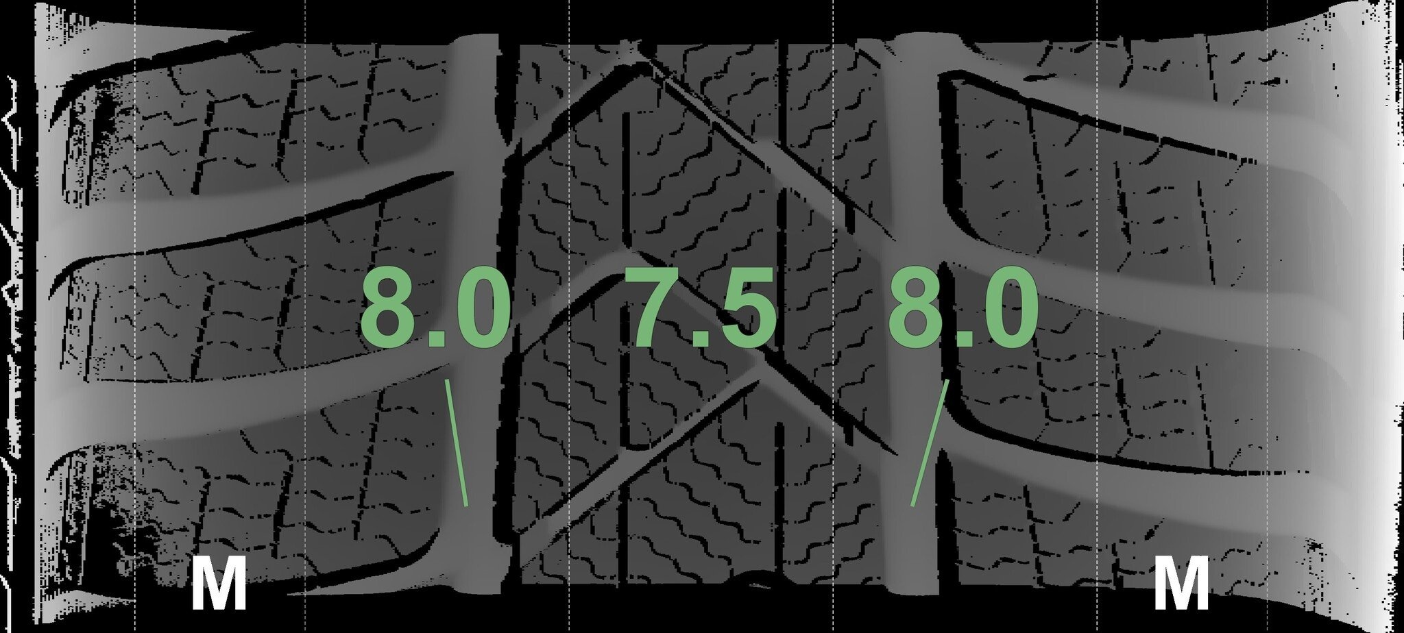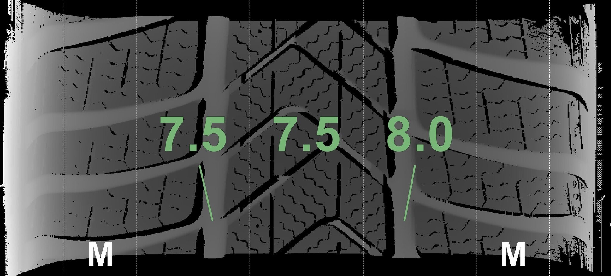 De gemeten profieldieptes en de details van de velgen zijn hierboven weergegeven.