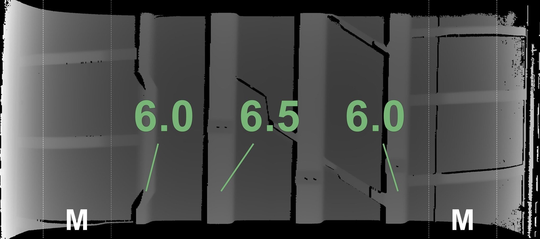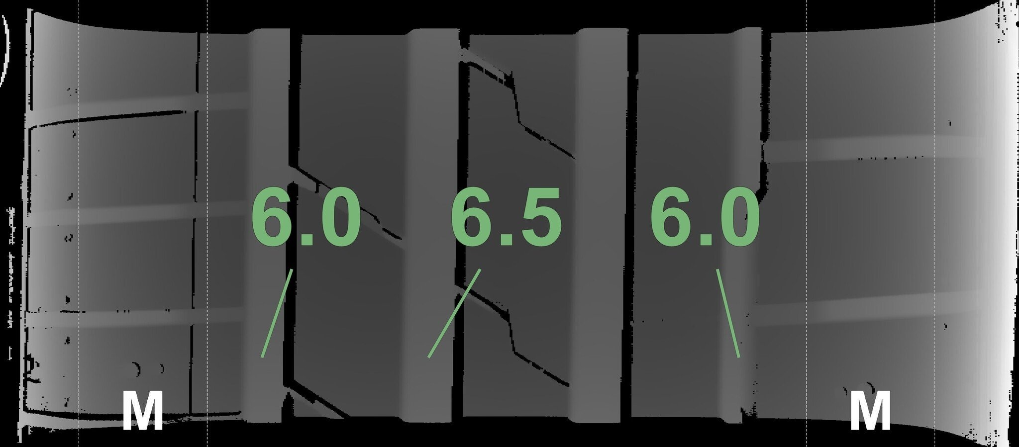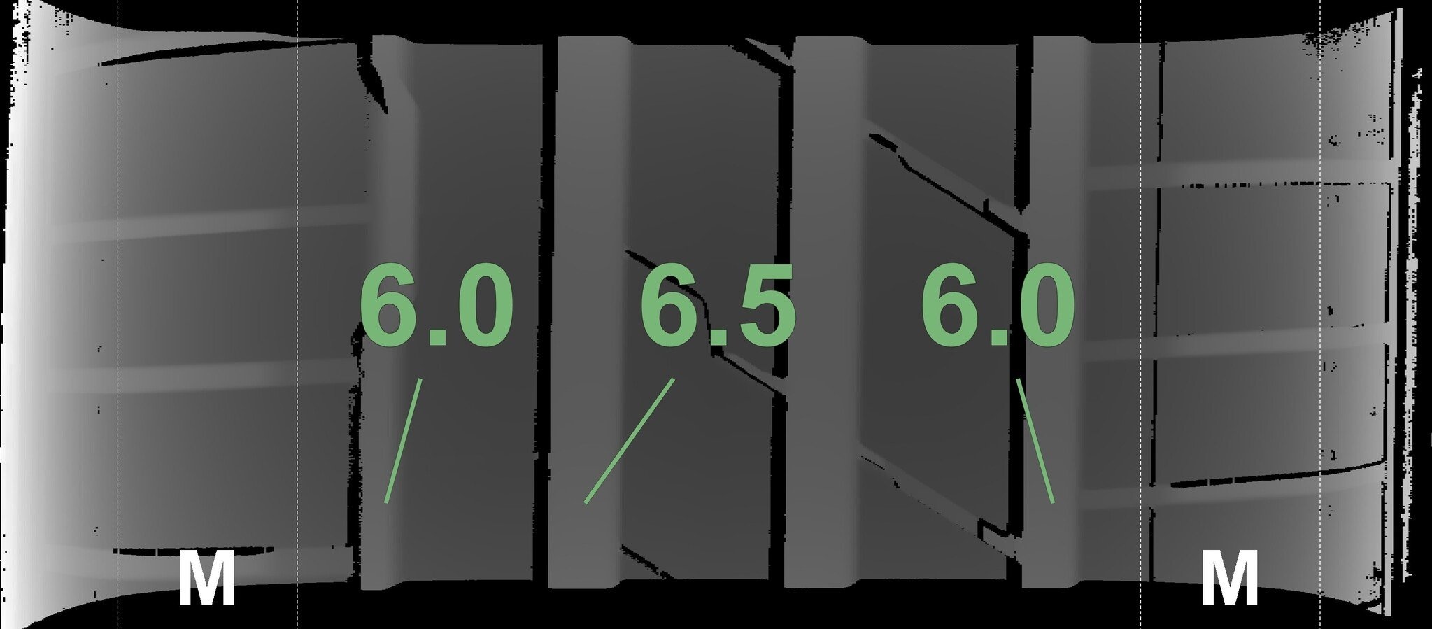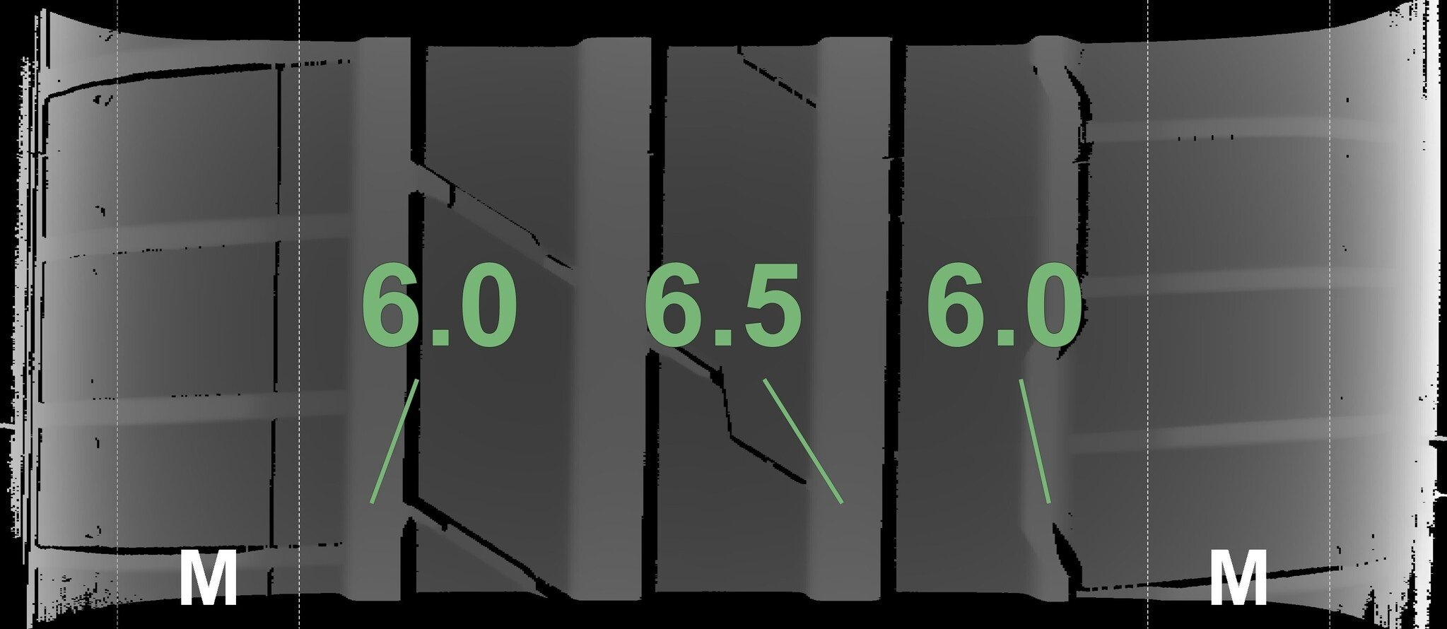 De gemeten profieldieptes en de details van de velgen zijn hierboven weergegeven.