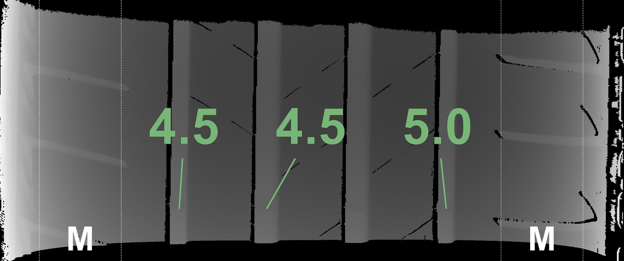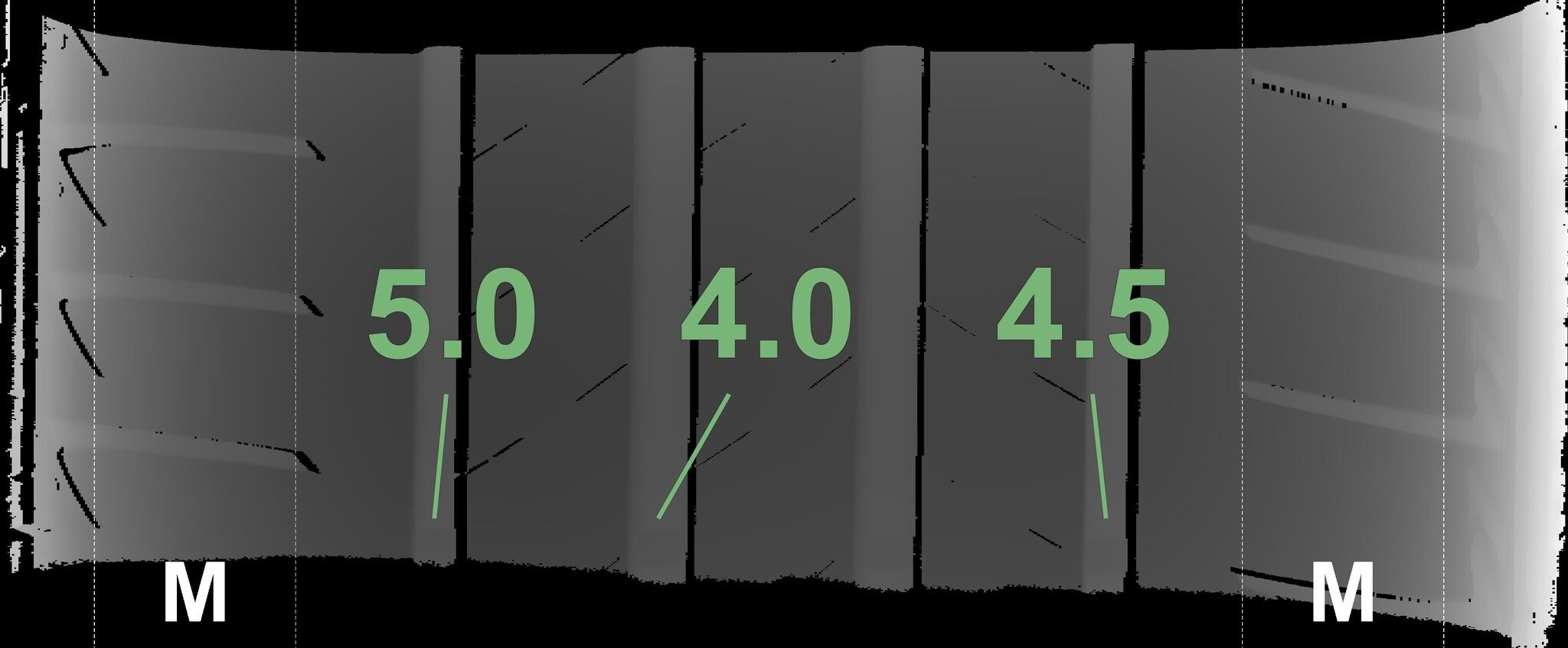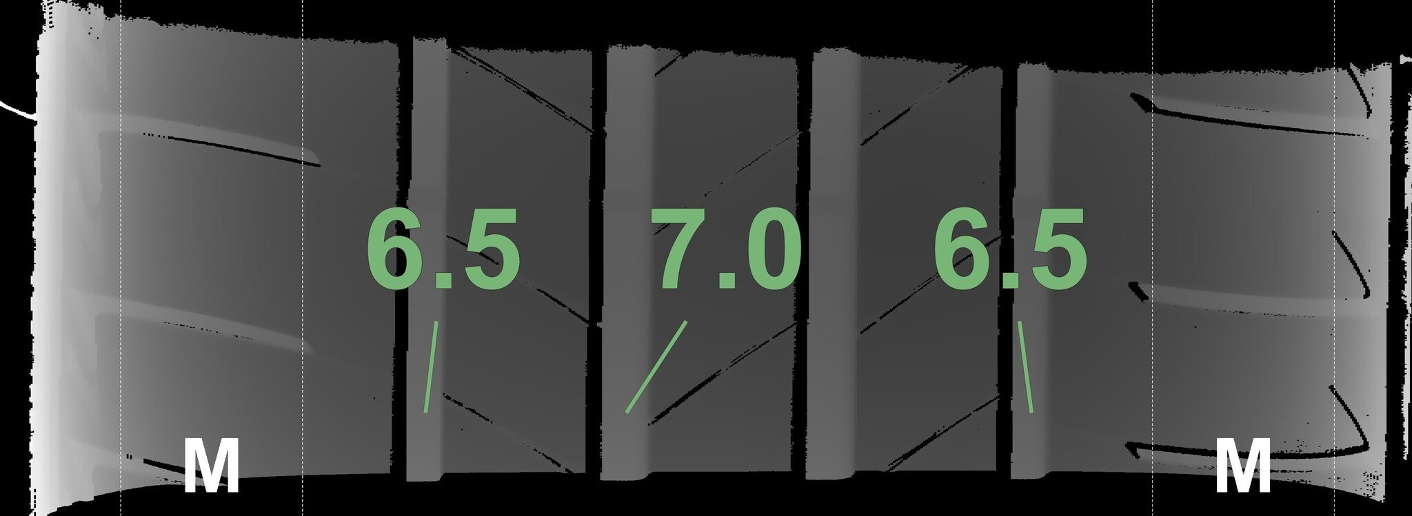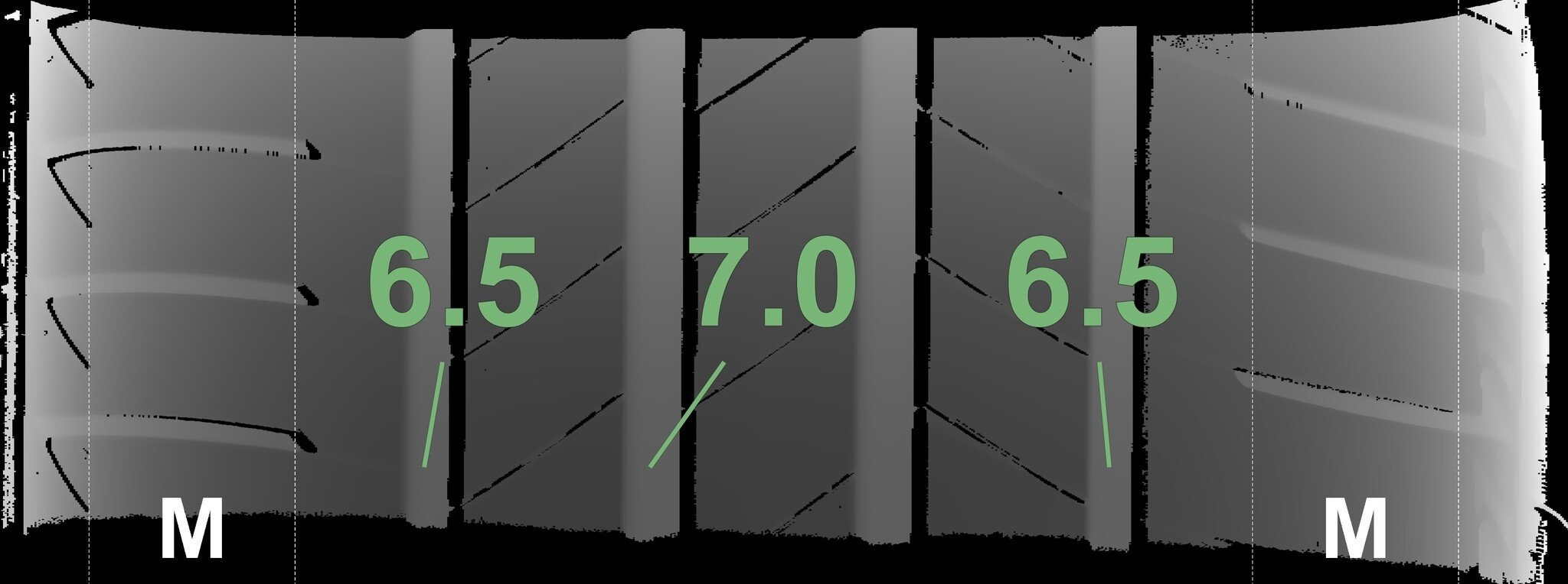 De gemeten profieldieptes en de details van de velgen zijn hierboven weergegeven.