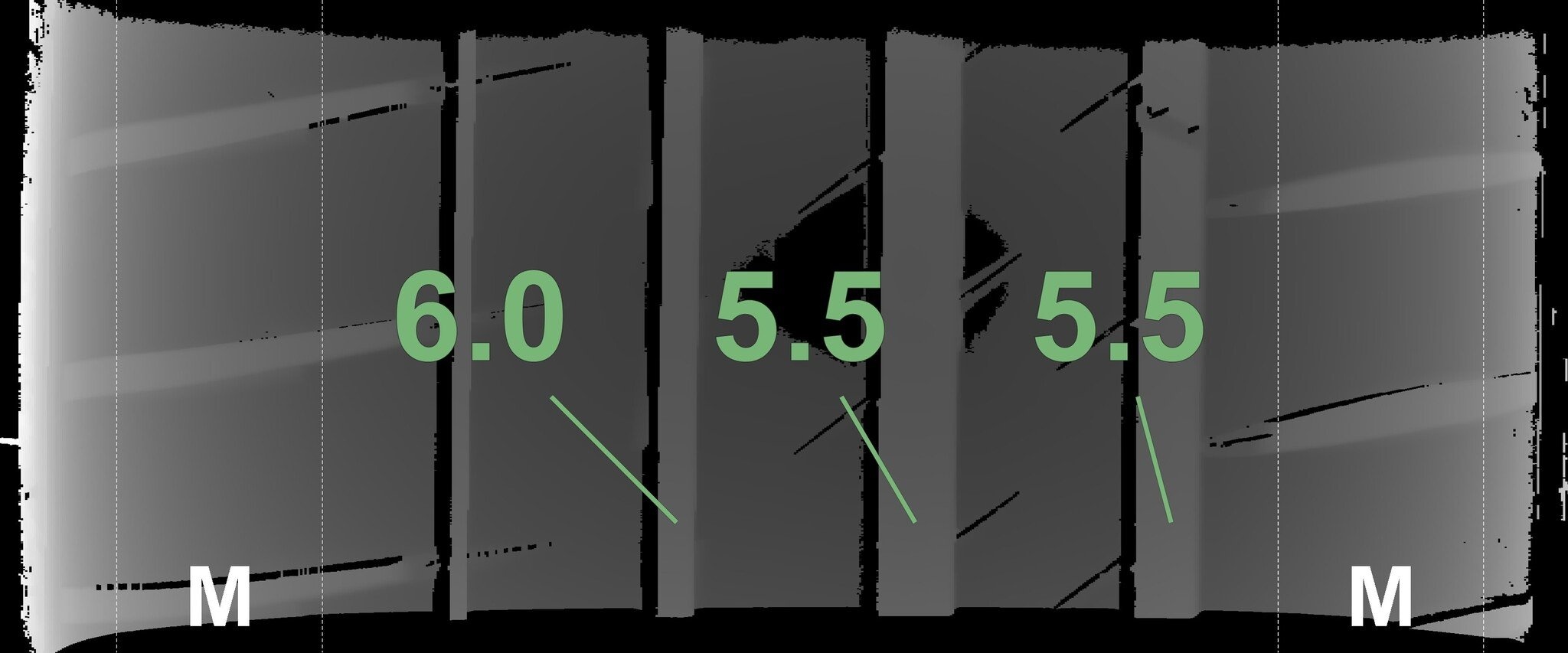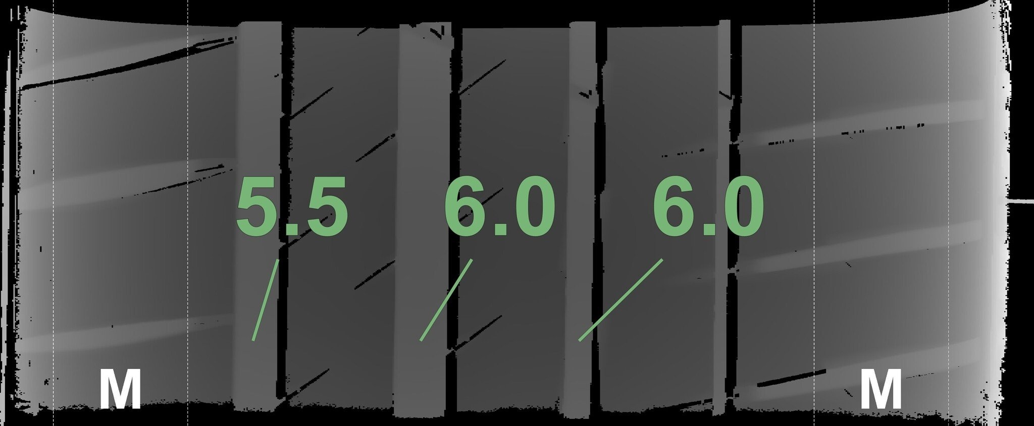 De gemeten profieldieptes en de details van de velgen zijn hierboven weergegeven.