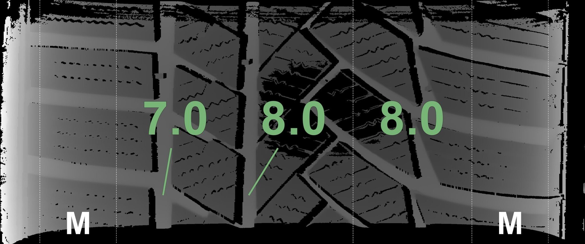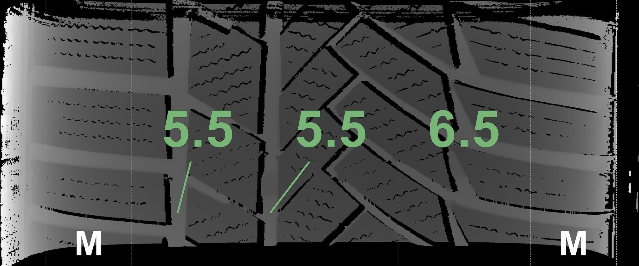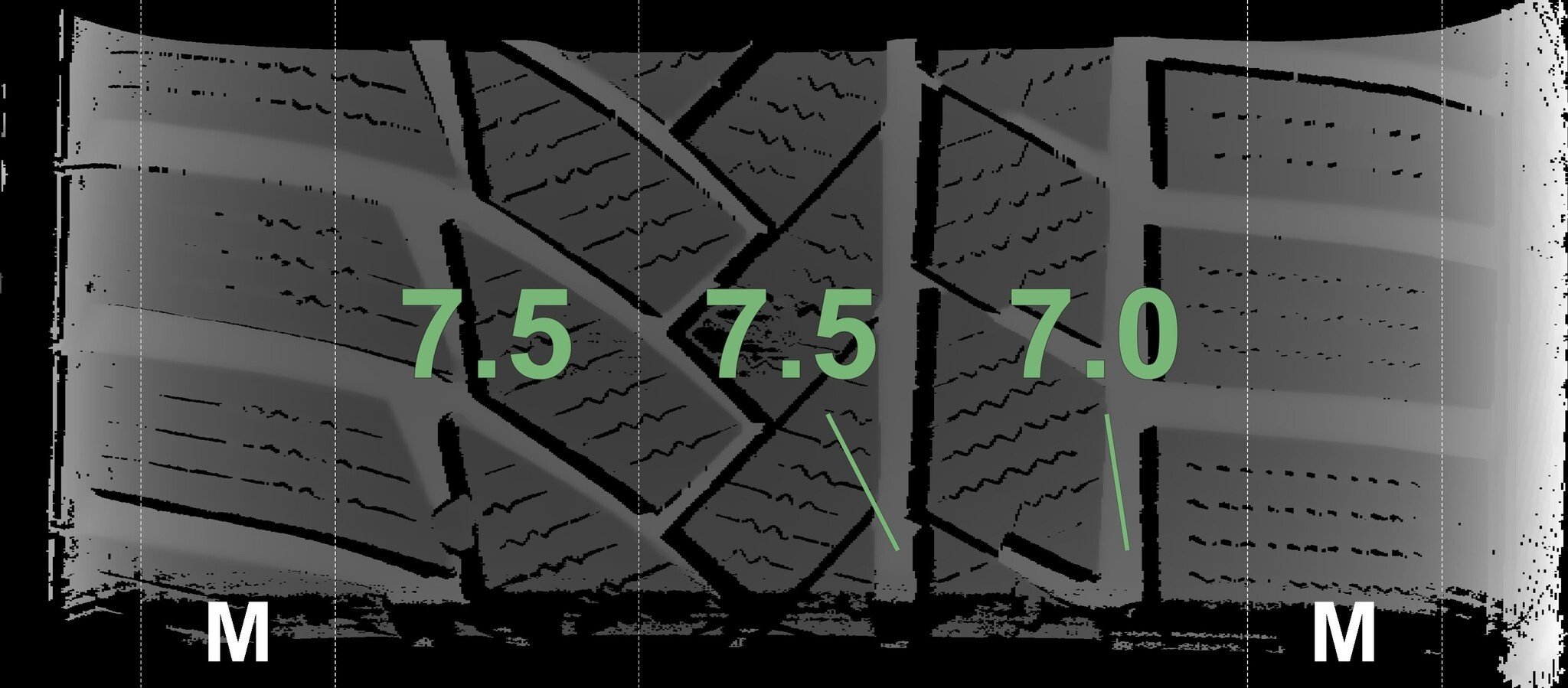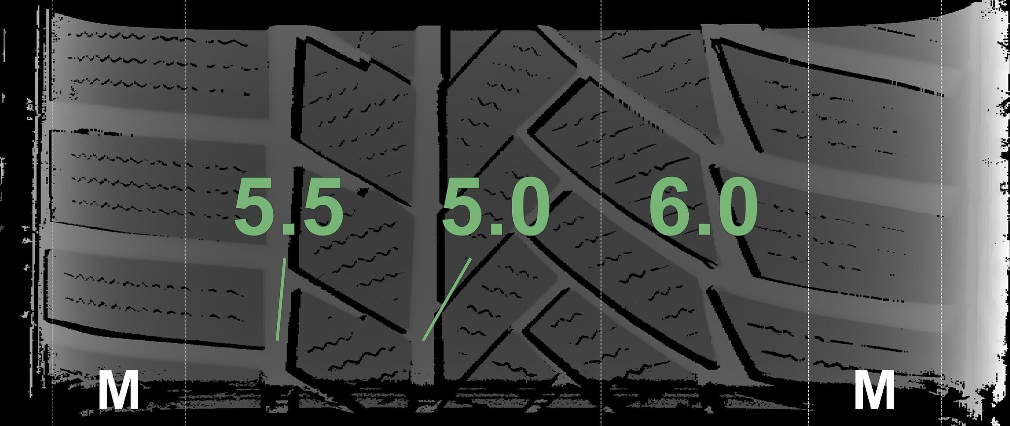 De gemeten profieldieptes en de details van de velgen zijn hierboven weergegeven.