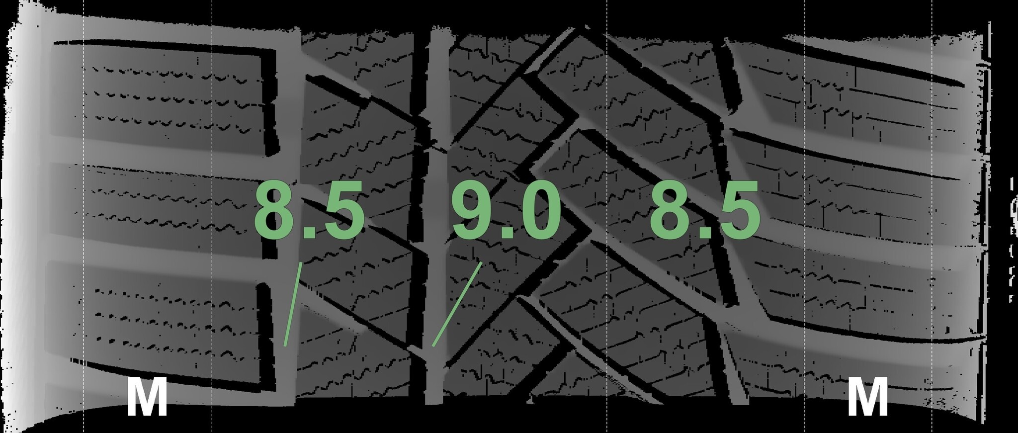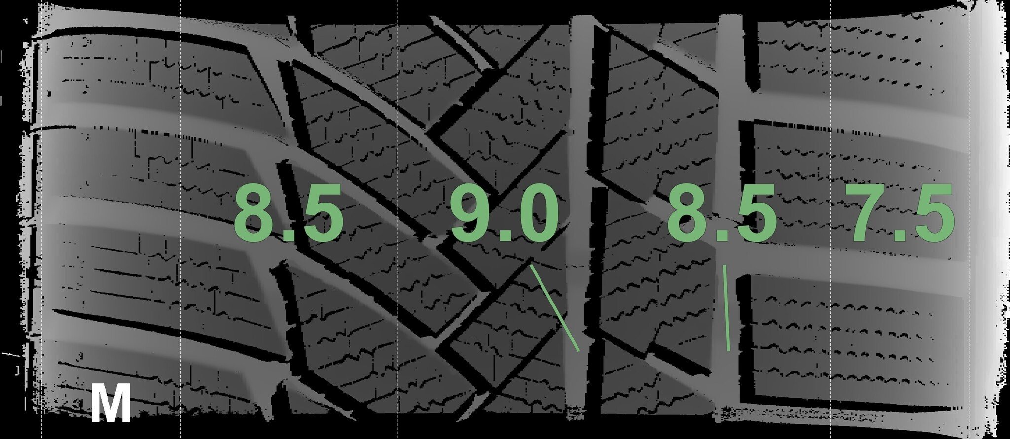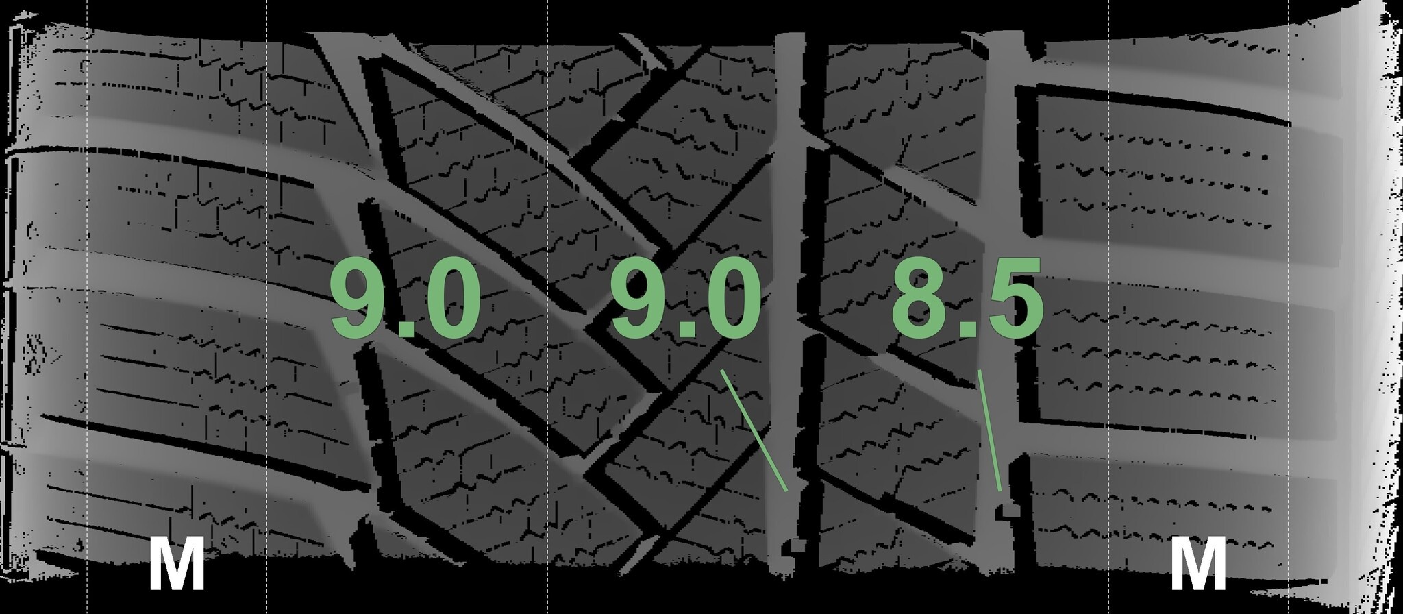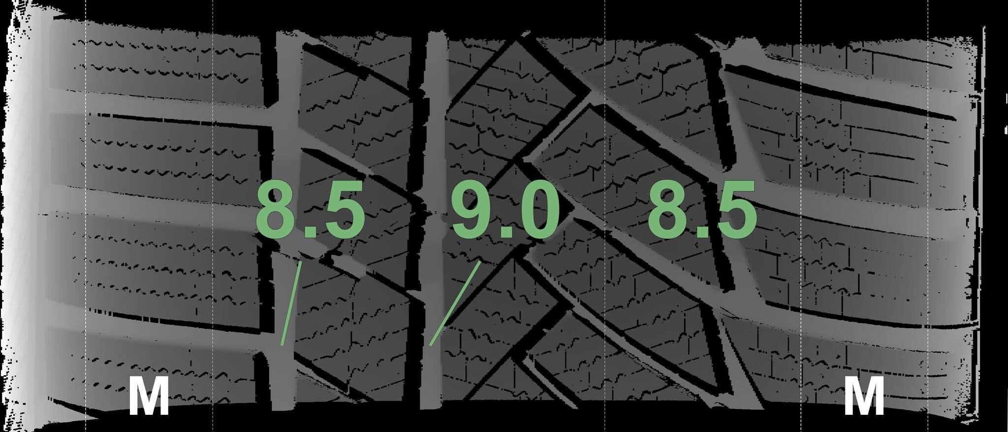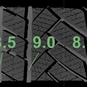 De gemeten profieldieptes en de details van de velgen zijn hierboven weergegeven.