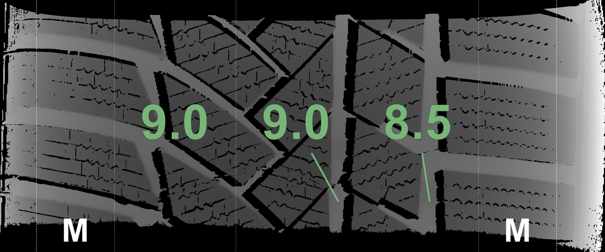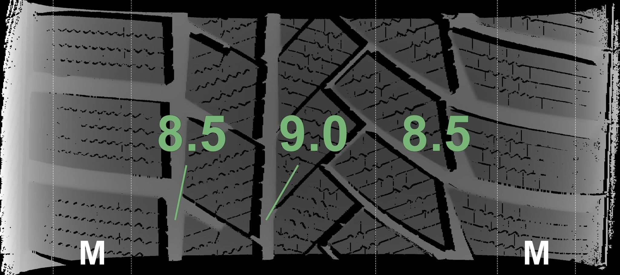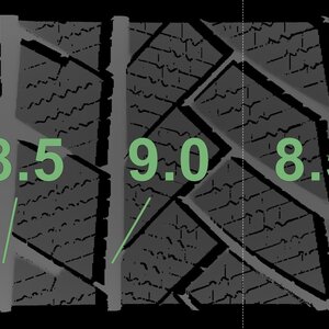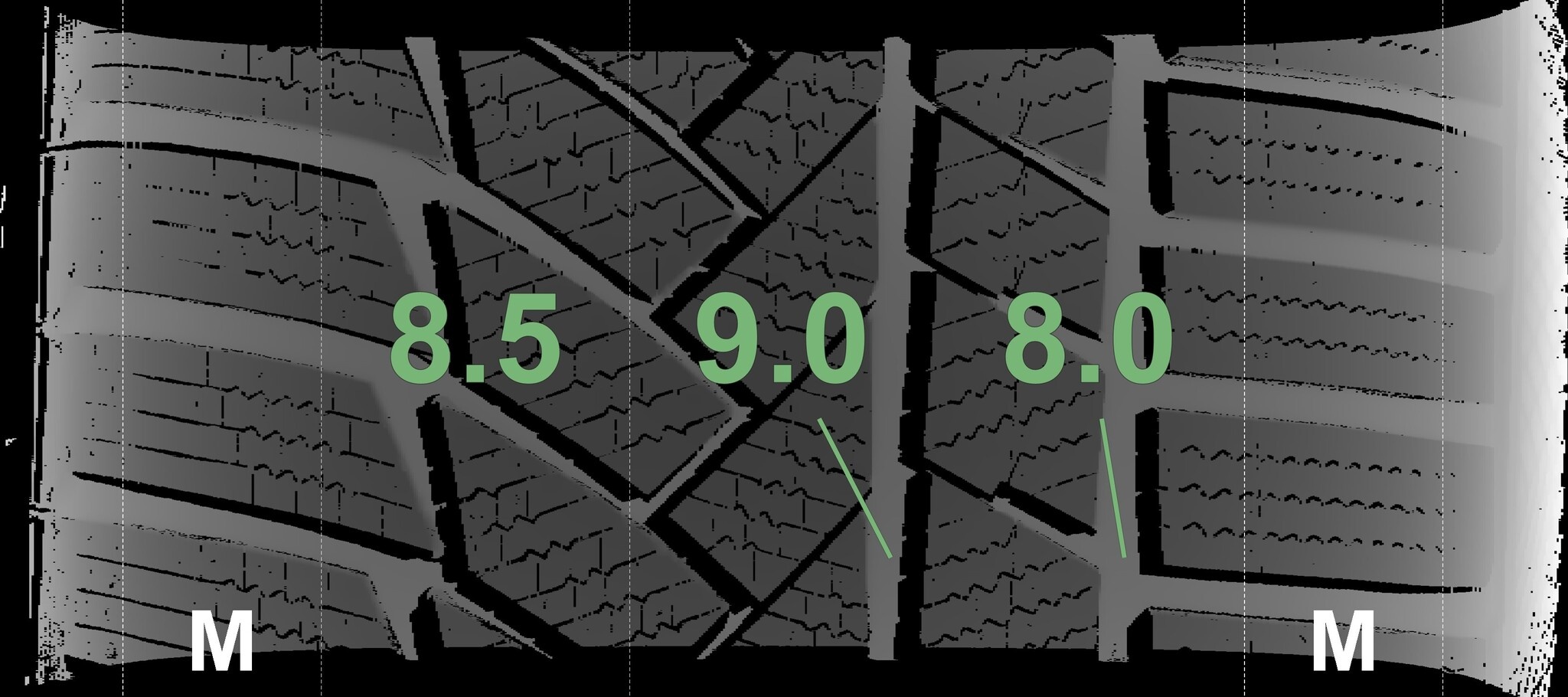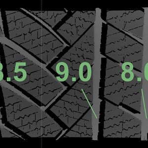 De gemeten profieldieptes en de details van de velgen zijn hierboven weergegeven.