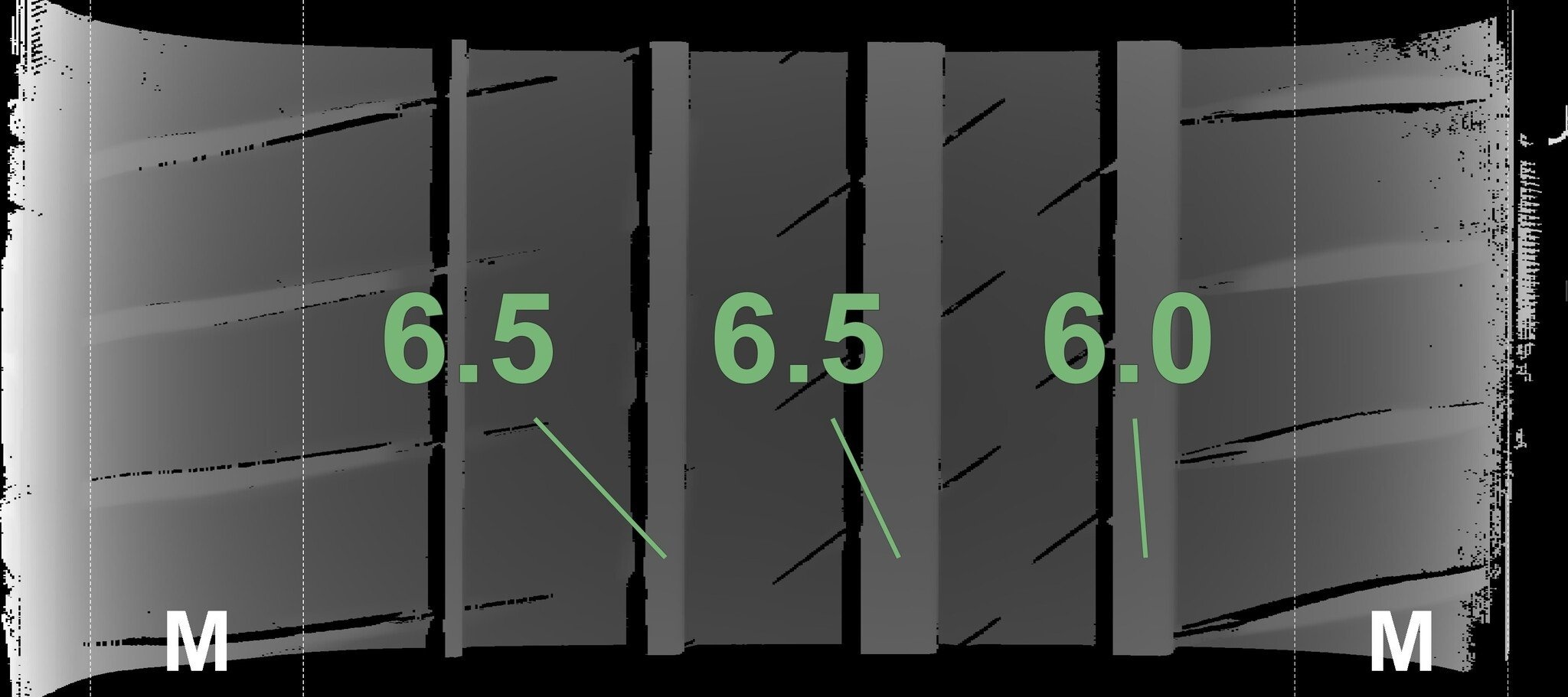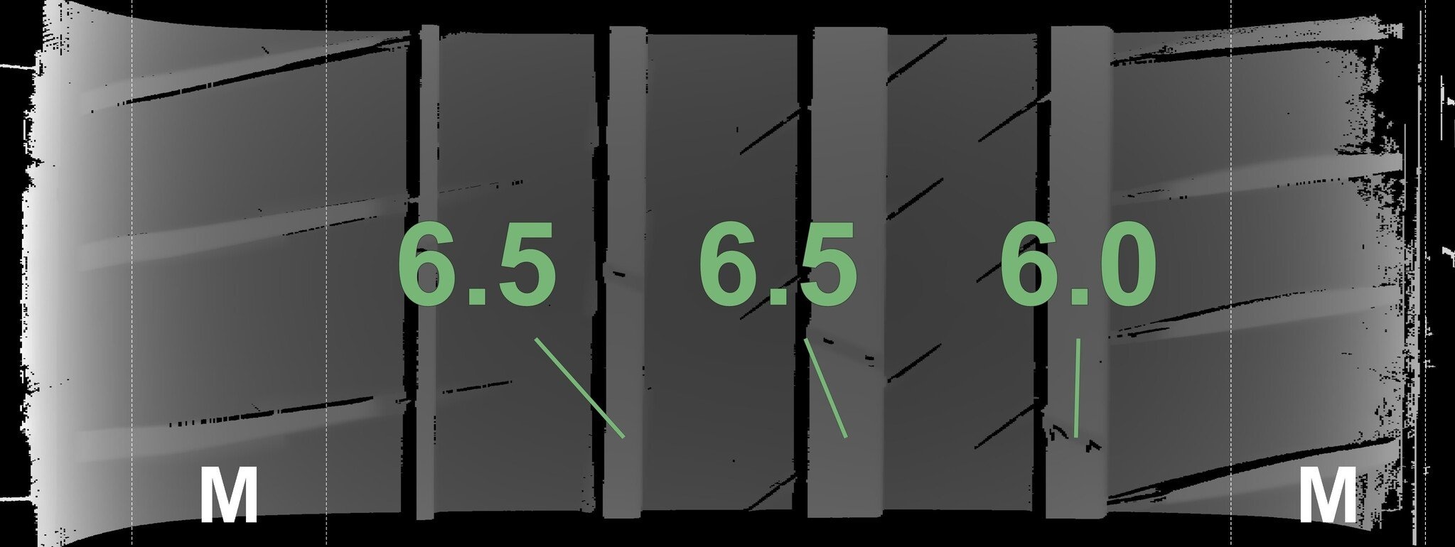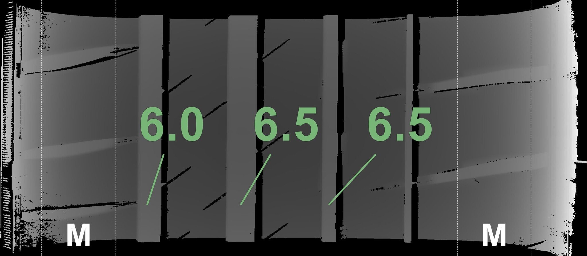 De gemeten profieldieptes en de details van de velgen zijn hierboven weergegeven.
