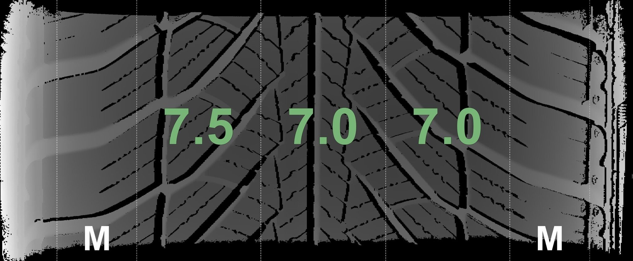 De gemeten profieldieptes en de details van de velgen zijn hierboven weergegeven.