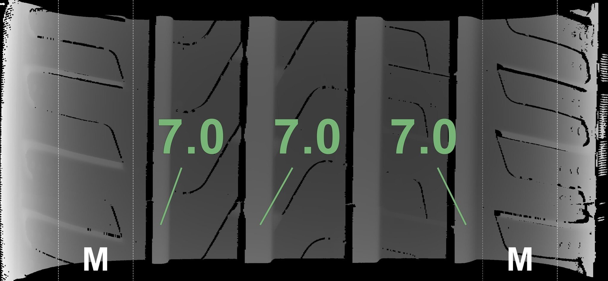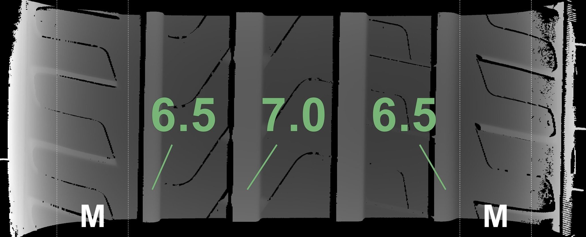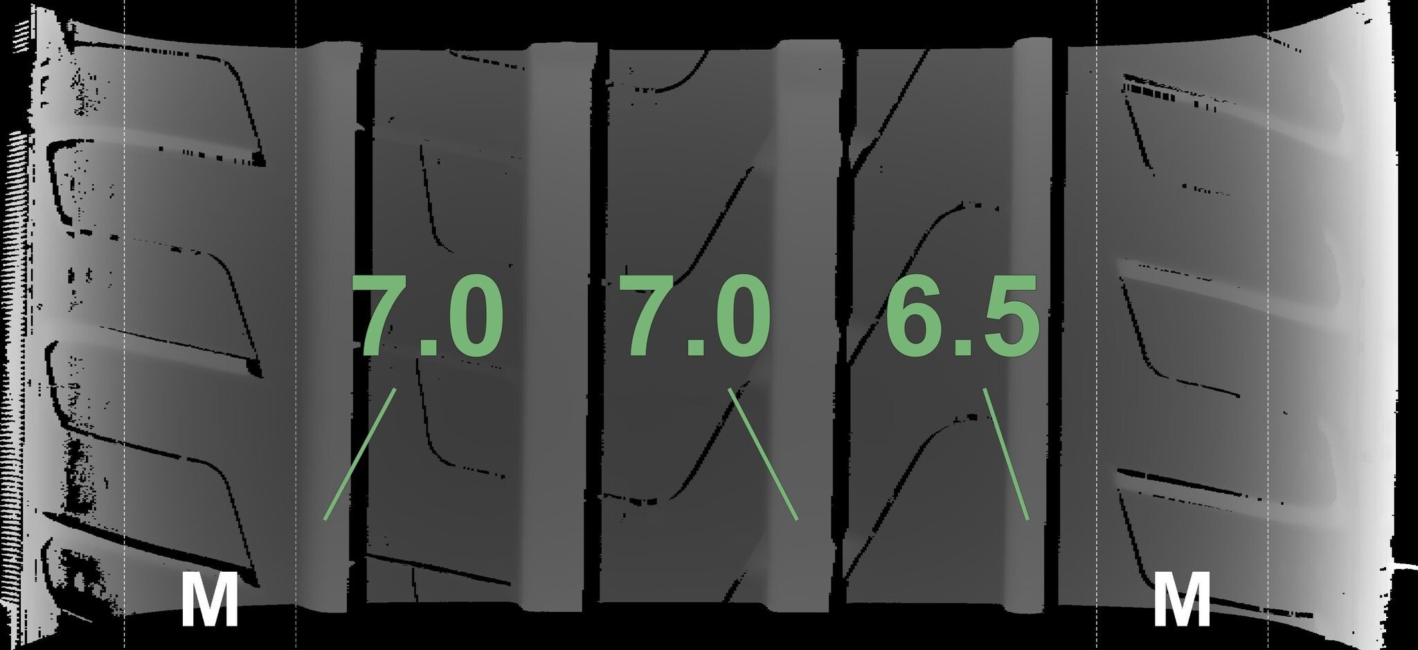 De gemeten profieldieptes en de details van de velgen zijn hierboven weergegeven.
